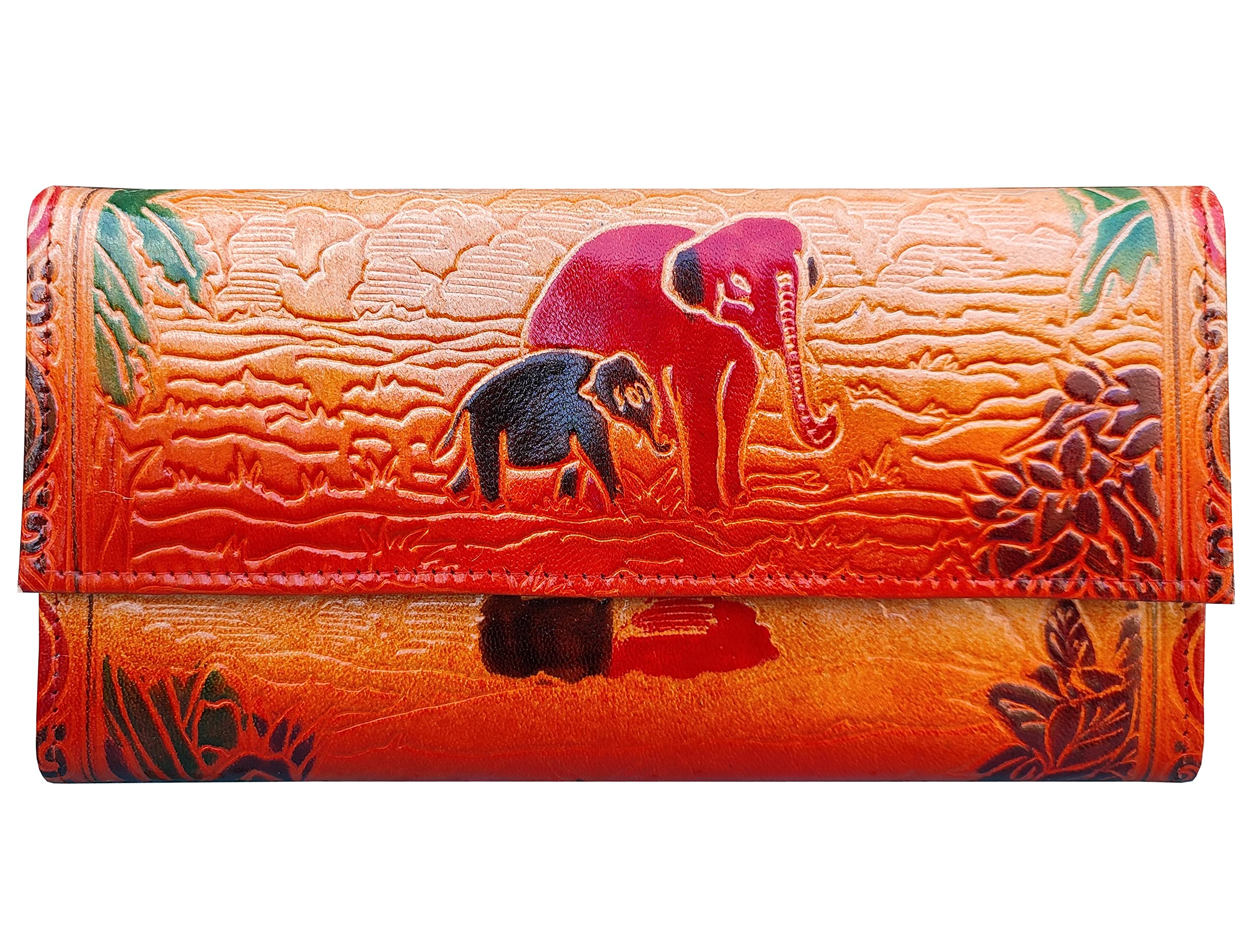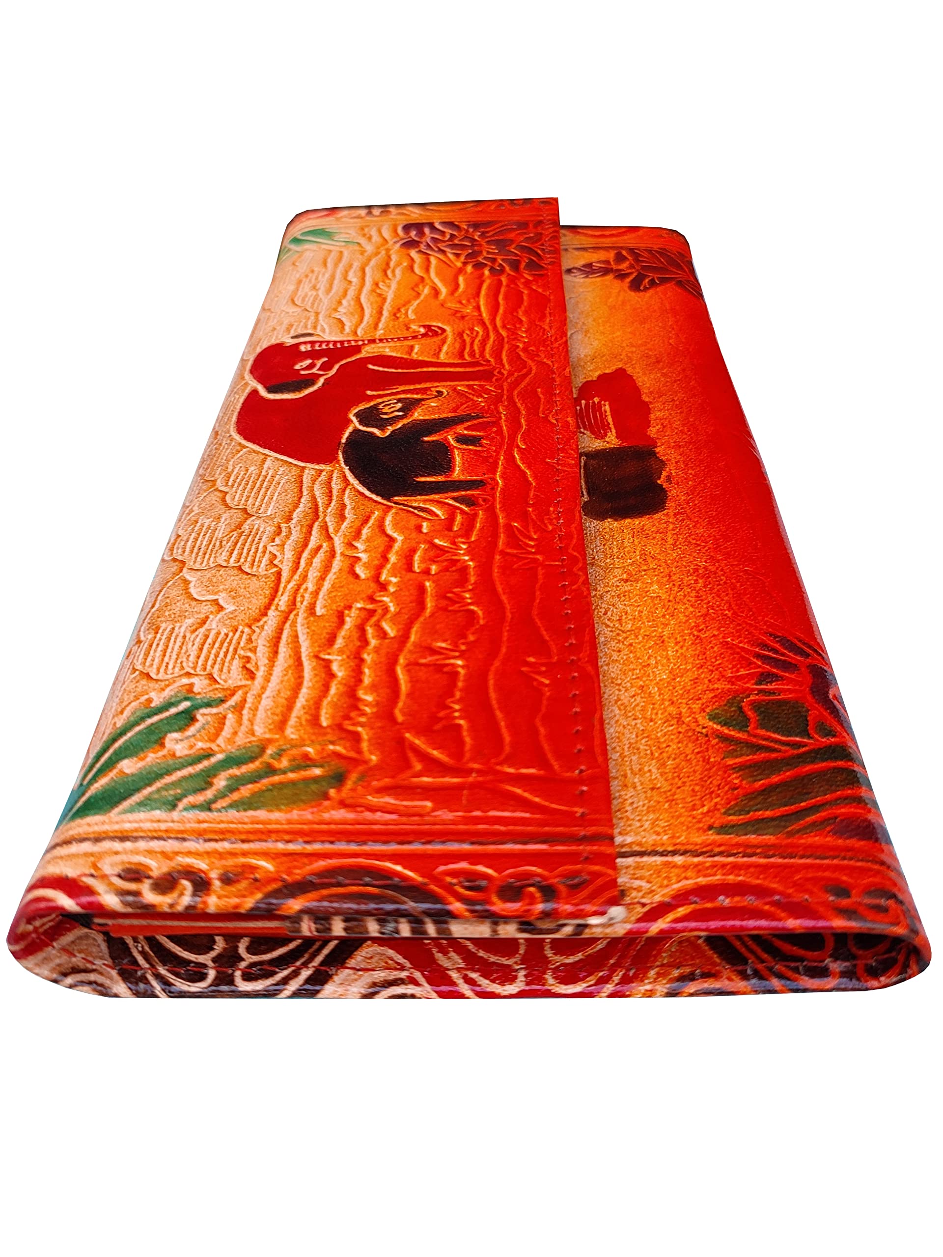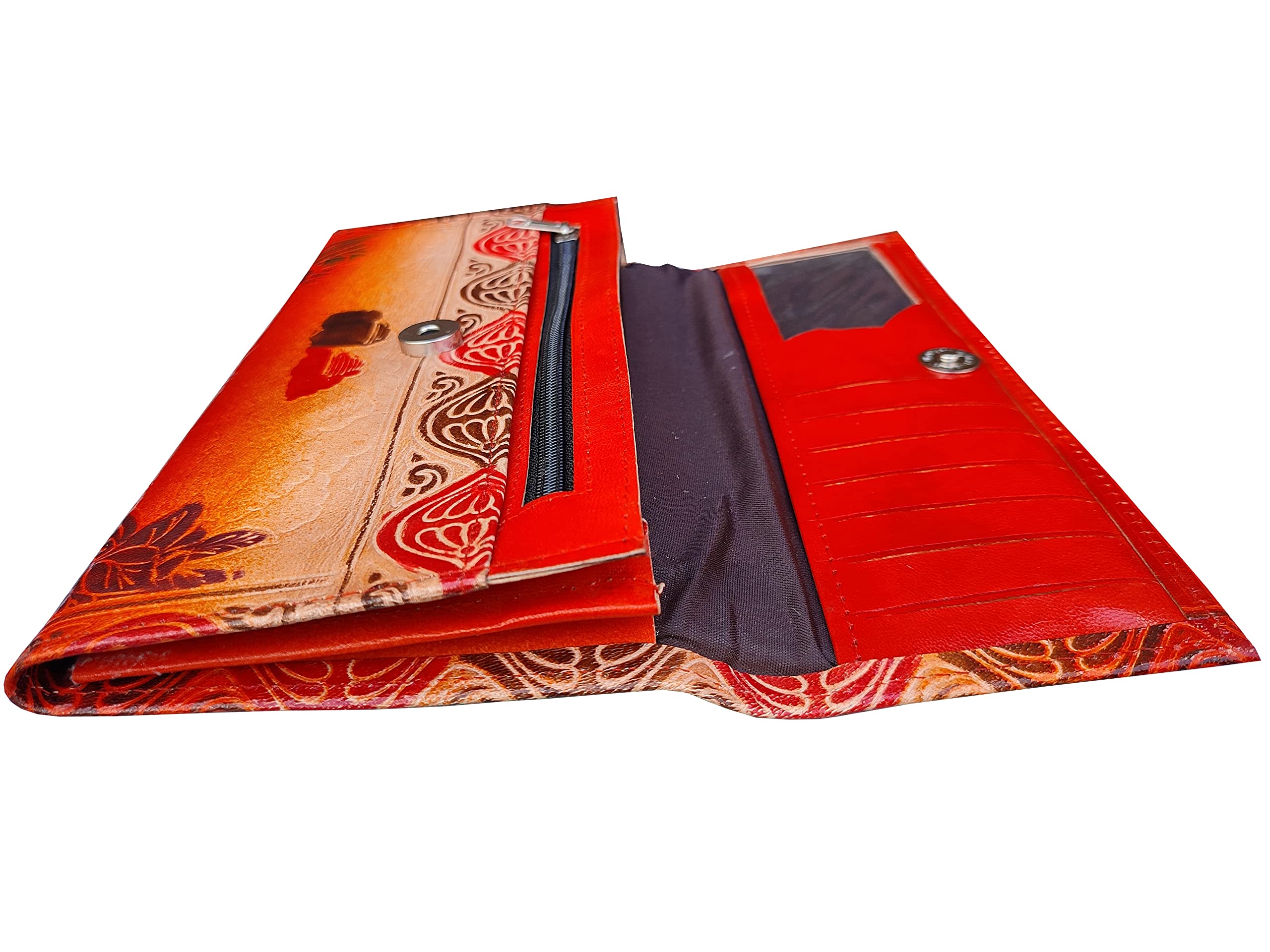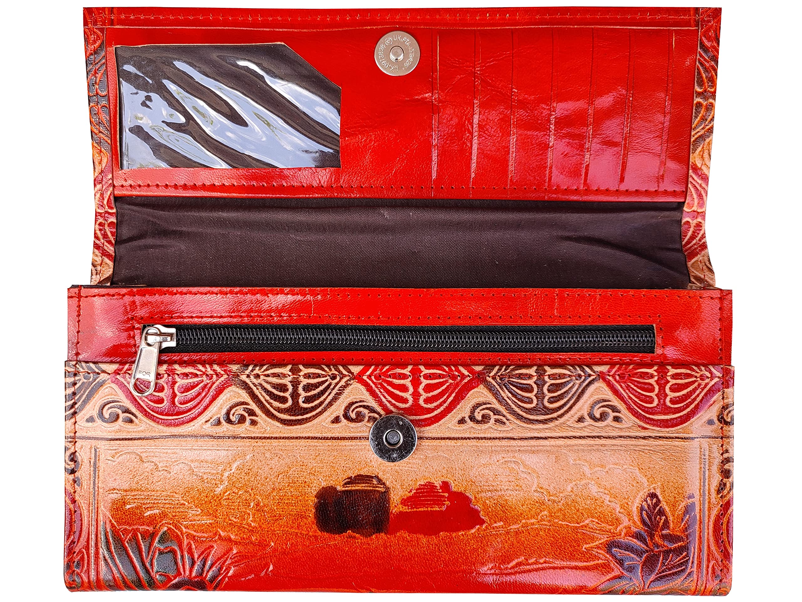 Handcrafted from Genuine Leather a Beautiful Ethnic Art of West Bengal. Design on both sides Multiple Compartments with Bank Card Holder Closure: Zip and Magnetic button. This purse is a classic example of age old Shantiniketan craft which was introduced in West Bengal India during the 1940s. The Shantiniketan style evolved as a result of the Art Movement and these products have now become world famous for their applique batik and embossed craft work. The process of burnishing the leather gives it an elegant sheen and brings out the colors. The major embossing craft is done by hand and is an intricate process. After the final leather made it is then stitched into the desired product coated with a lacquer finish for making the product shiny and long lasting. We are happy for your interest SHANTINIKETAN EMBOSSED LEATHER PRODUCTS and artist of Shantinikan thanks to you.