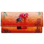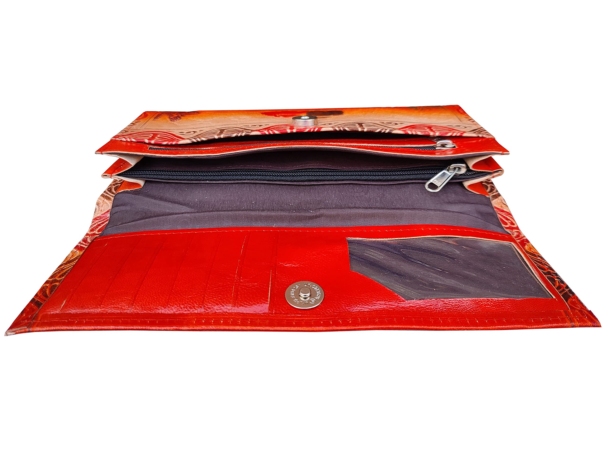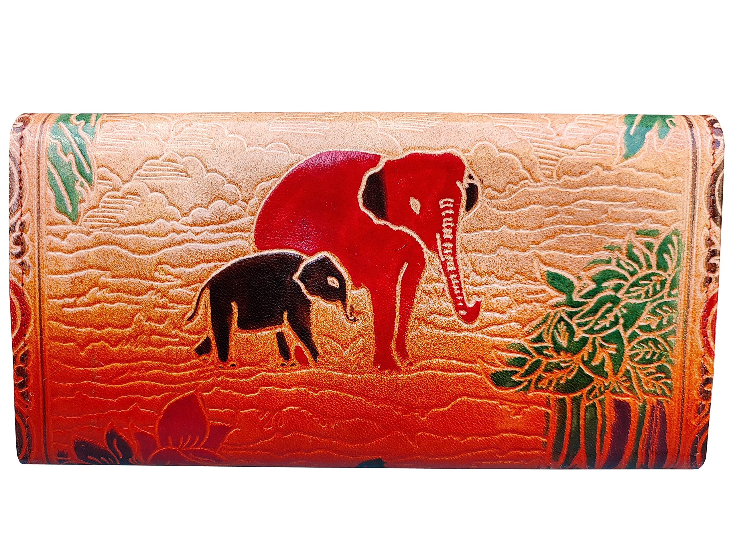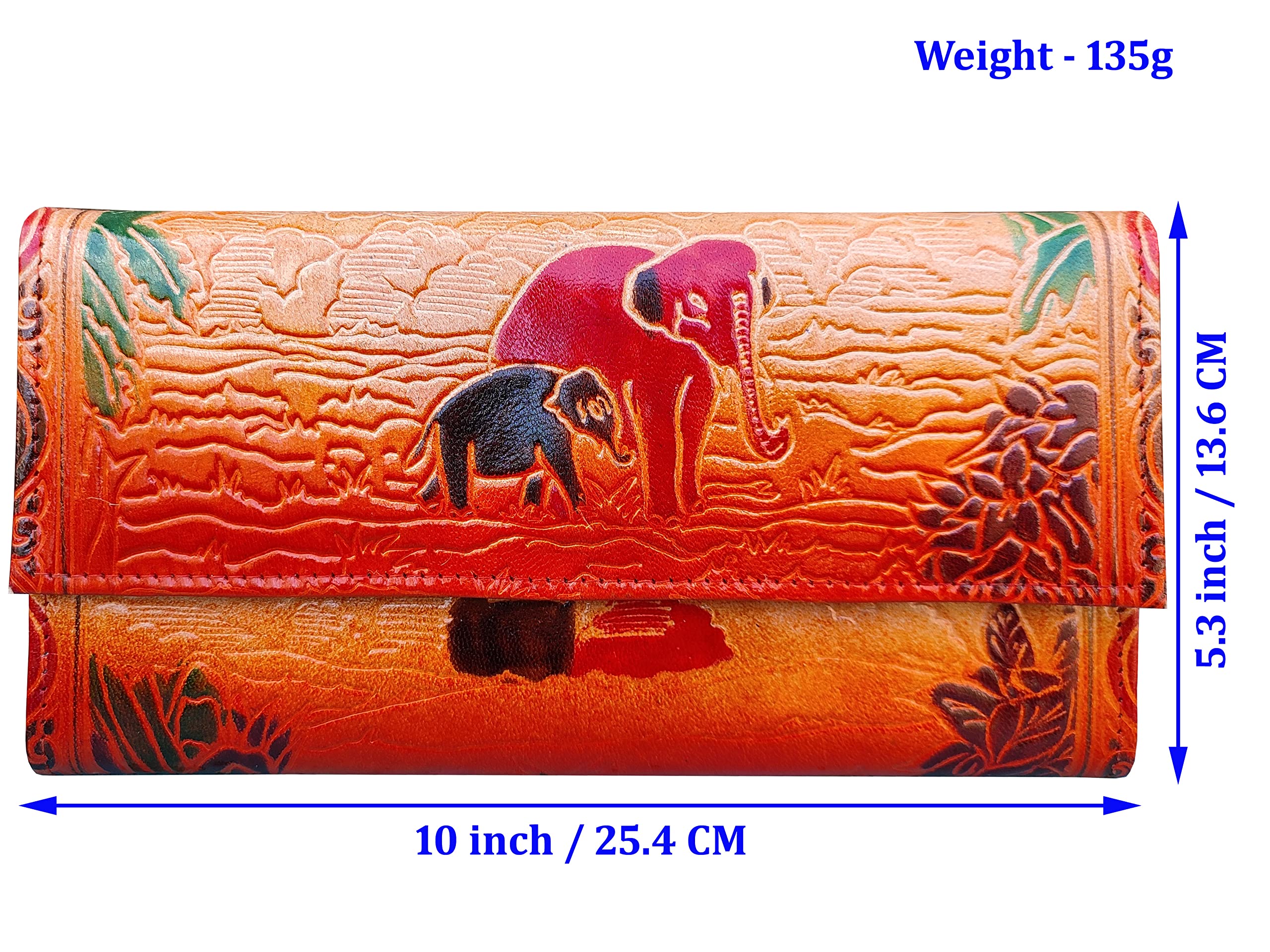 Handcrafted from Genuine Leather a Beautiful Ethnic Art of West Bengal. Design on both sides Multiple Compartments with Bank Card Holder Closure: Zip and Magnetic button. This purse is a classic example of age old Shantiniketan craft which was introduced in West Bengal India during the 1940s. The Shantiniketan style evolved as a result of the Art Movement and these products have now become world famous for their applique batik and embossed craft work. The process of burnishing the leather gives it an elegant sheen and brings out the colors. The major embossing craft is done by hand and is an intricate process. After the final leather made it is then stitched into the desired product coated with a lacquer finish for making the product shiny and long lasting. We are happy for your interest SHANTINIKETAN EMBOSSED LEATHER PRODUCTS and artist of Shantinikan thanks to you.