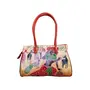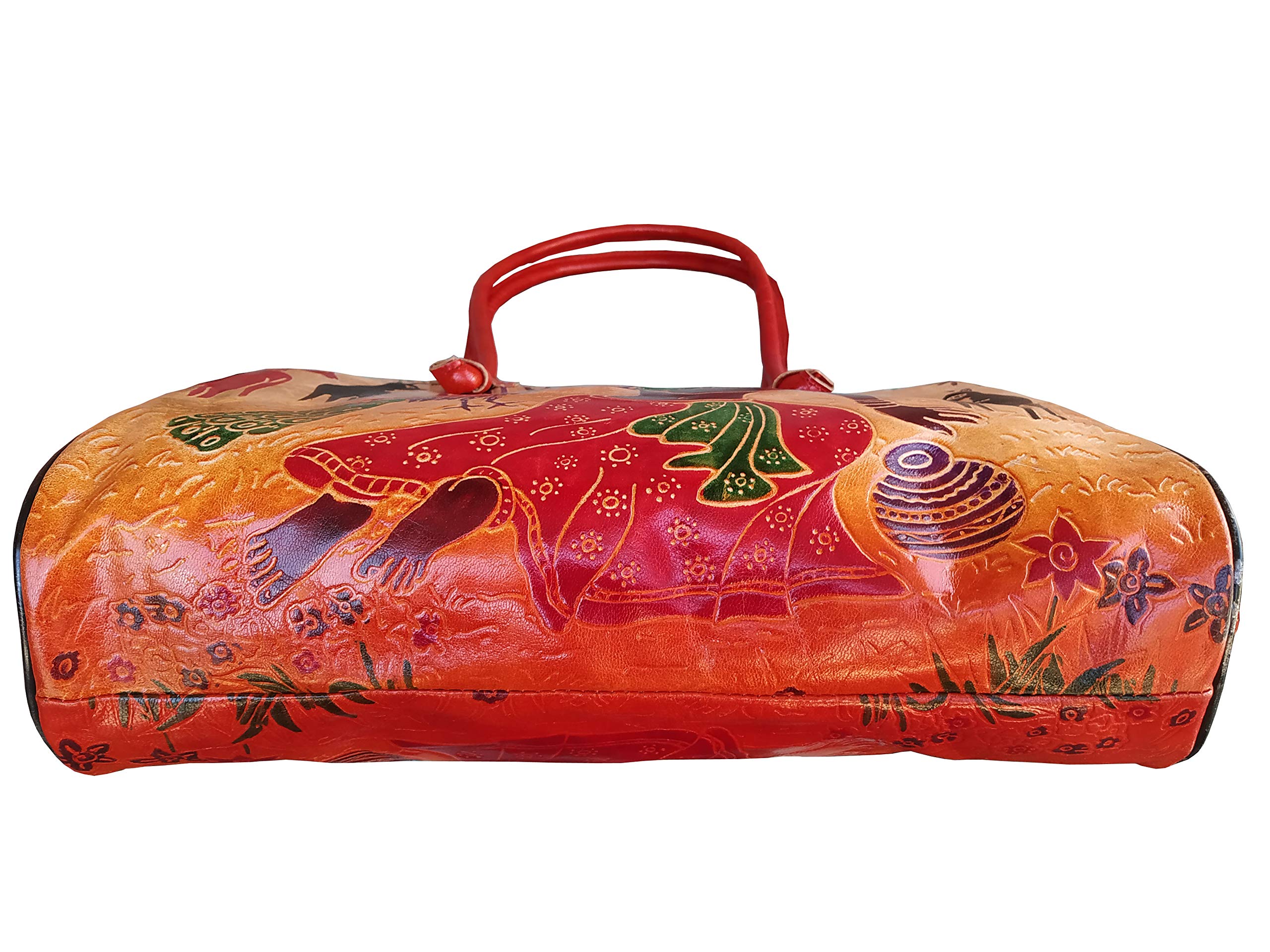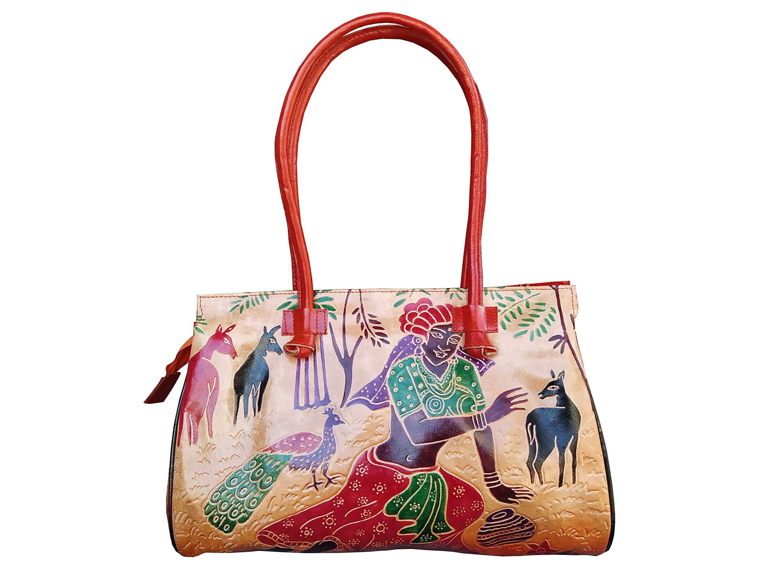 Handcrafted from 100% Genuine Leather a Beautiful Ethnic Art of West Bengal.Design on Both Sides Double Shoulder Tote Handle One Main Zipper compartment One Zipper pocket in Back and Three Compartments inside Two zipper and One open cell phone compartment.Closes fully with zip. Traditional Block print. This purse is a classic example of age old Shantiniketan craft which was introduced in West Bengal India during the 1940s. The traditional motifs used for these Shantiniketan bags depict the rich cultural heritage of India. It derives its name from the place where it was first introduced - Shantiniketan and was patronized by Nobel Laureate Rabindra Nath Tagore who revived a number of crafts that were nearing redundancy in Shantiniketan.The Shantiniketan style evolved as a result of the Art Movement and these products have now become world famous for their applique batik and embossed craft work. The process of burnishing the leather gives it an elegant sheen and brings out the colors. The major embossing craft is done by hand and is an intricate process. After the final leather made it is then stitched into the desired product coated with a lacquer finish for making the product shiny and long lasting.