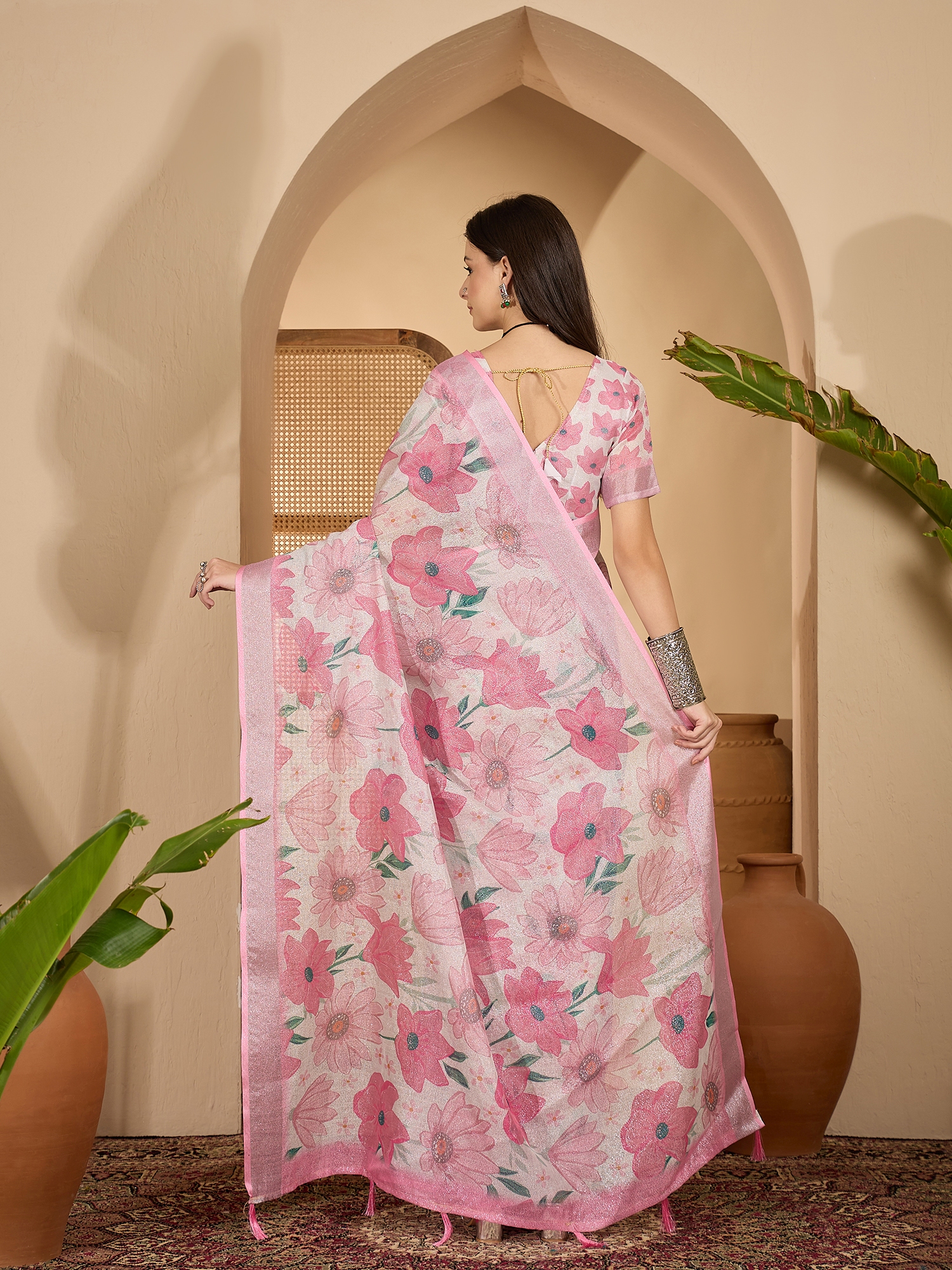AASTHA FASHION Fashion Dream Womens Baby Pink Linen Zari Silver Saree | Soft & Elegant Traditional Wear