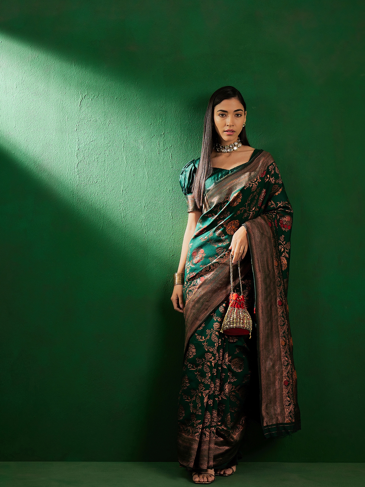 AASTHA FASHION Fashion Dream Womens Bottle Green Banarasi Silk Saree | Soft & Elegant Traditional Wear