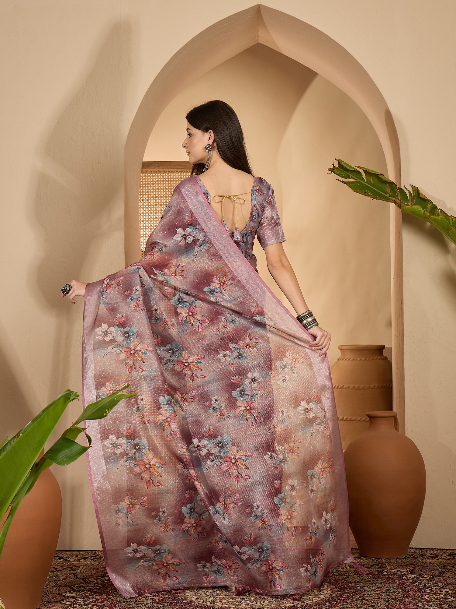 AASTHA FASHION Fashion Dream Womens Dusty Pink Linen Zari Gold Saree | Soft & Elegant Traditional Wear