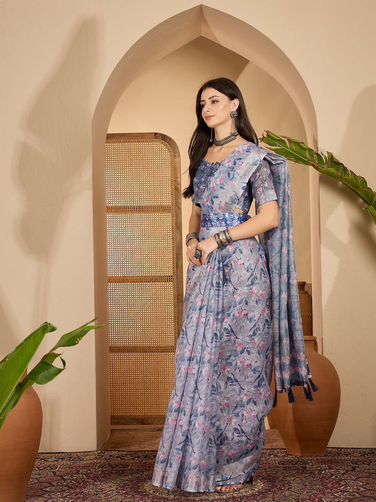 • Saree Work-Digital Print ,Blouse Work- Linen Zari Silver