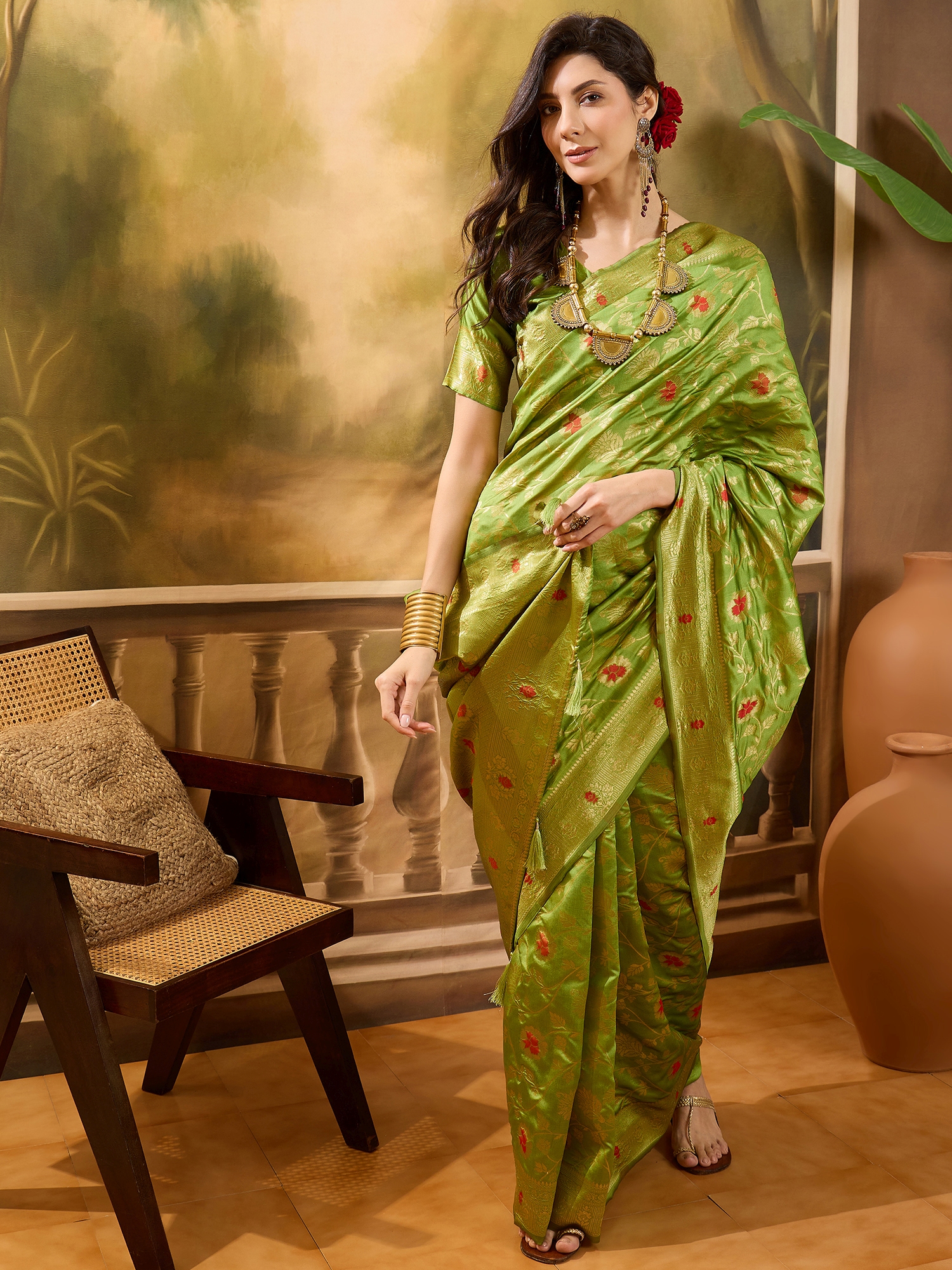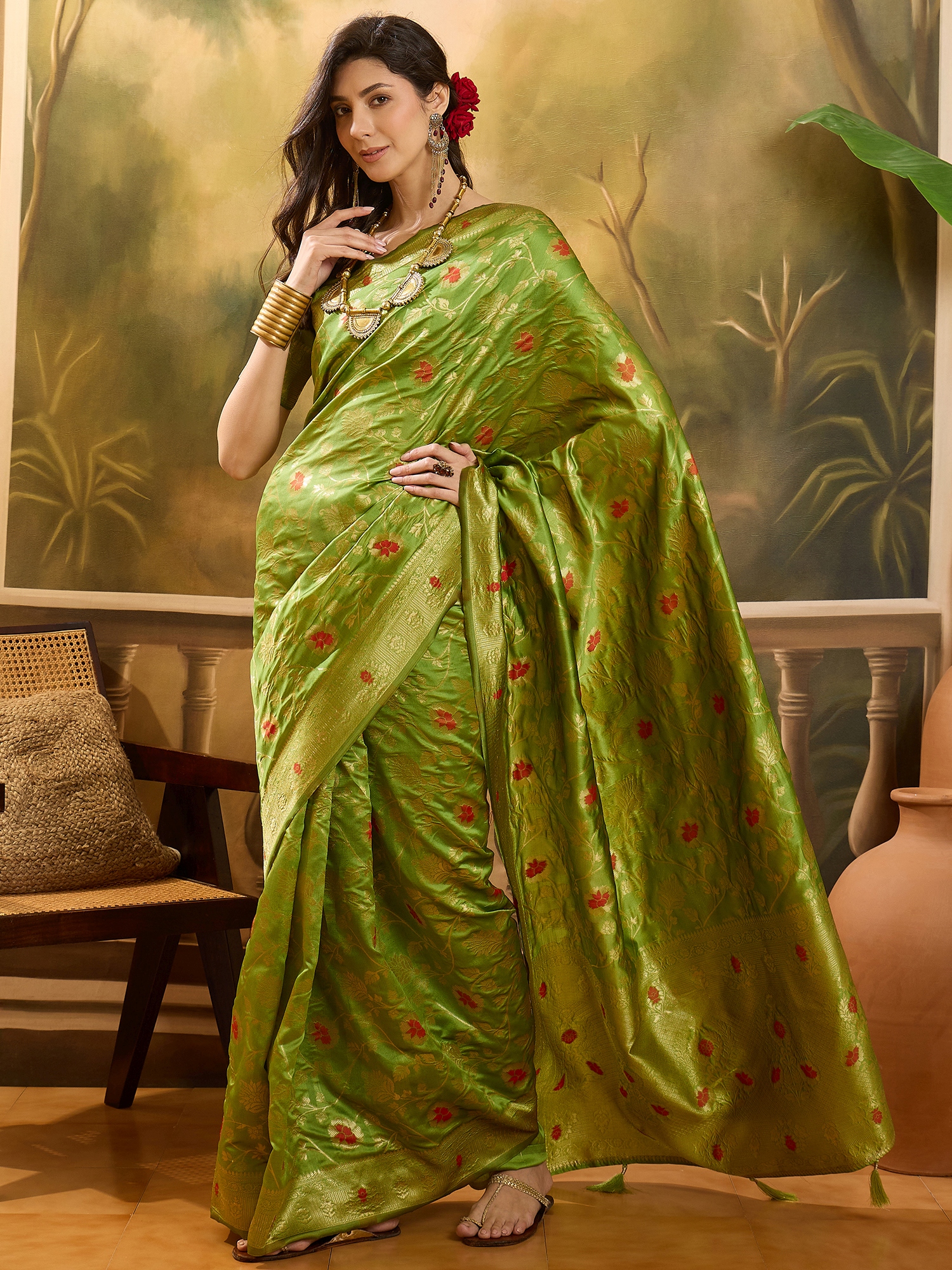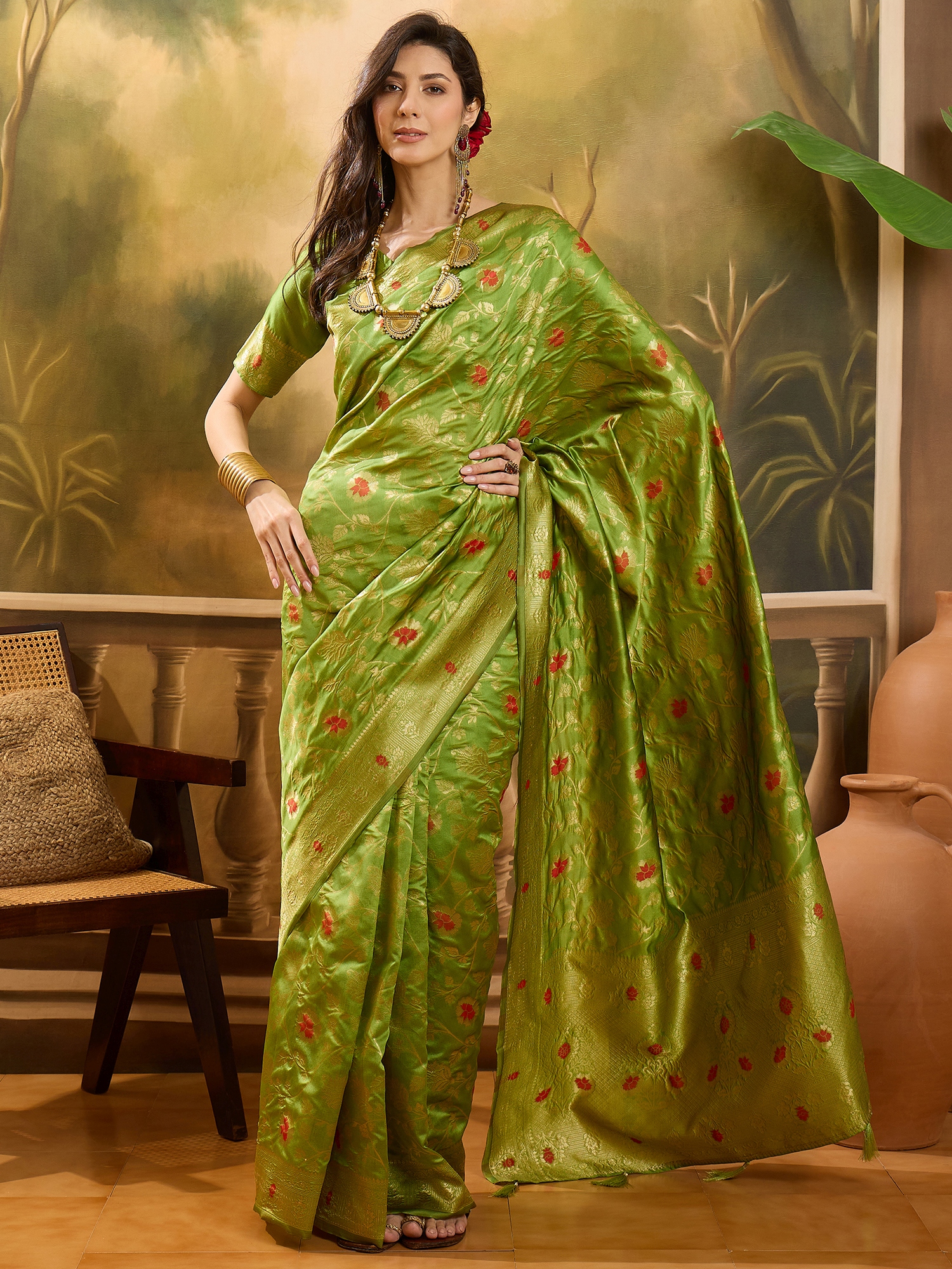 AASTHA FASHION Fashion Dream Womens Lime Green Banarasi Jacquard Saree | Soft & Elegant Traditional Wear