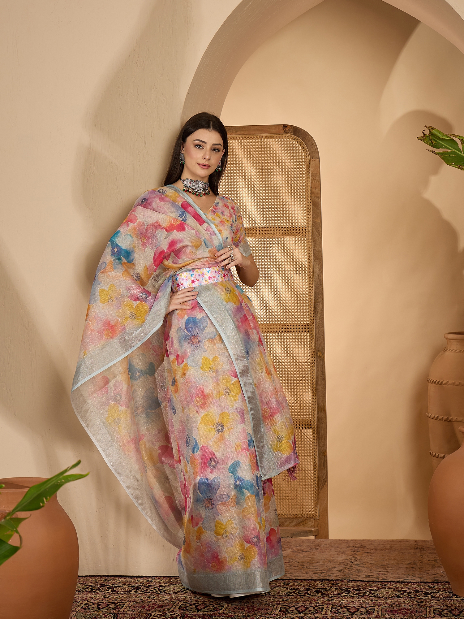 • Saree Work-Digital Print ,Blouse Work- Linen Zari Gold