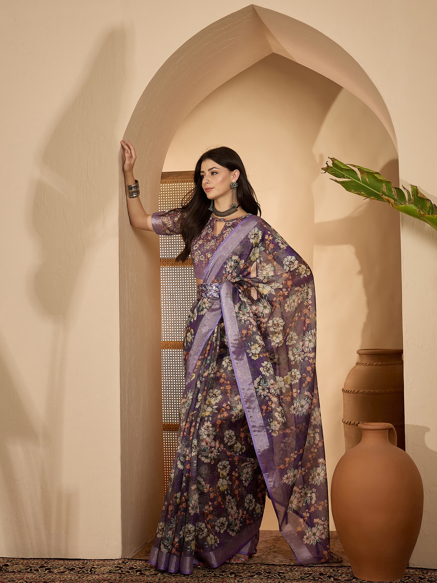 • Saree Work-Digital Print ,Blouse Work- Linen Zari Gold
