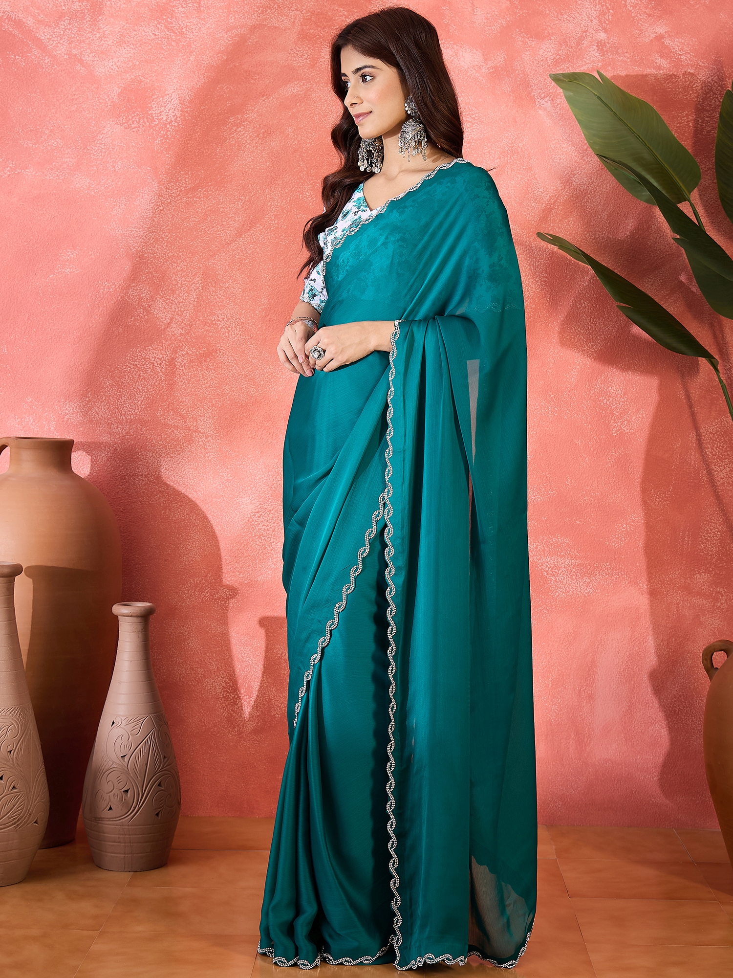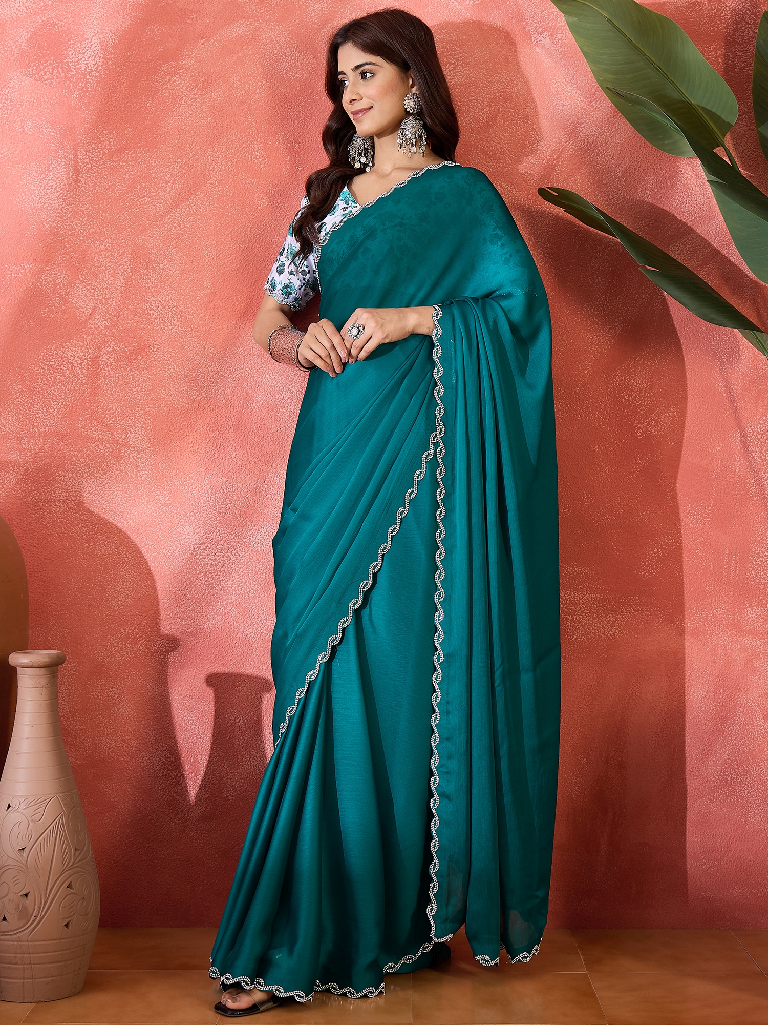 AASTHA FASHION Fashion Dream Womens Teal Heavy Satin Chiffon Saree | Soft & Elegant Traditional Wear