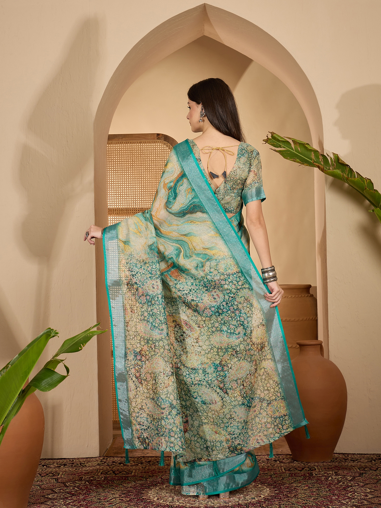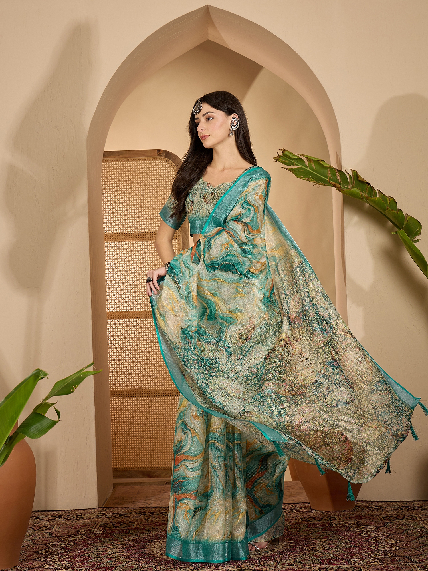 AASTHA FASHION Fashion Dream Womens Teal Linen Zari Gold Saree | Soft & Elegant Traditional Wear