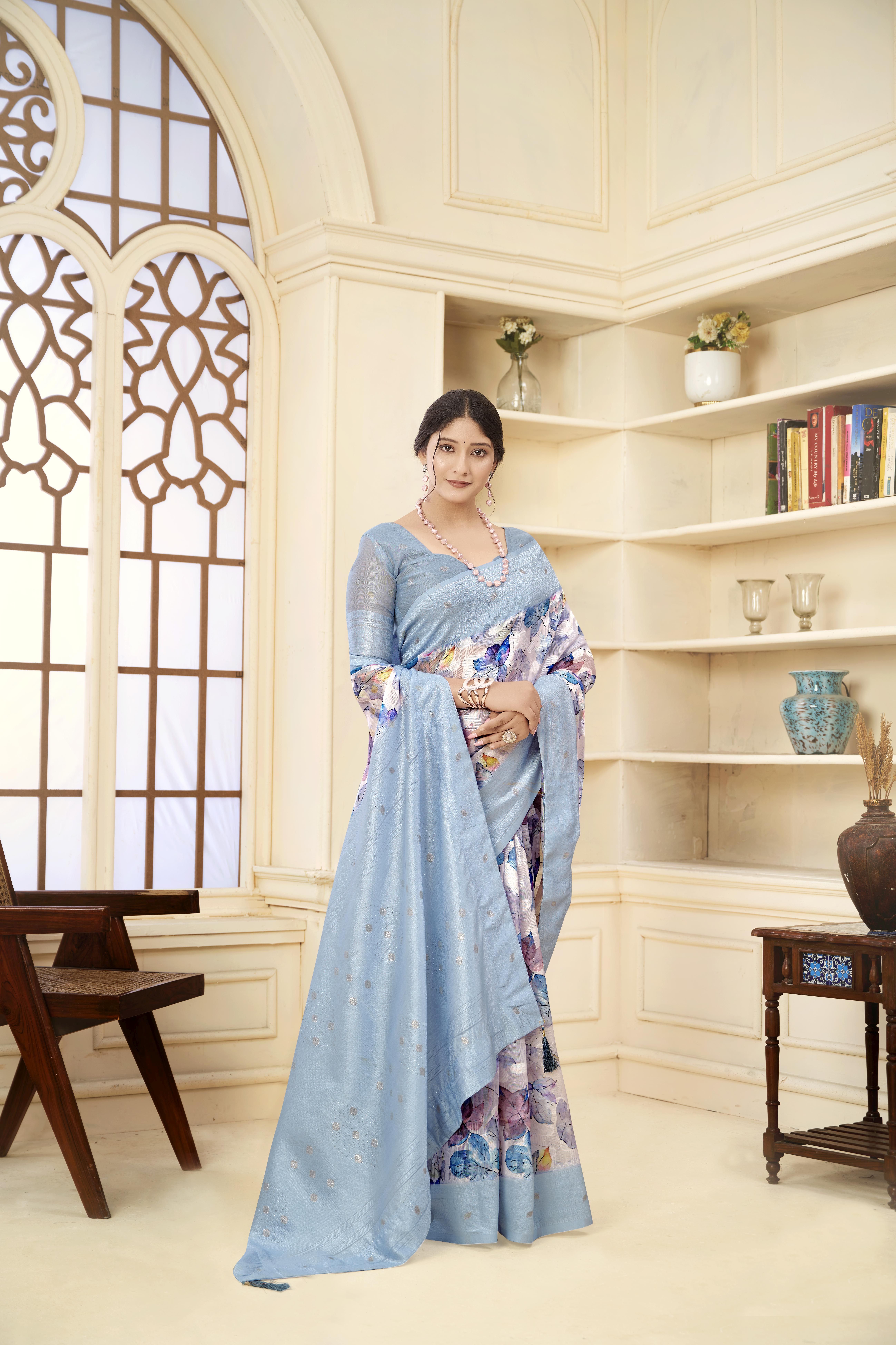 Aqua Blue Color Wevon Jacquard Designer With Printed Rich Silk Fabric Stylish Ceremonial Saree