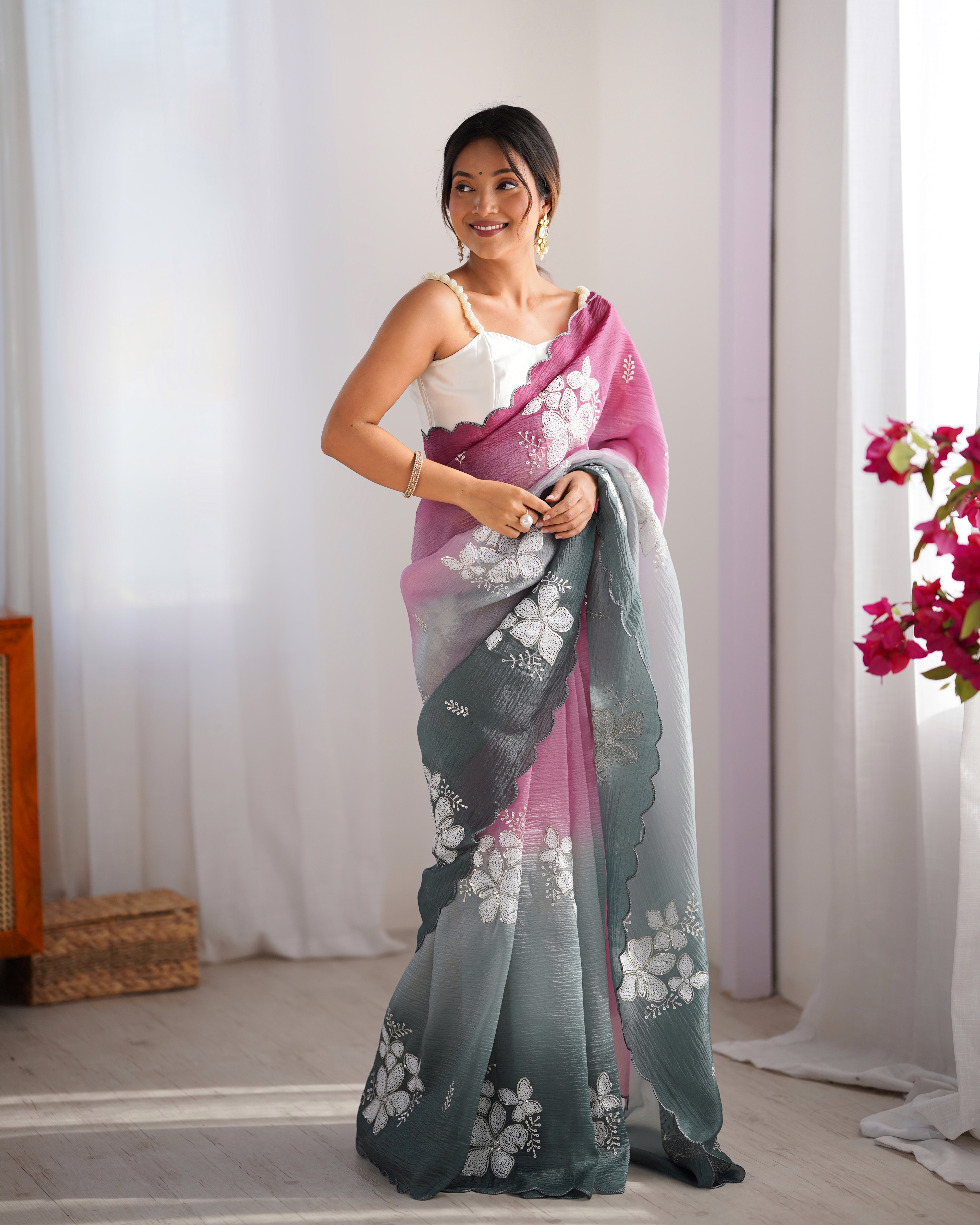 Looking These Party Wear Saree in Fine Dual Shaded Colored.These Saree Are Crunchy Crush And Blouse is Satin Silk Fabricated.Its Beautified With Pedding Color Printed With Designer Dual Sequance Embroidery Work.