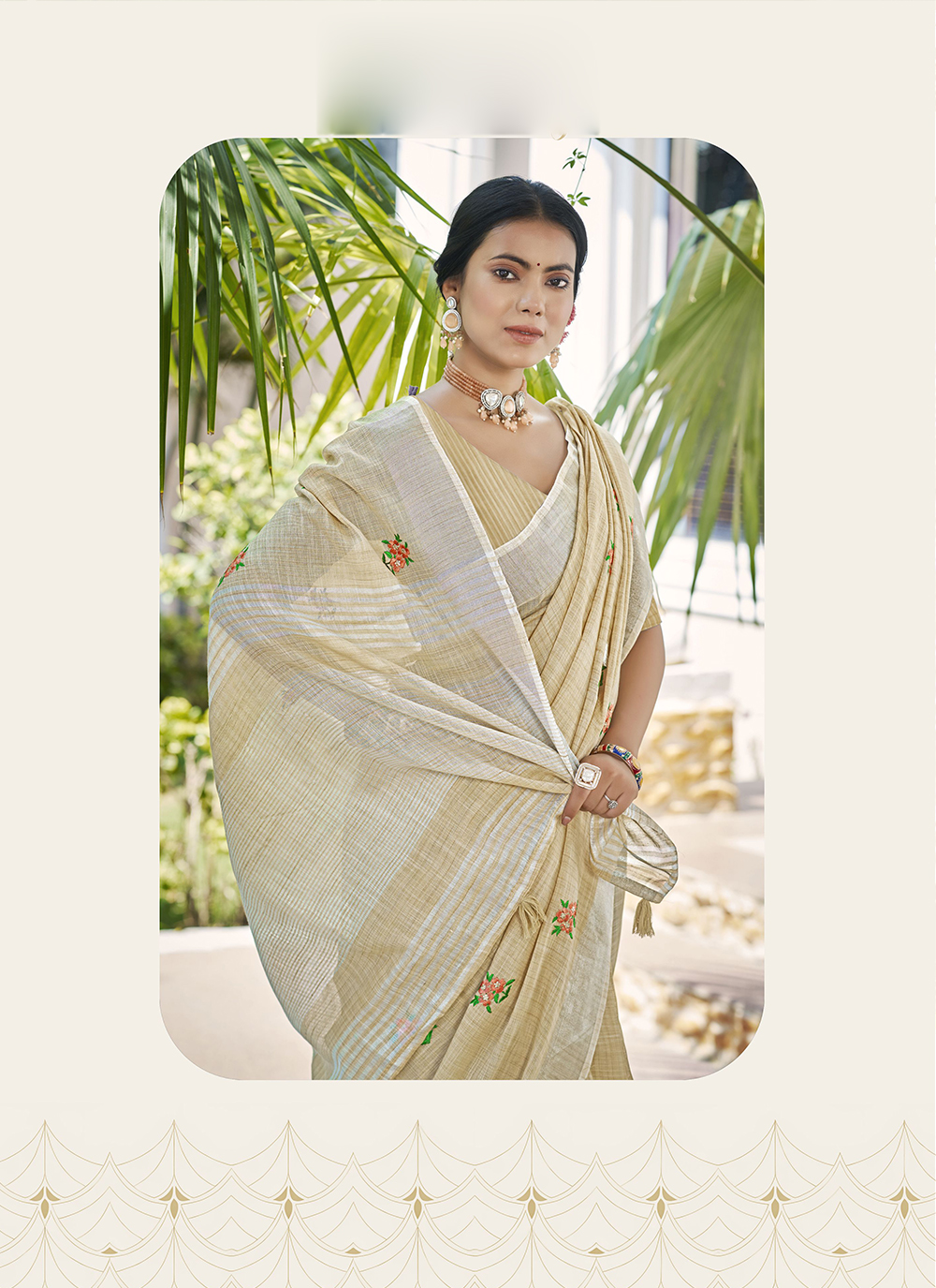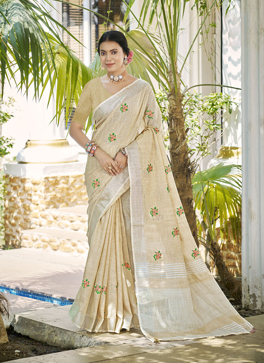Beige Color Linen Fabric Beautifully Embroidered Ethnic Saree