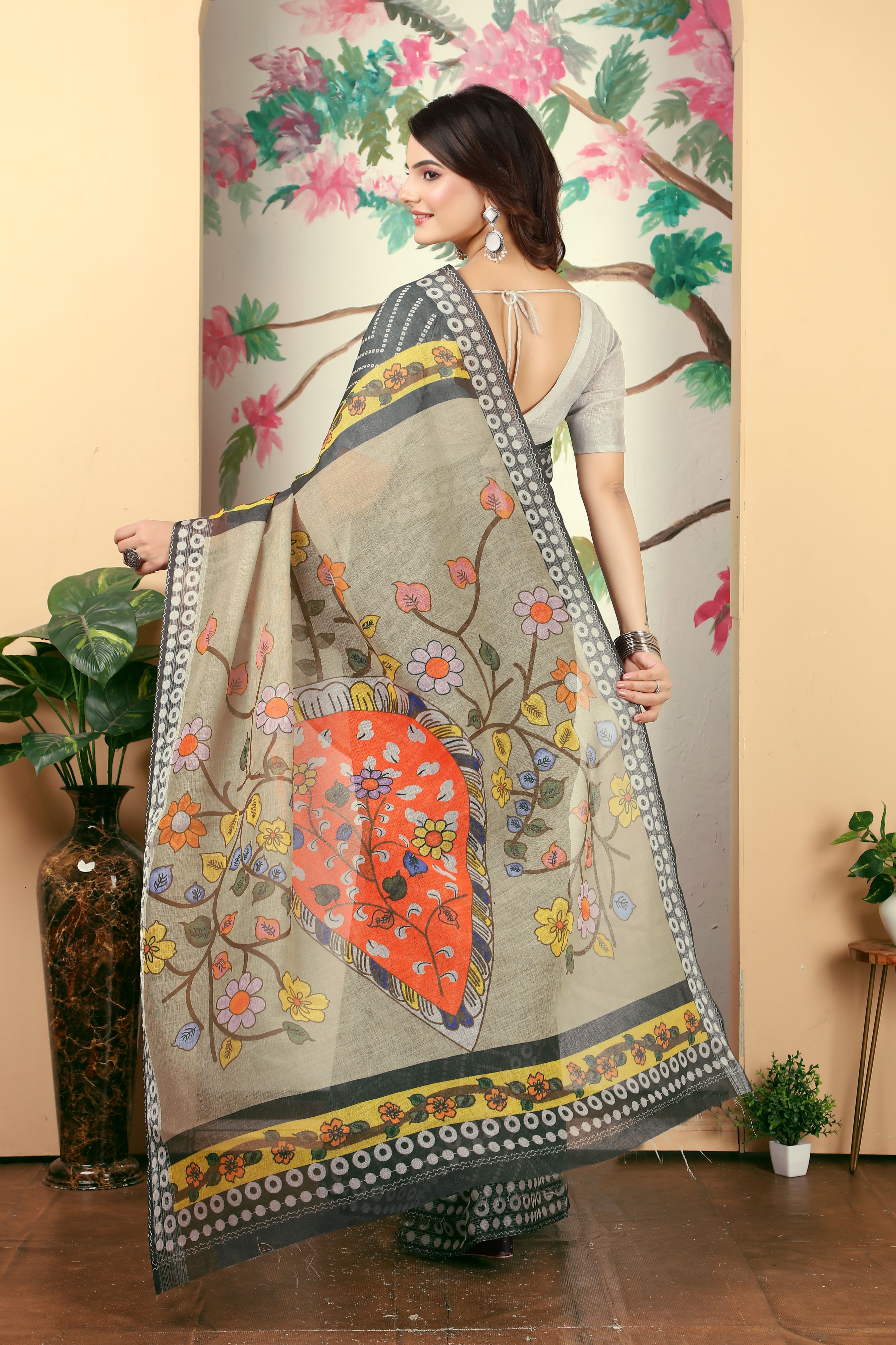 Garb These Festive Saree in Fine Colored.These Saree Are Linen Cotton And Blouse is Fabricated On Linen Cotton Pair.Its Beautified With Wevon Jari Border With Designer Digital Printed.