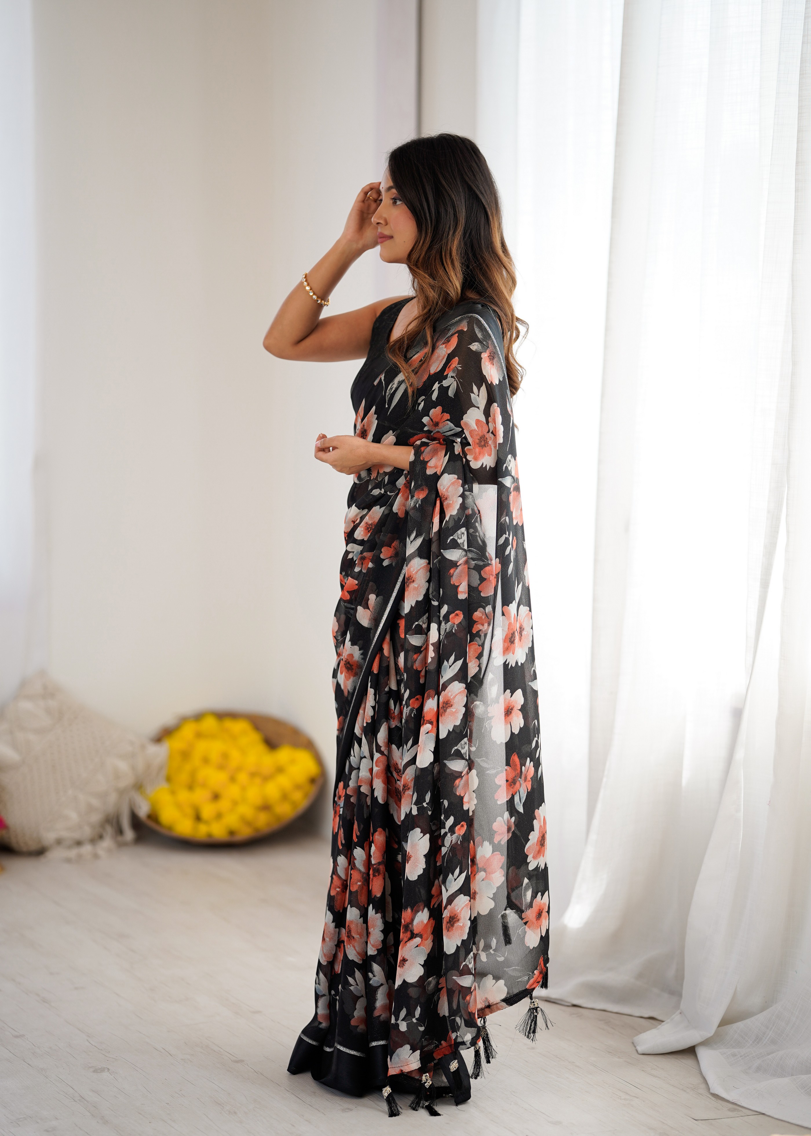 Black Color Moss Satin Patta Stylish Partywear Saree