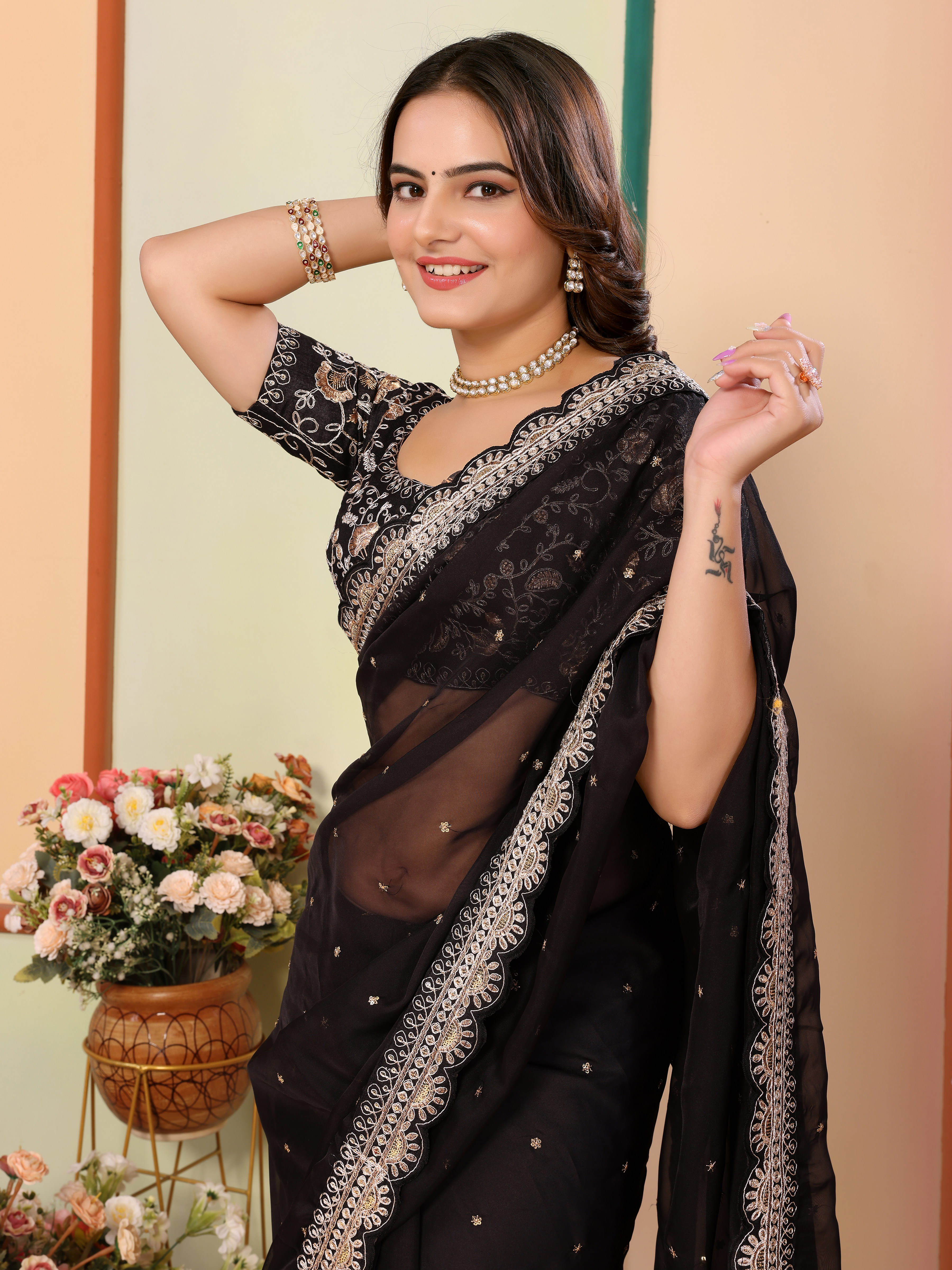 Black Color Organza Fabric Designer Embroidery Work Patywear Saree