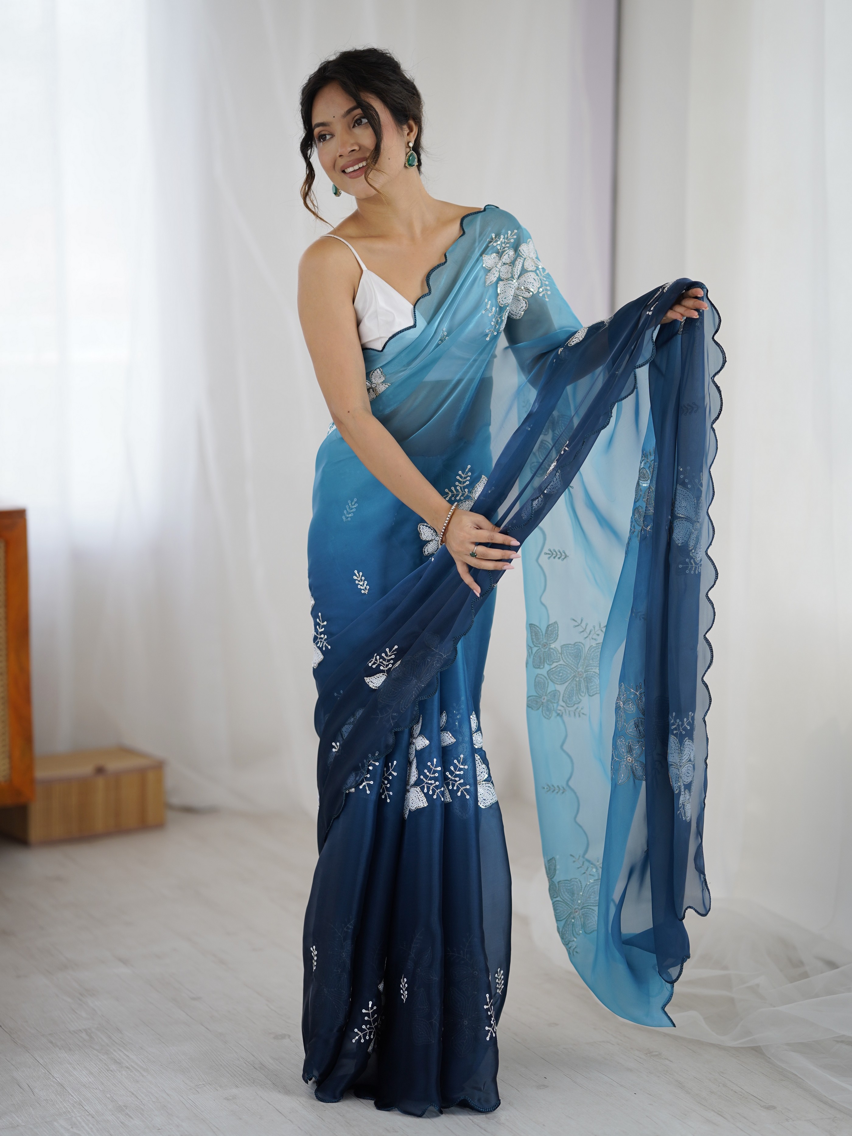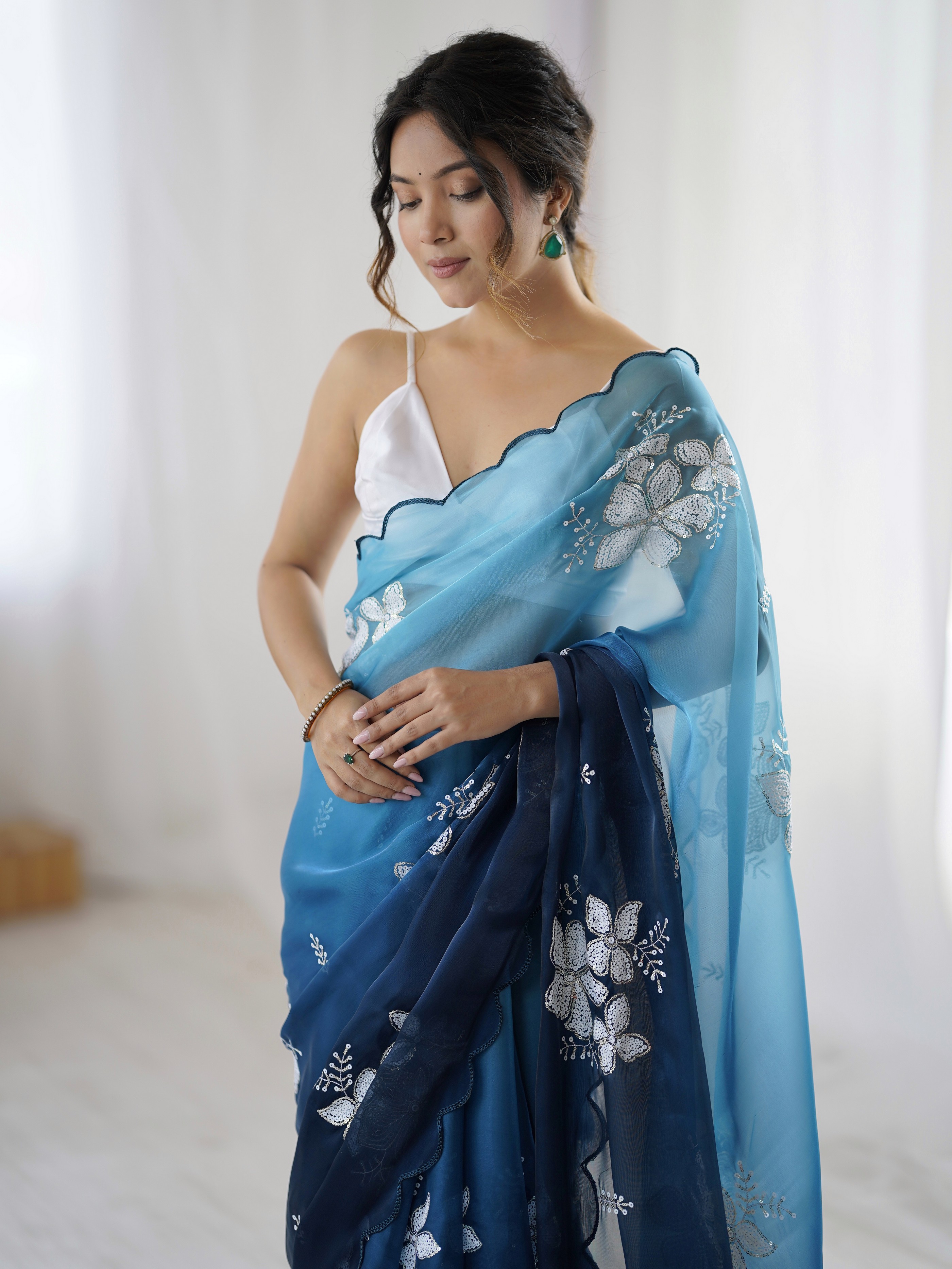 Blue Color Glamorous Jimmy Choo Fabric Beautiful Embroidered Saree