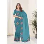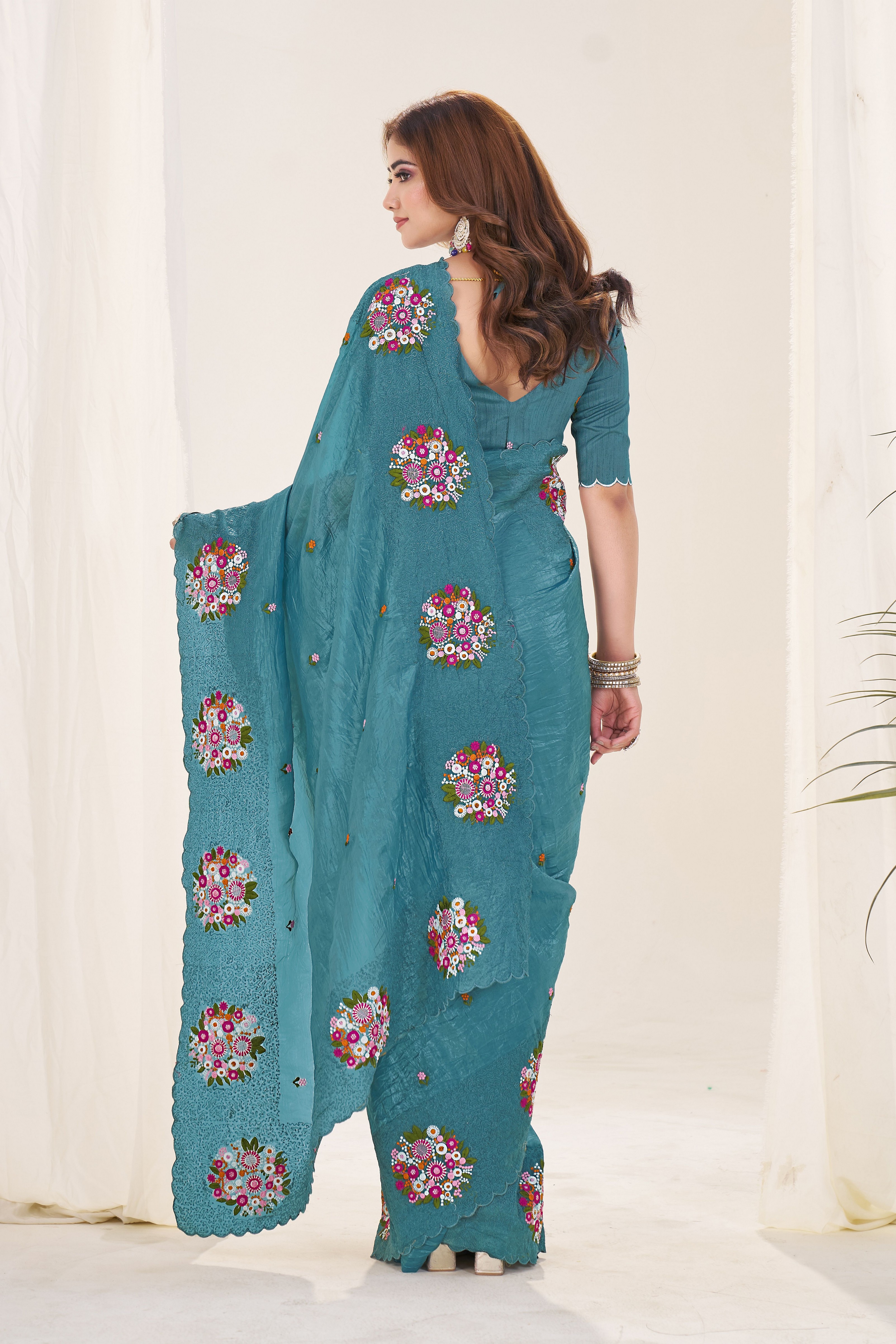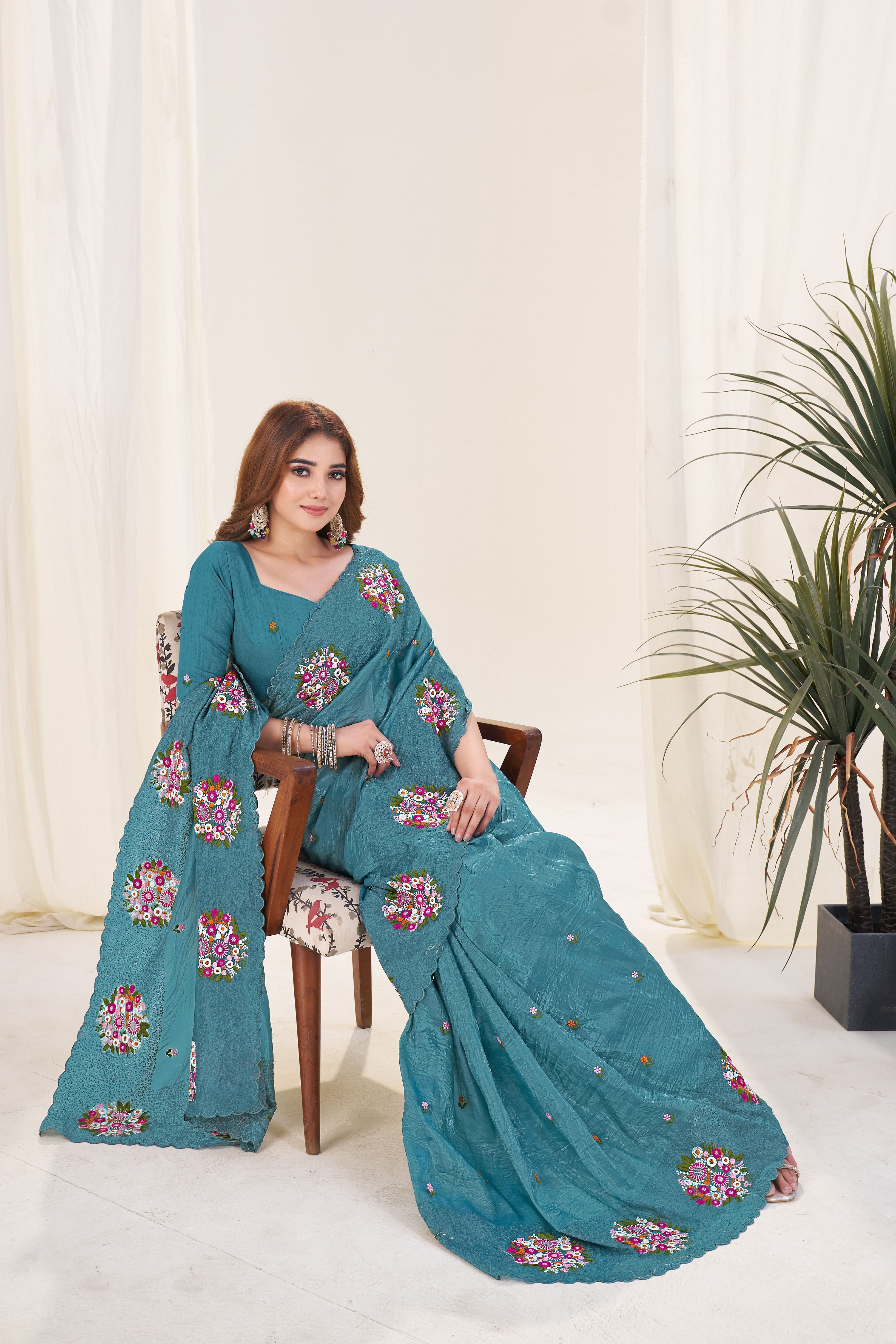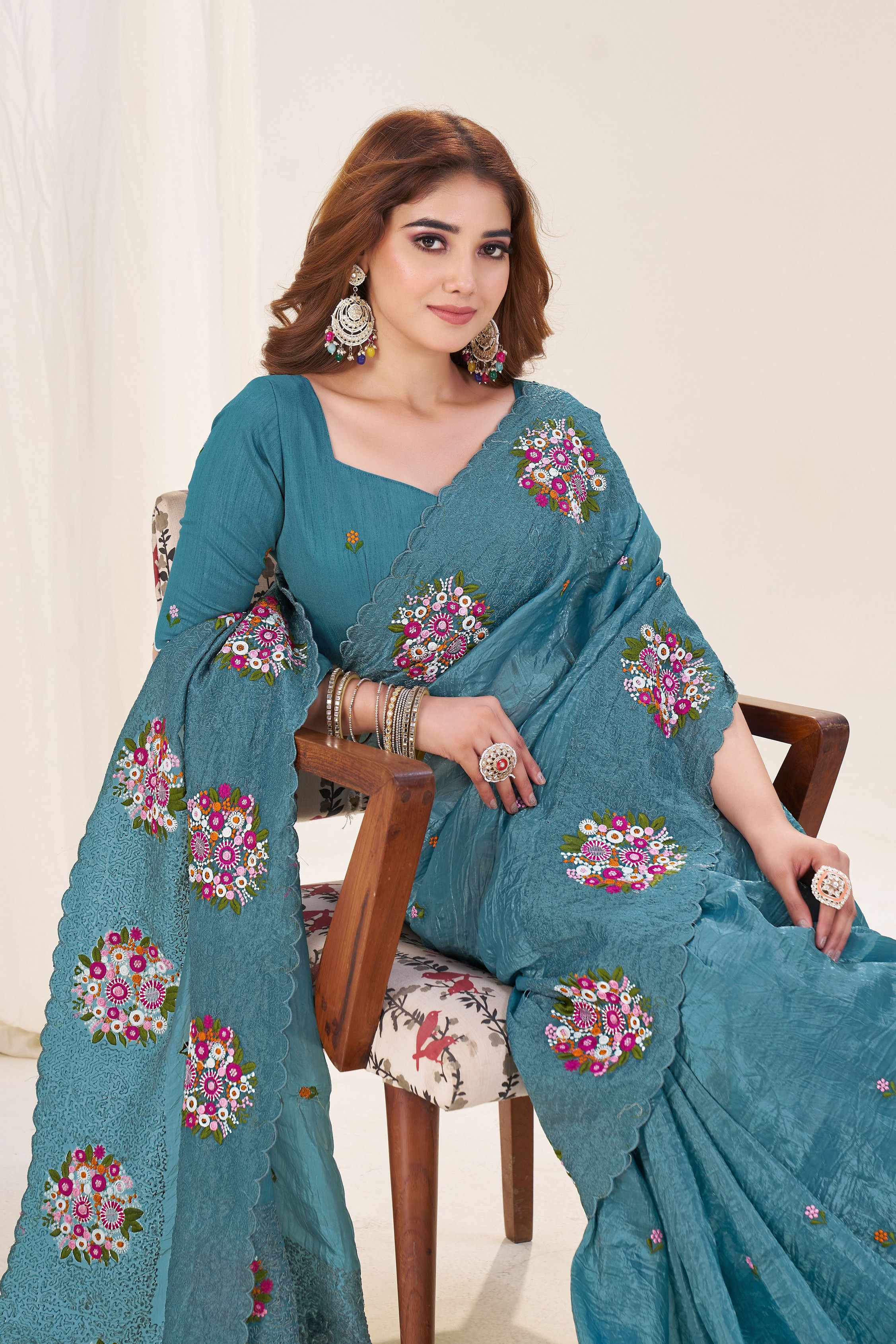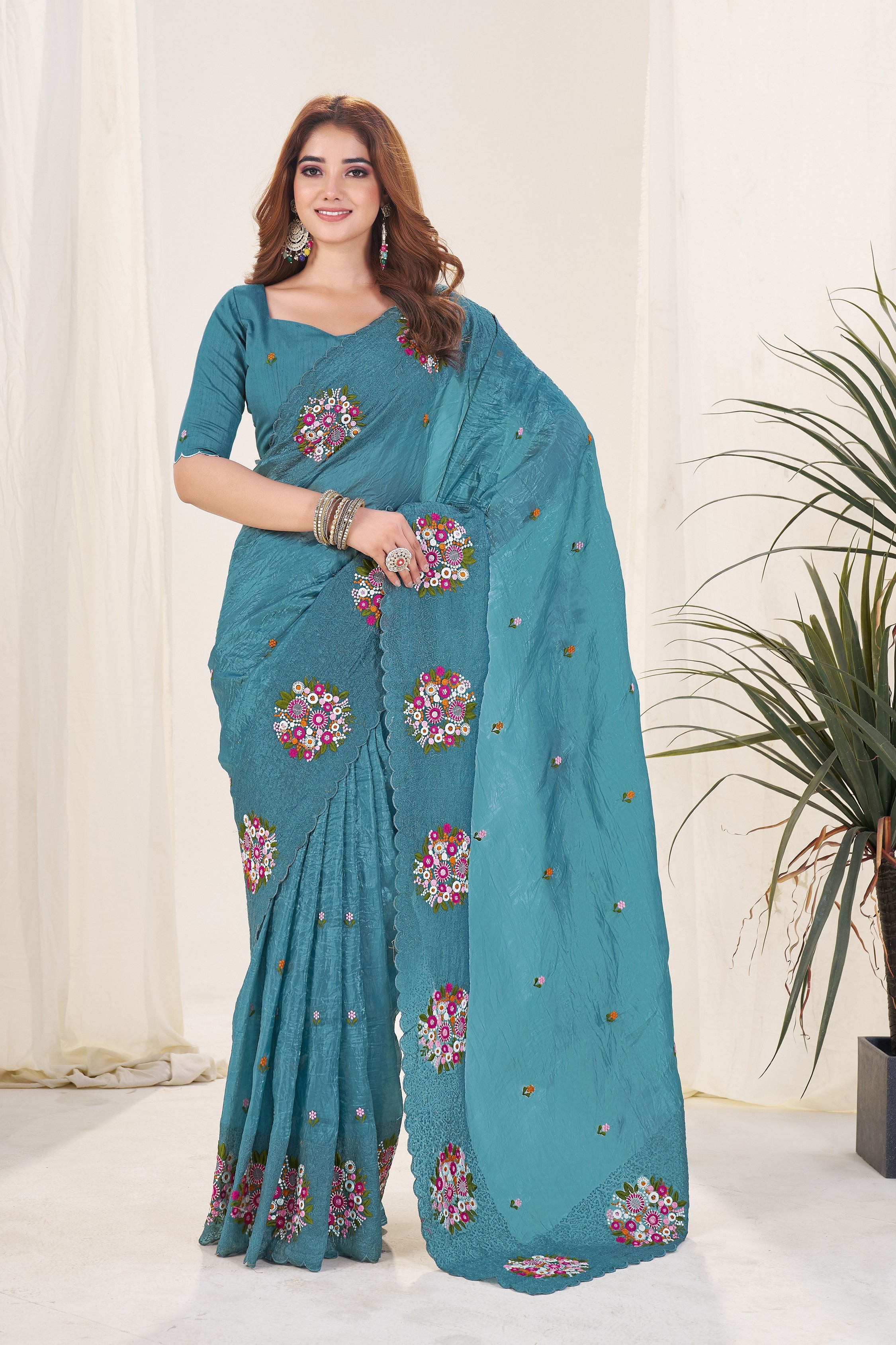 Blue Color Gold Crush Fabric Designer Embroidered Saree