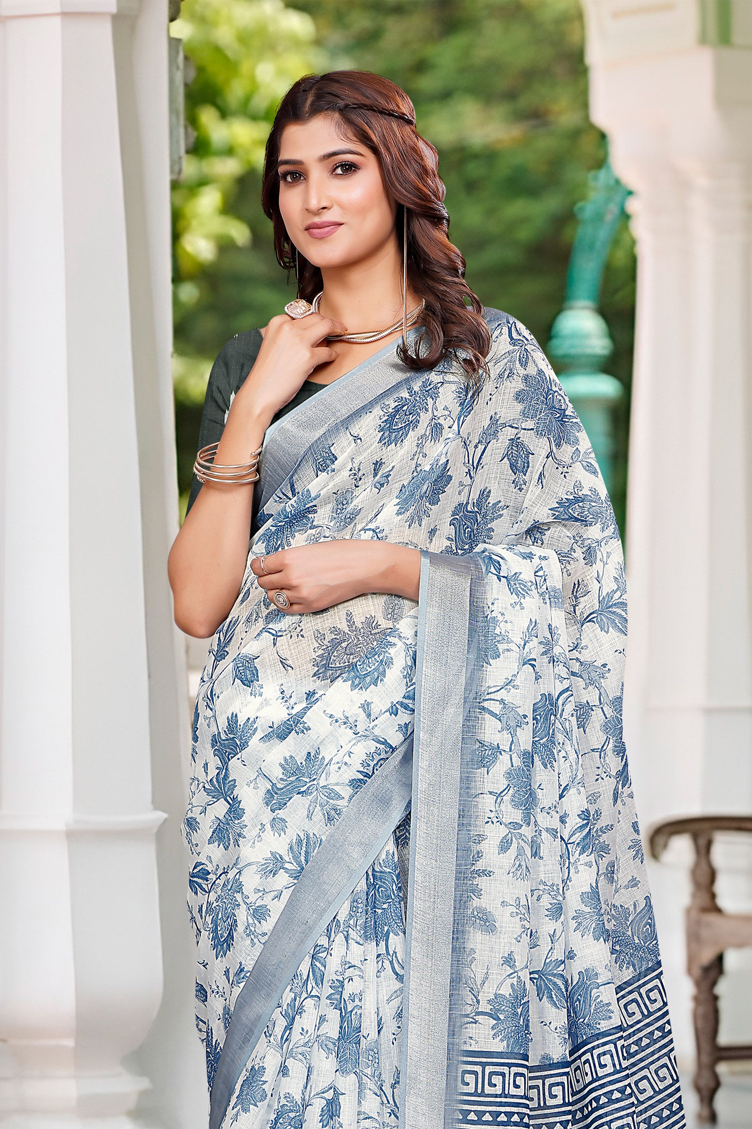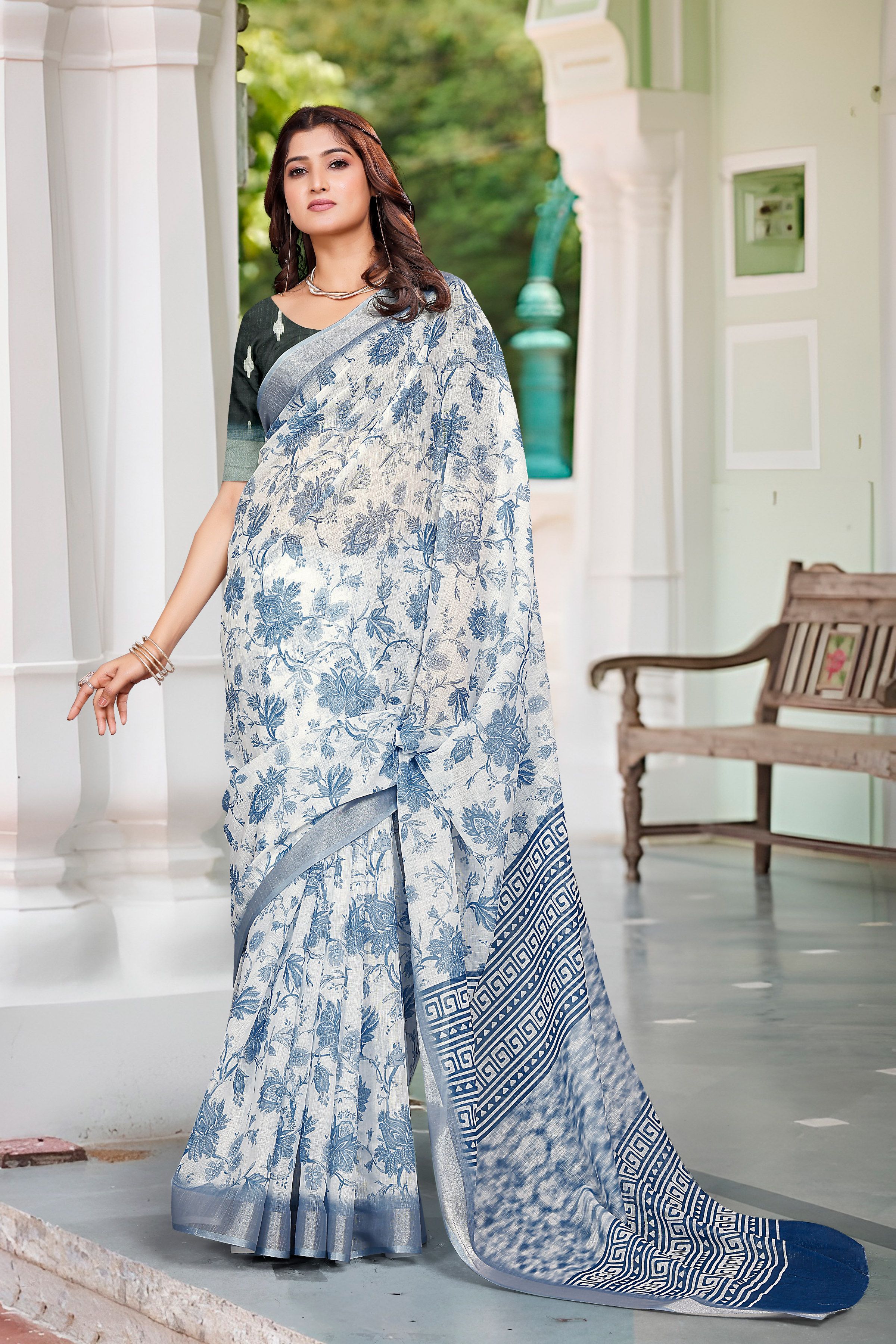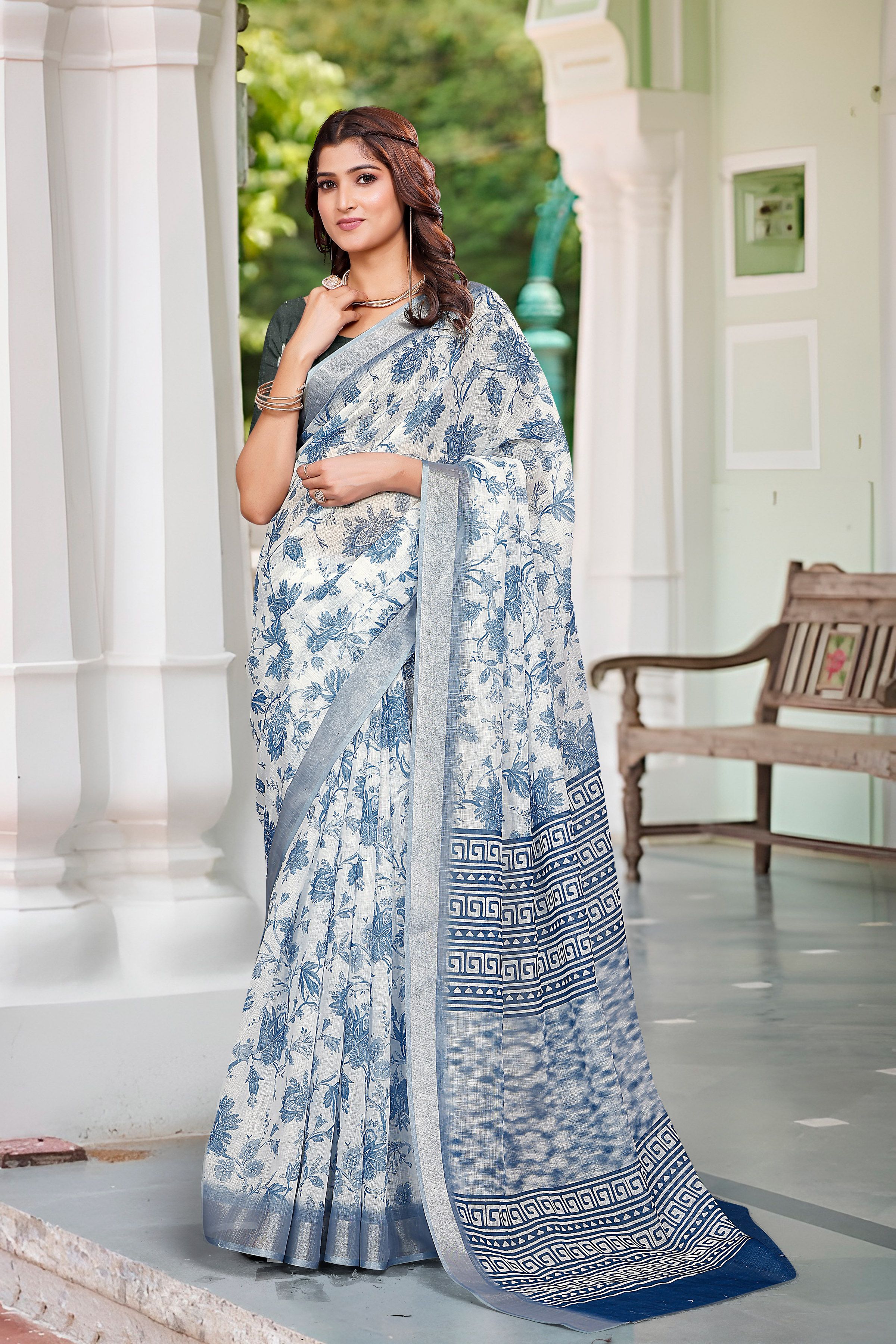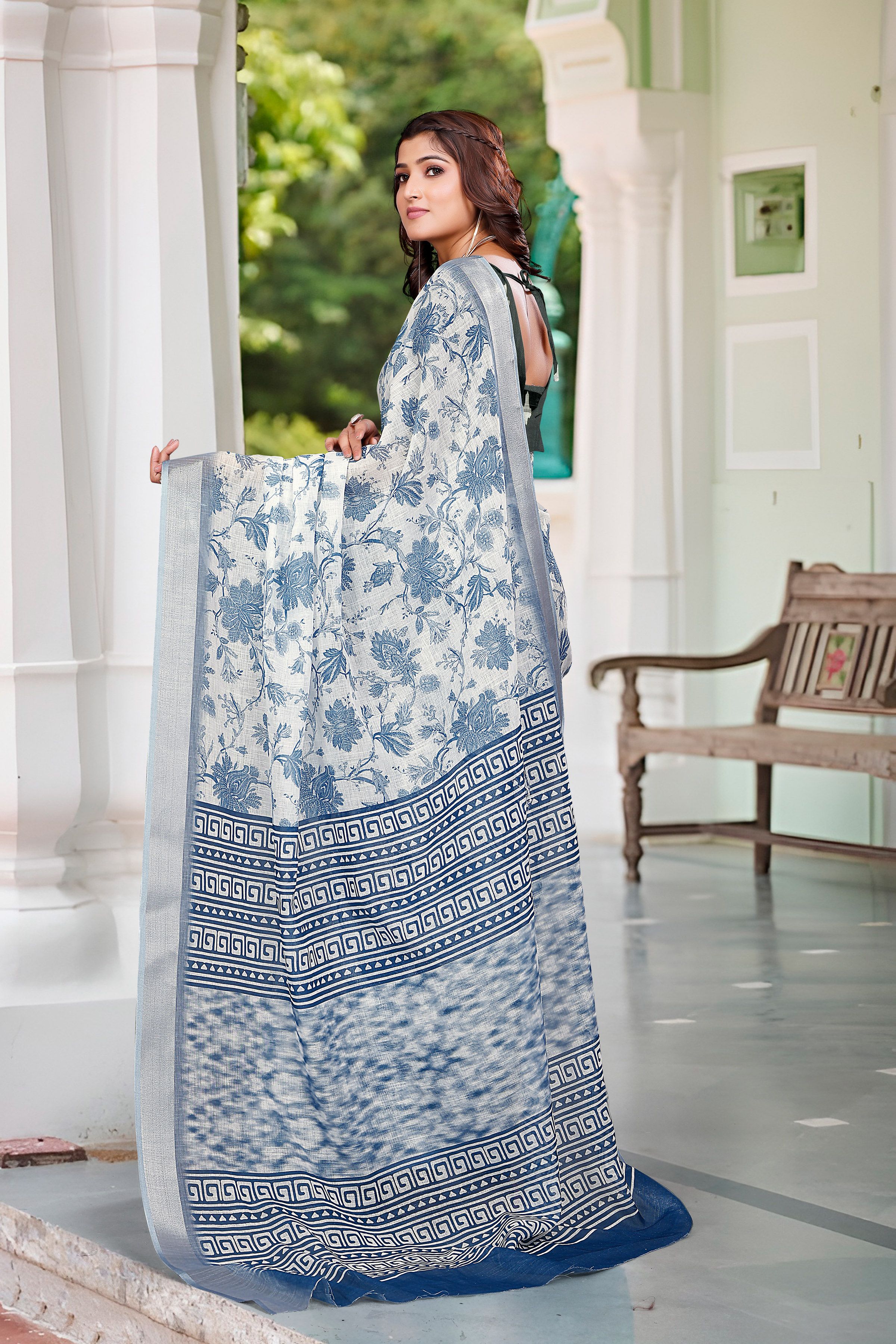 Garb These Festive Saree in Fine Colored.These Saree Are Linen Cotton And Blouse is Fabricated On Linen Cotton Pair.Its Beautified With Wevon Jari Border With Designer Digital Printed.