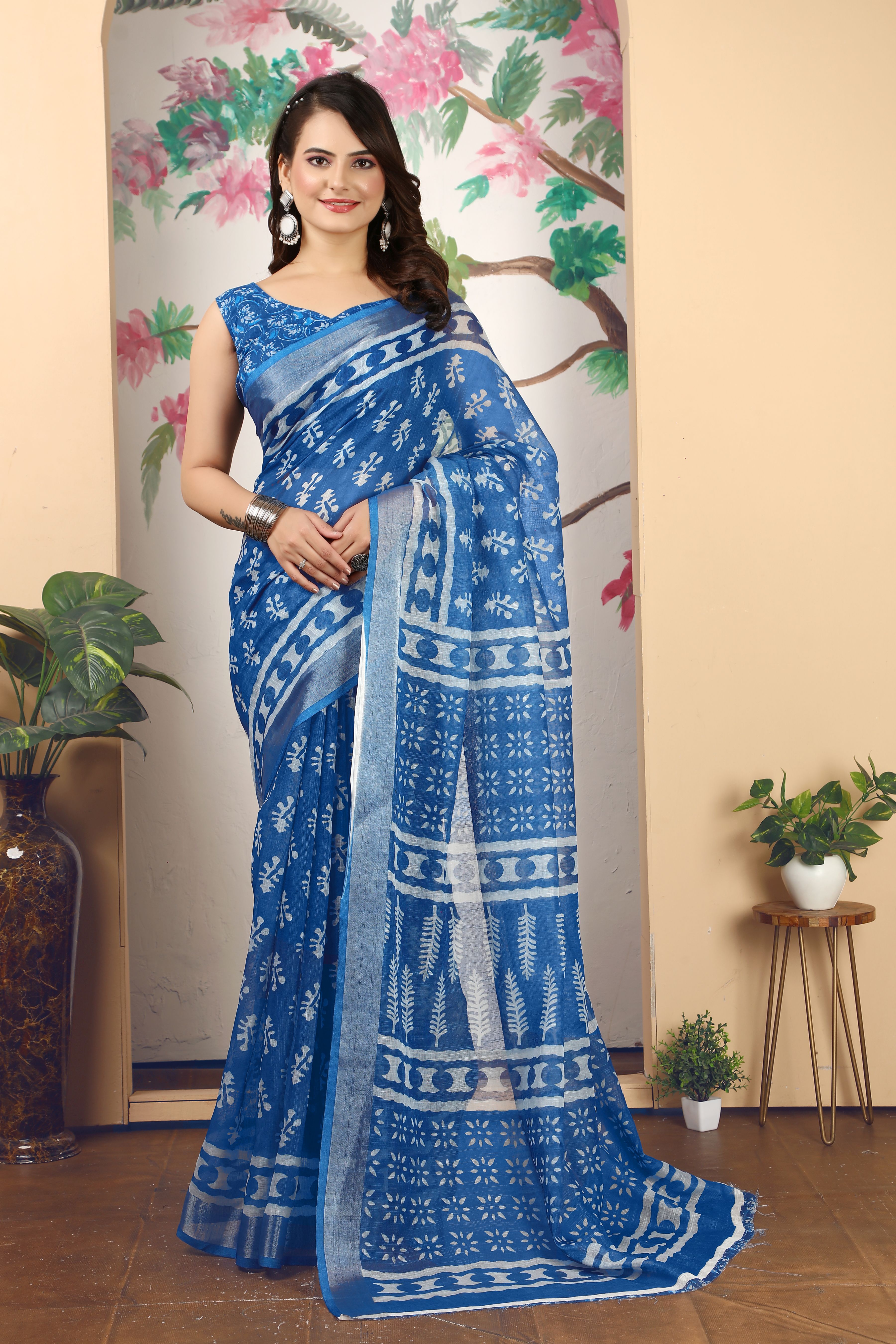 Blue Color Linen Cotton Fabric Beautiful Printed Saree