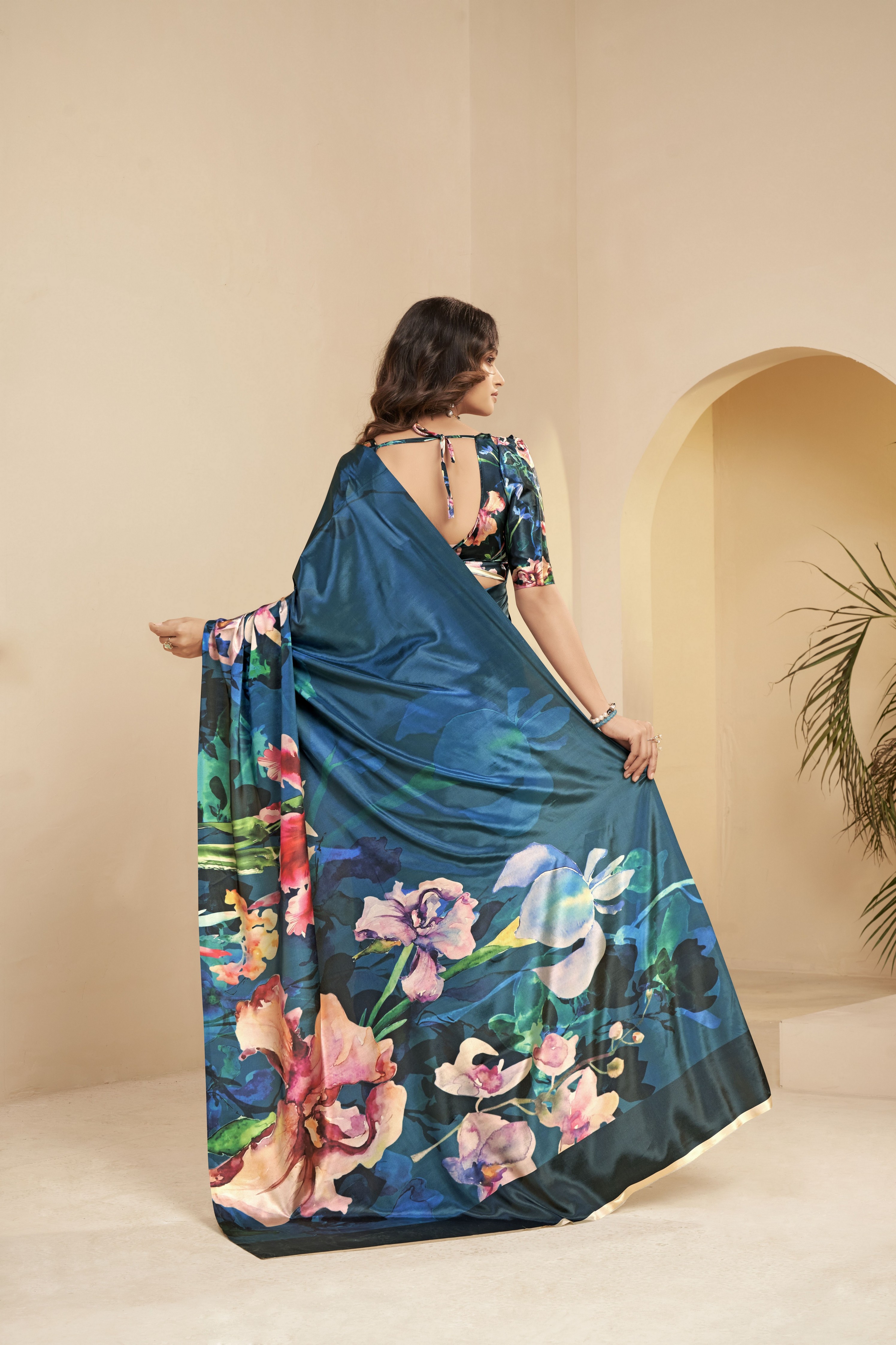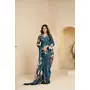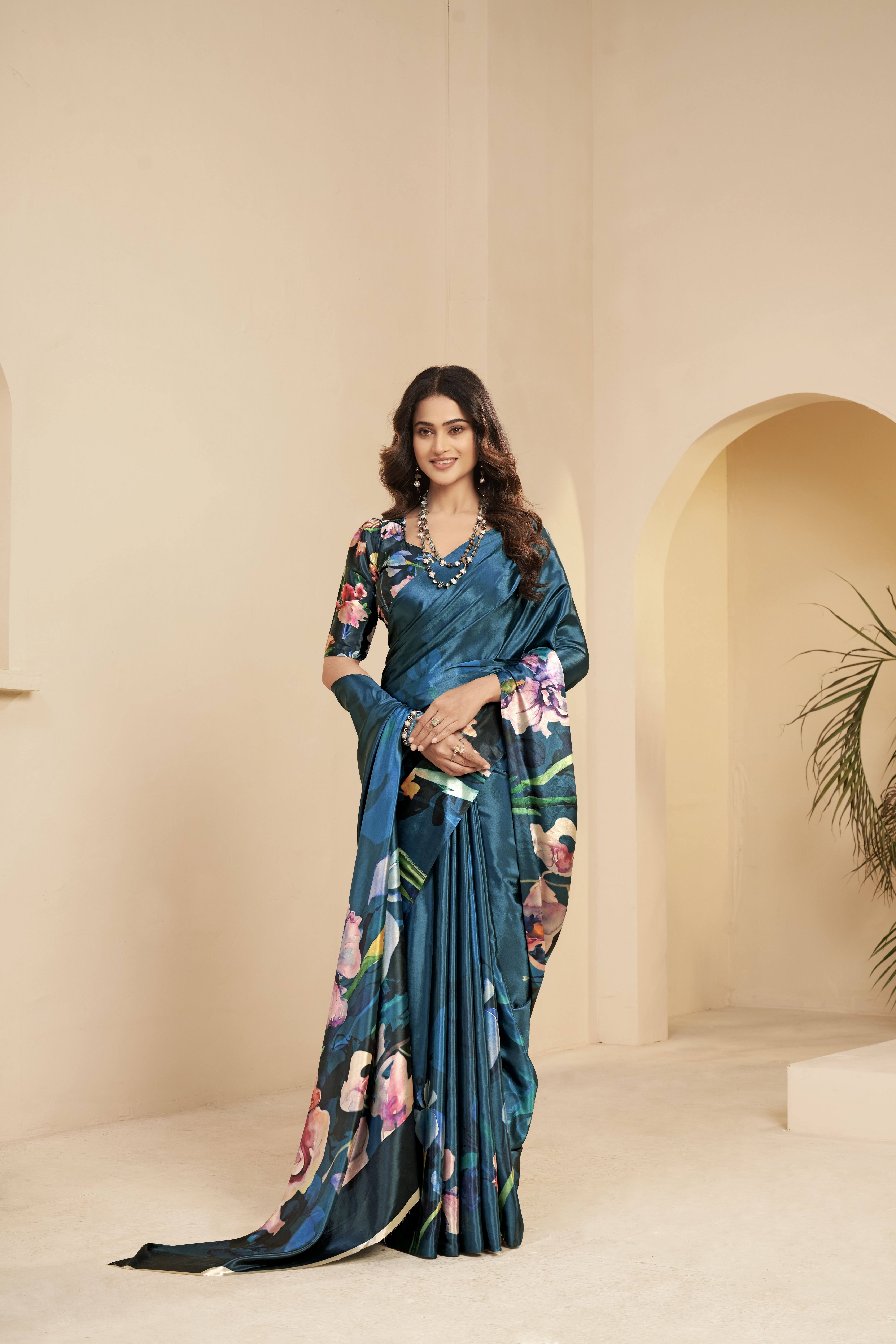 Blue Color Malai Crepe Silk Designer Digital Printed Ethnic Partywear Saree