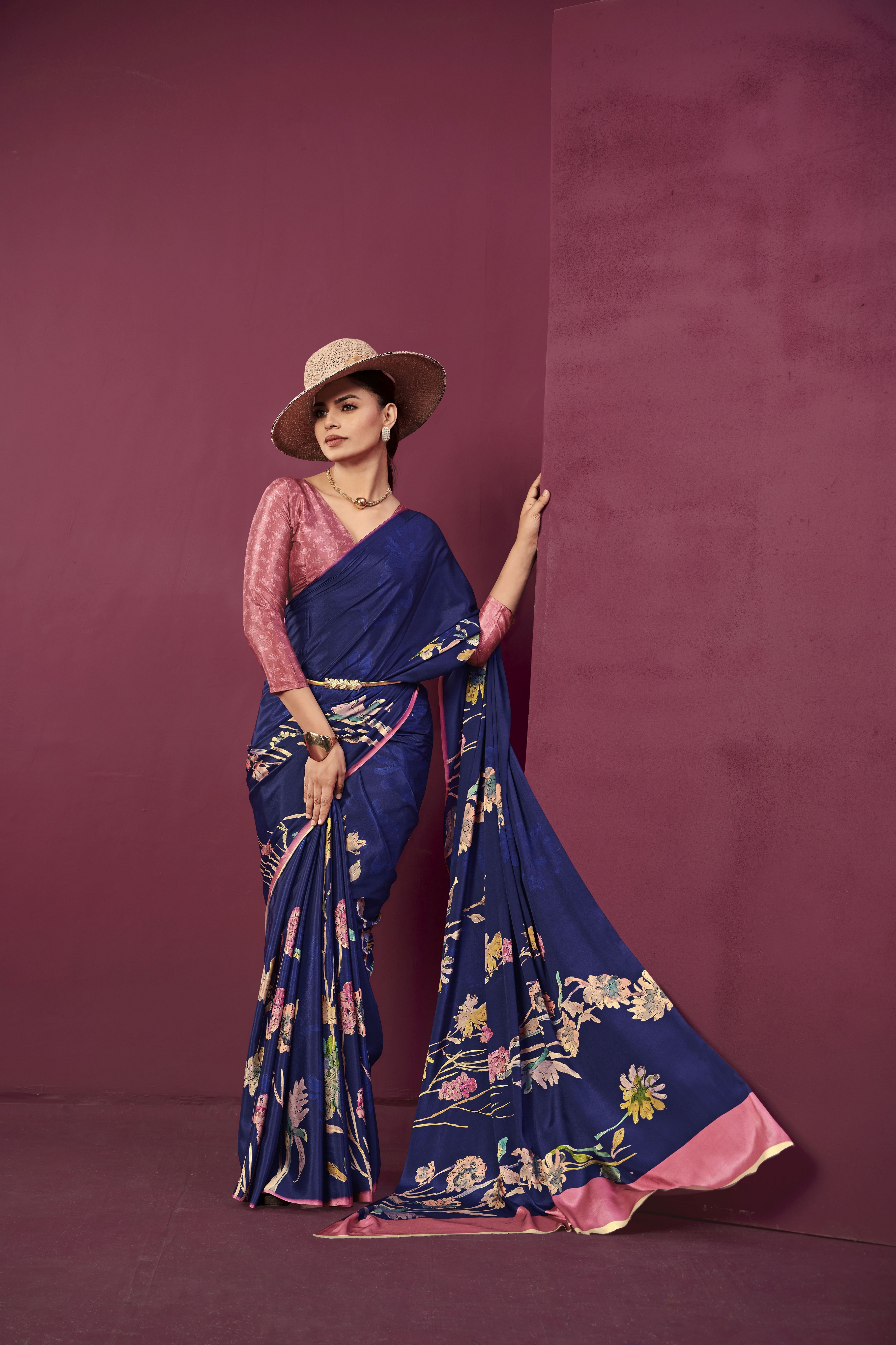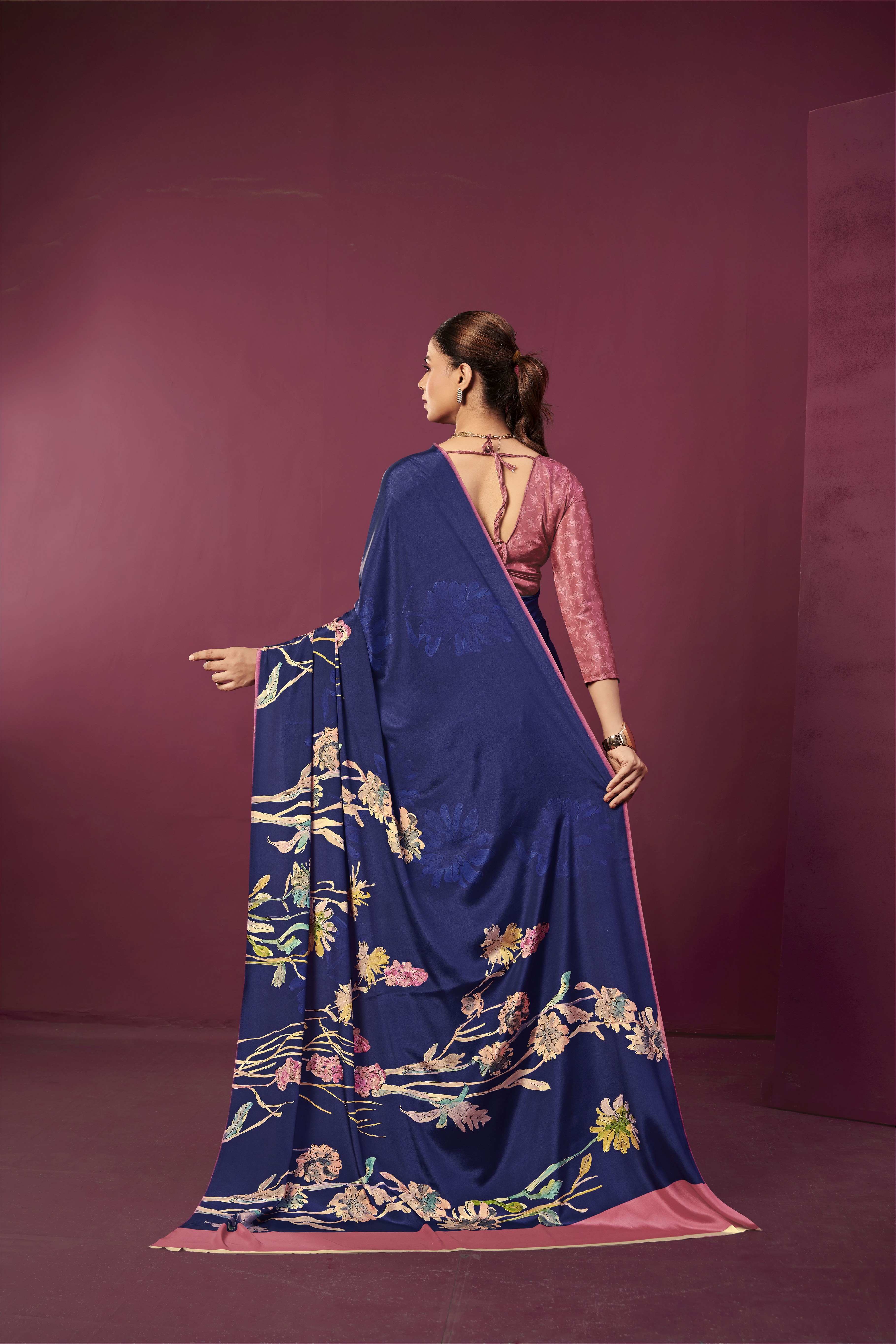 Blue Color Malai Crepe Silk Fabric Designer Digital Printed Ceremonial Partywear Saree