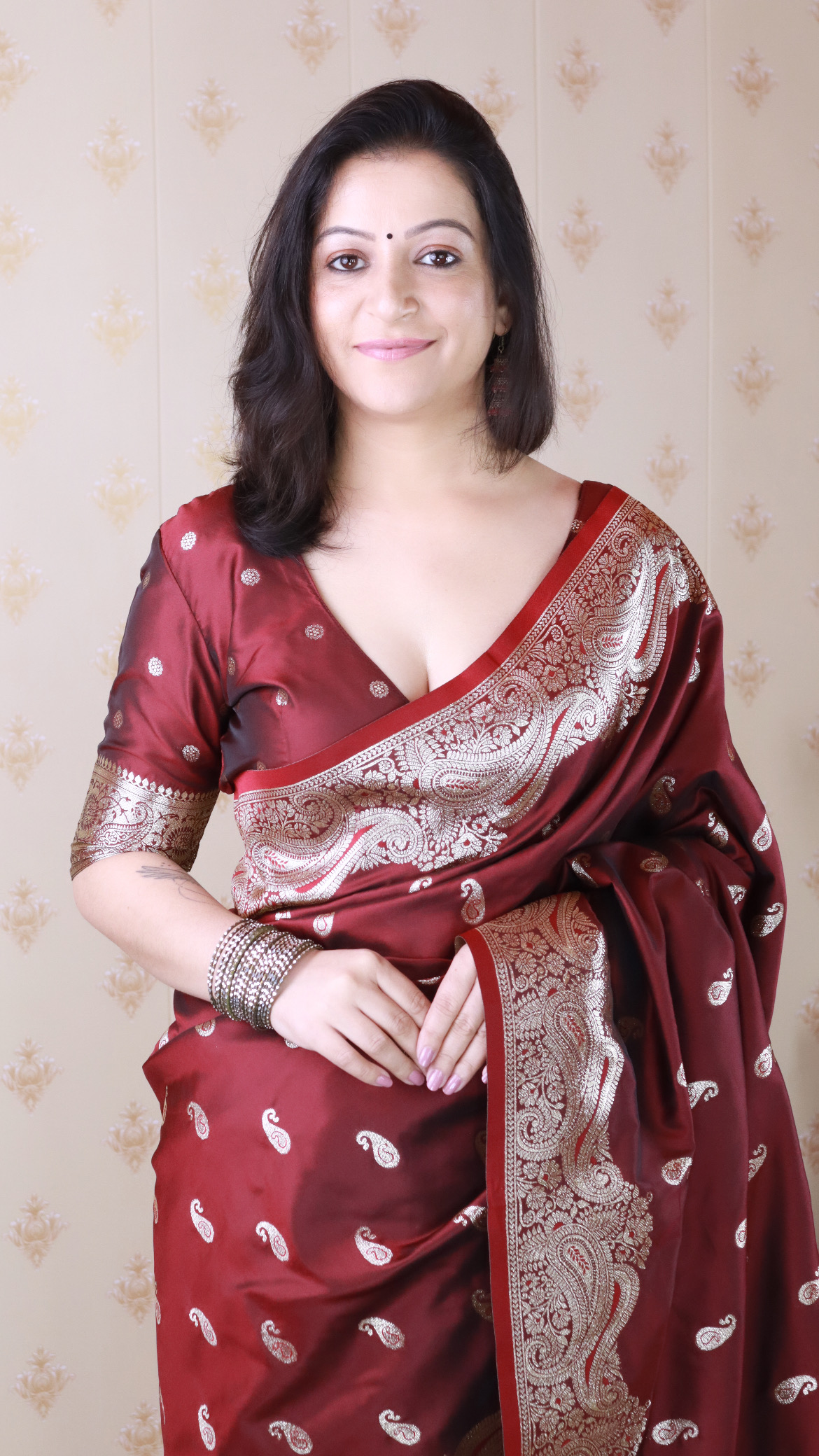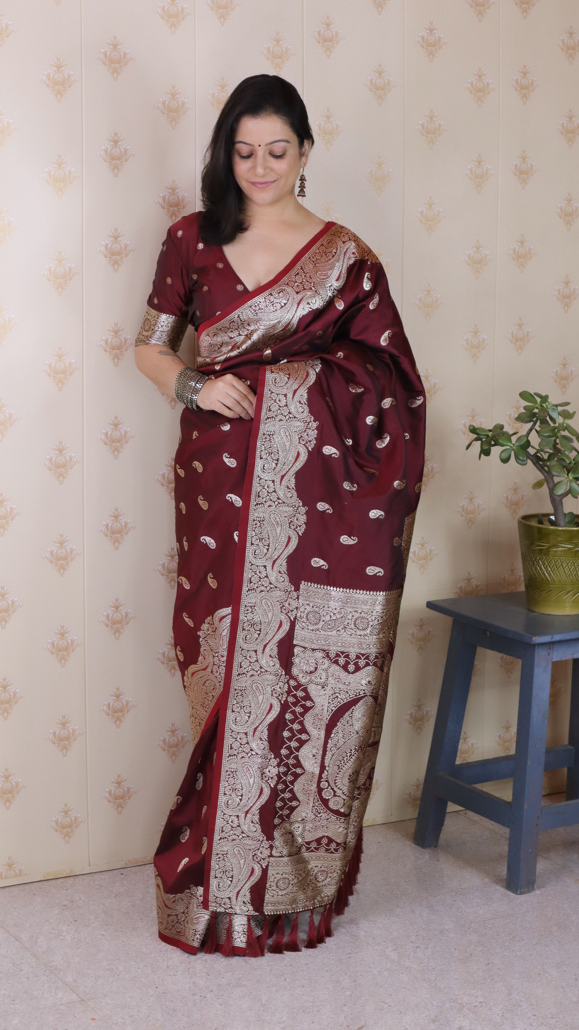 Brown Color Banarasi Silk Saree Woven Silver Jari Designer Ceremonial Partywear Saree