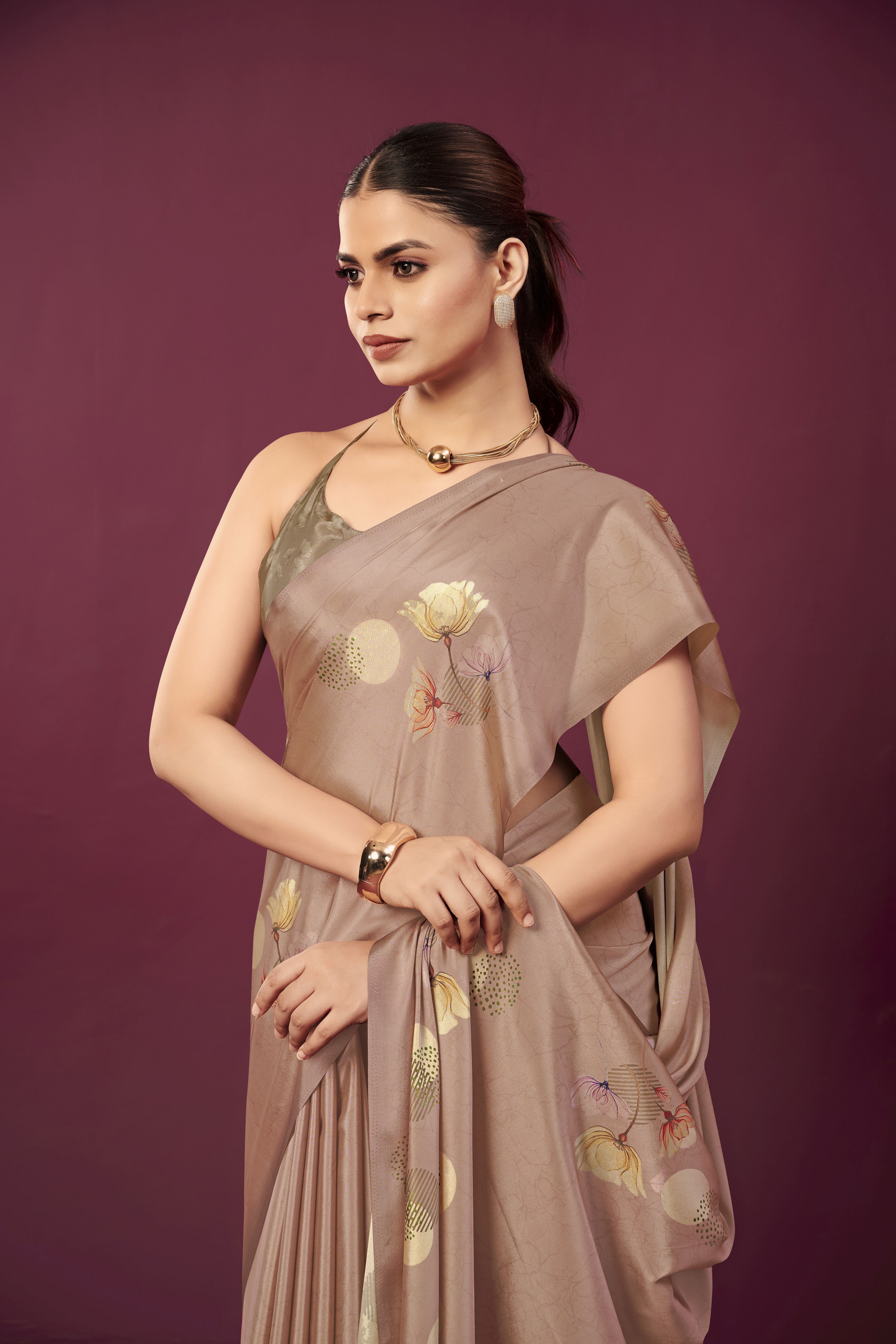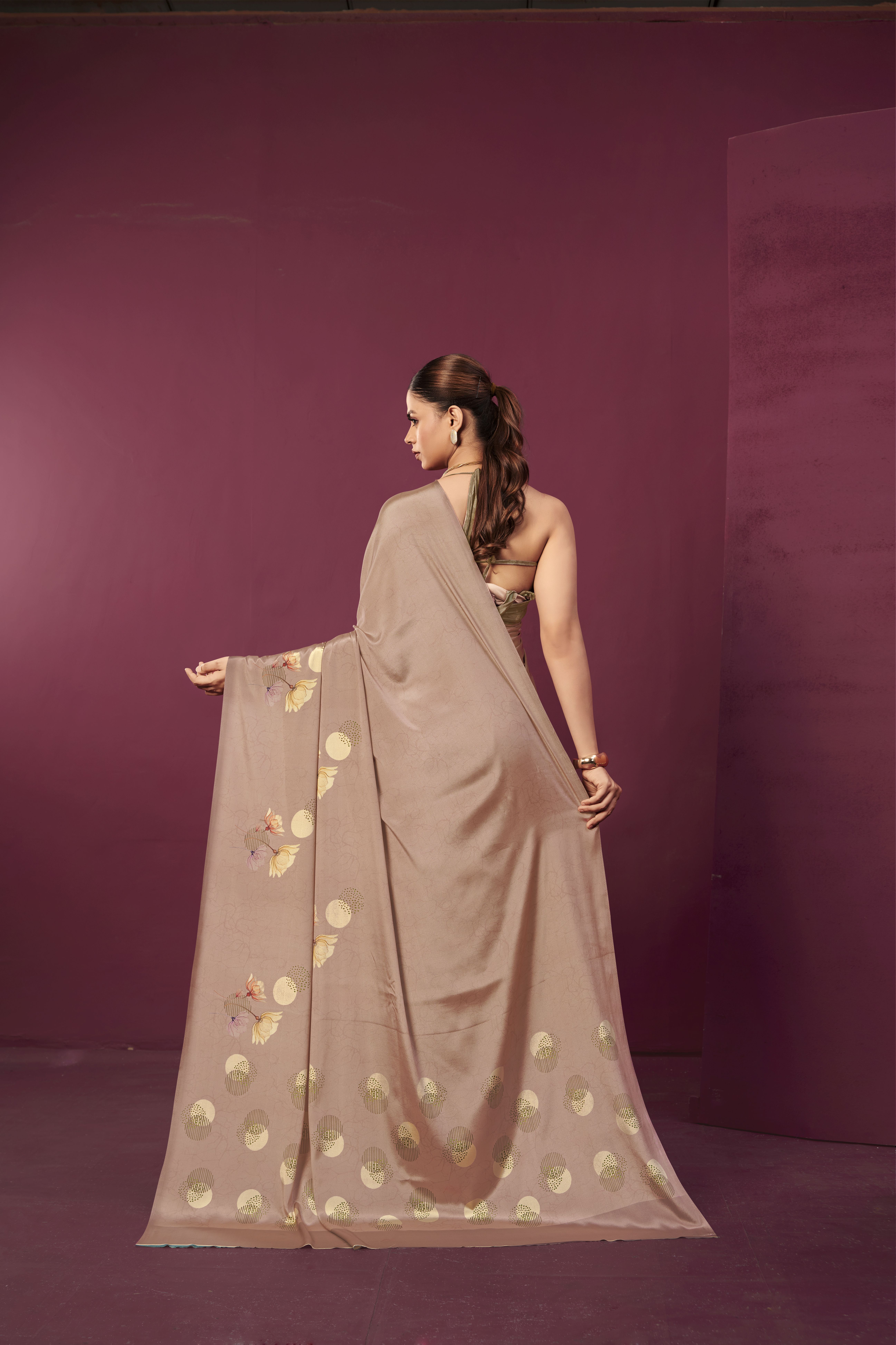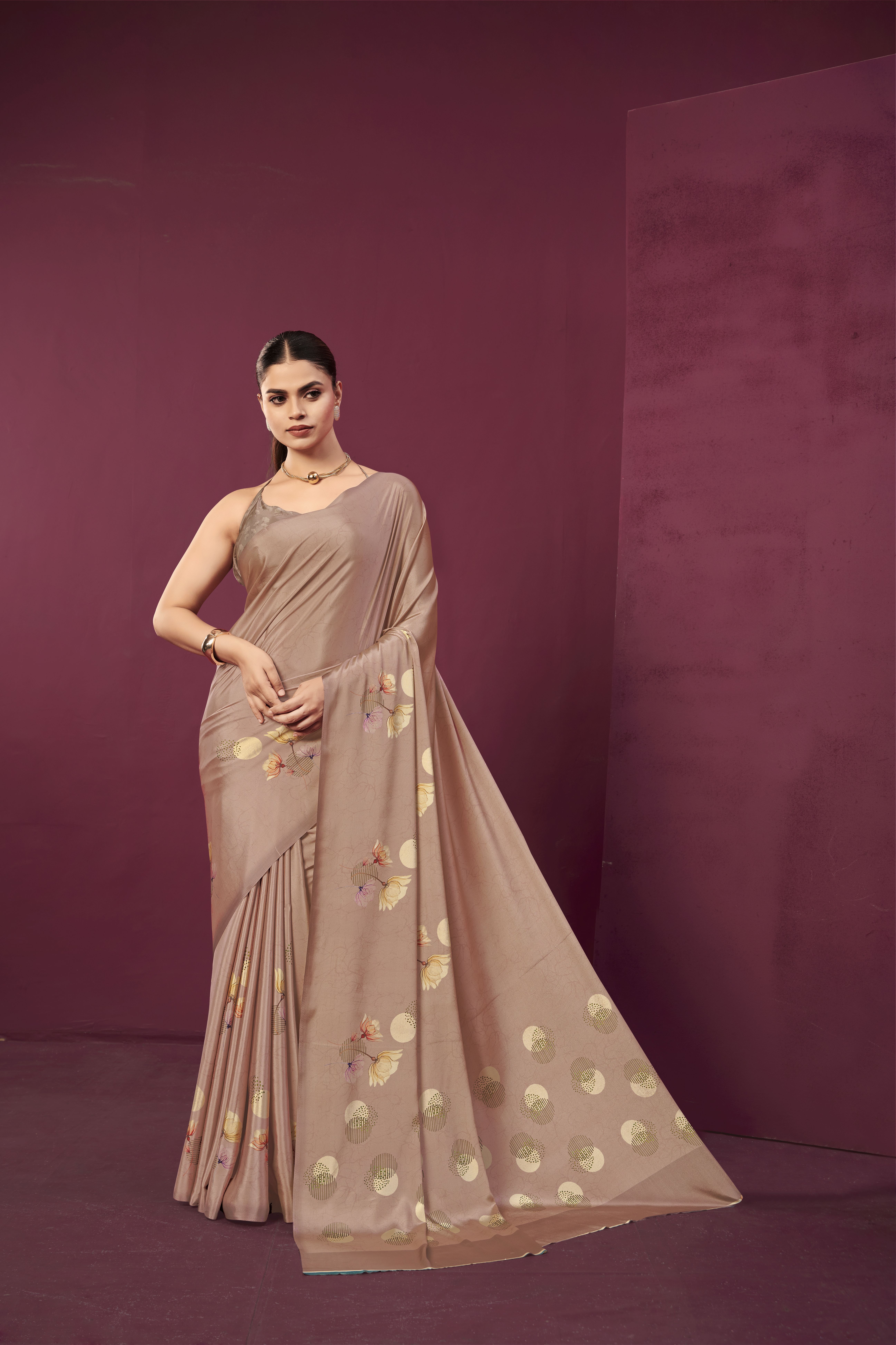 Brown Color Malai Crepe Silk Fabric Designer Digital Printed Ceremonial Partywear Saree