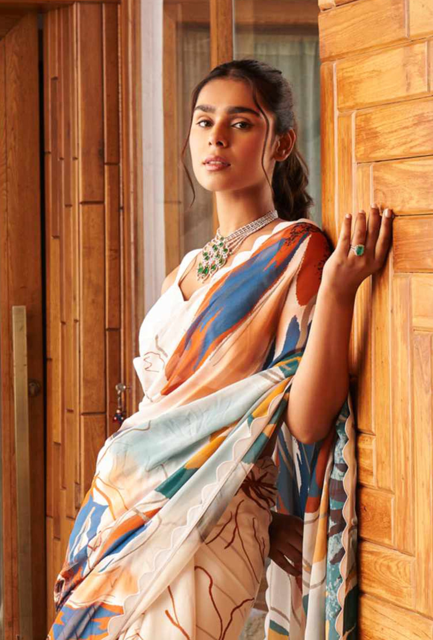 Cream Color Bright Moss Fabric Ethnic Partywear Designer Printed Saree