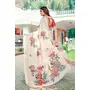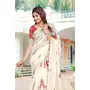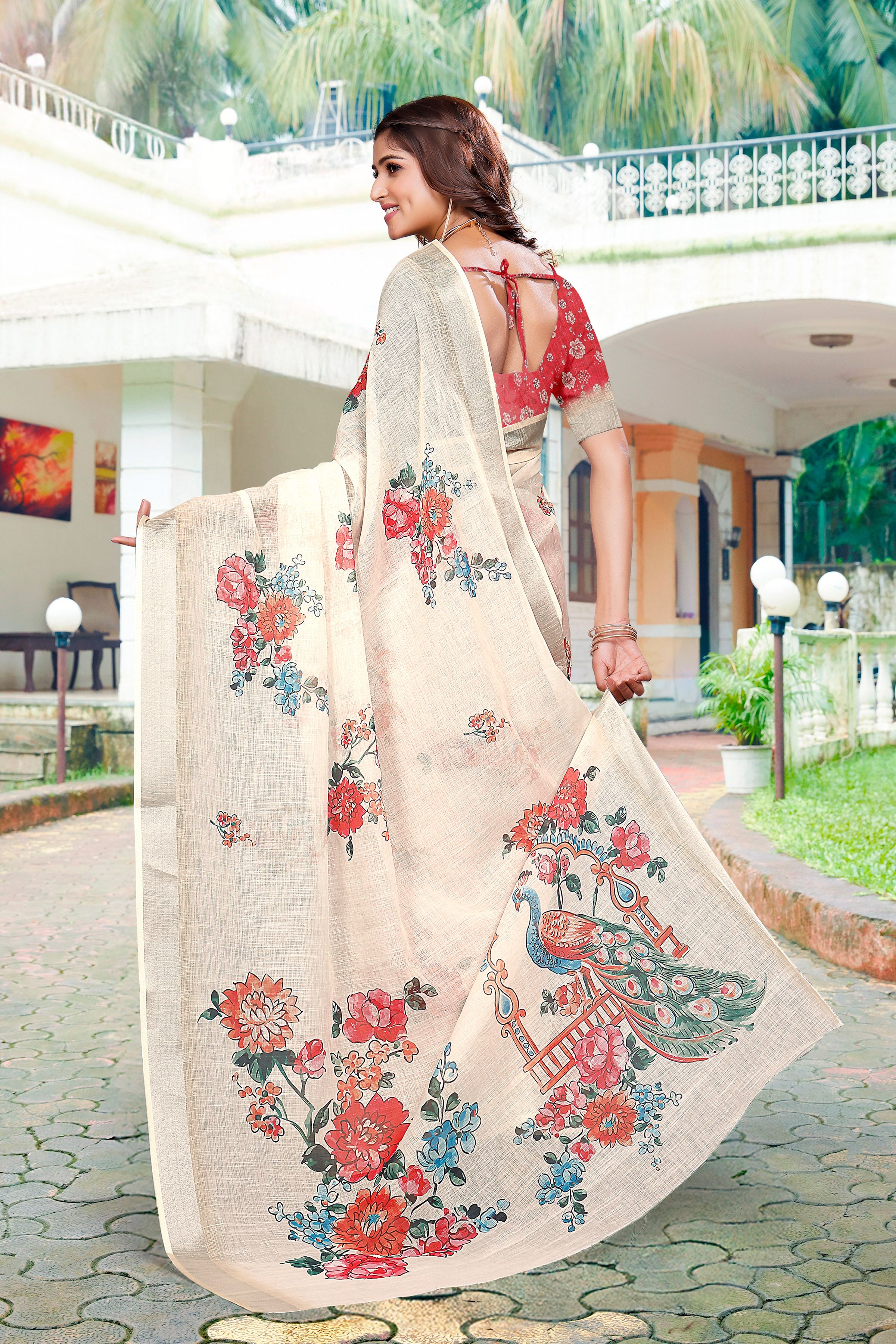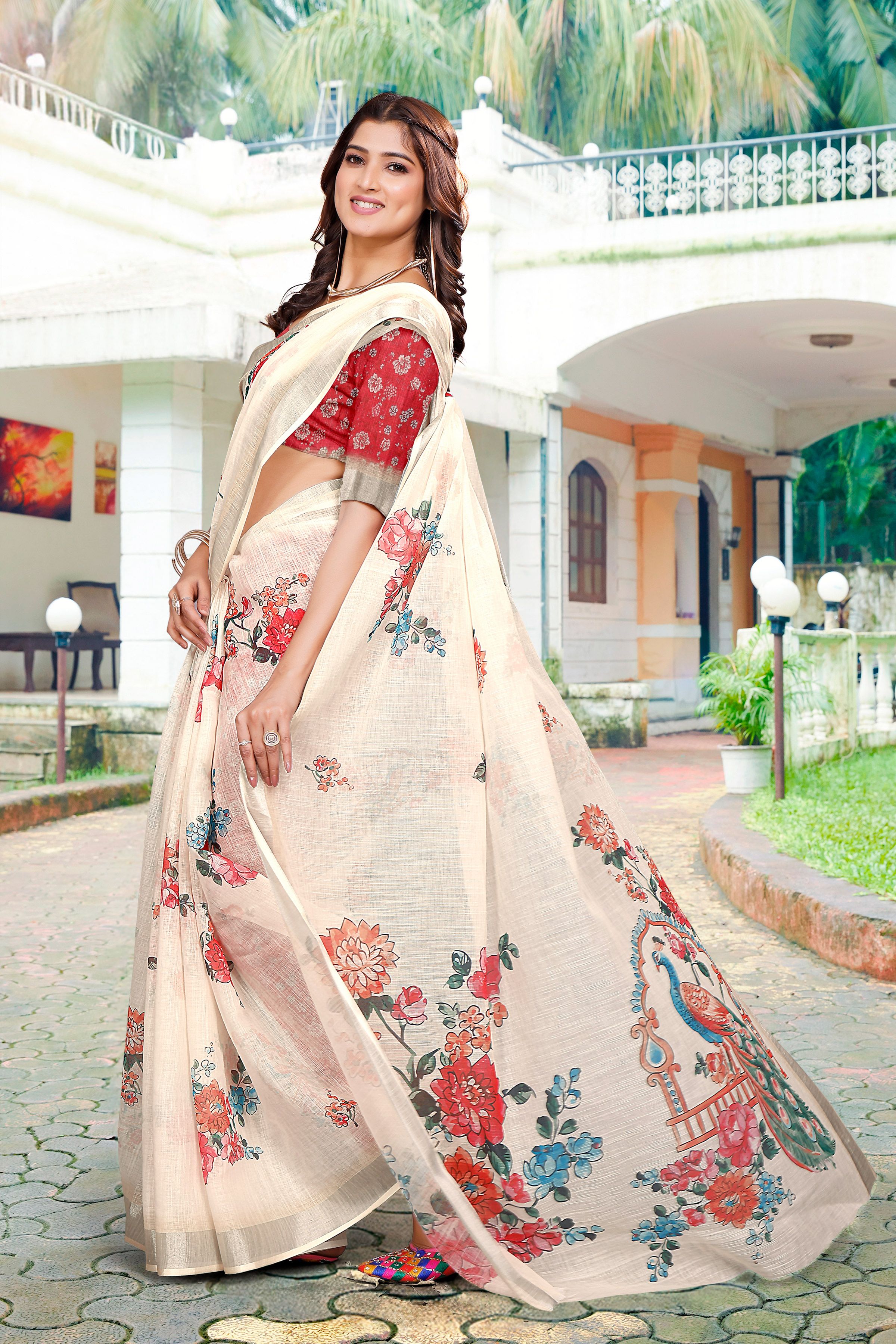 Cream Color Linen Cotton Fabric Beautiful Festive Special Saree