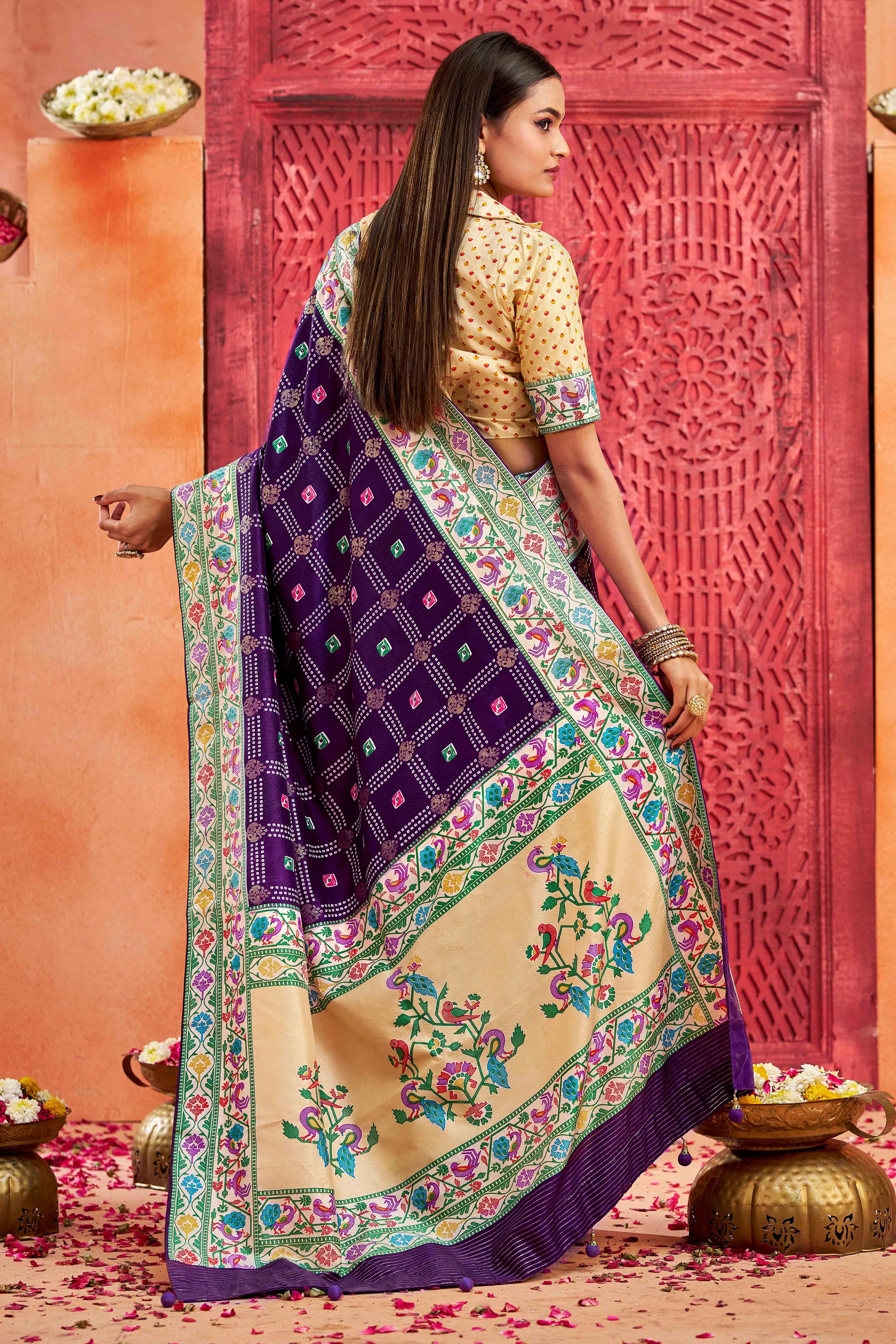 Dark Purple Color Velvet Tussar Silk Fabric Partywear Saree With Paithani Pallu And Traditional Ghatchola Print
