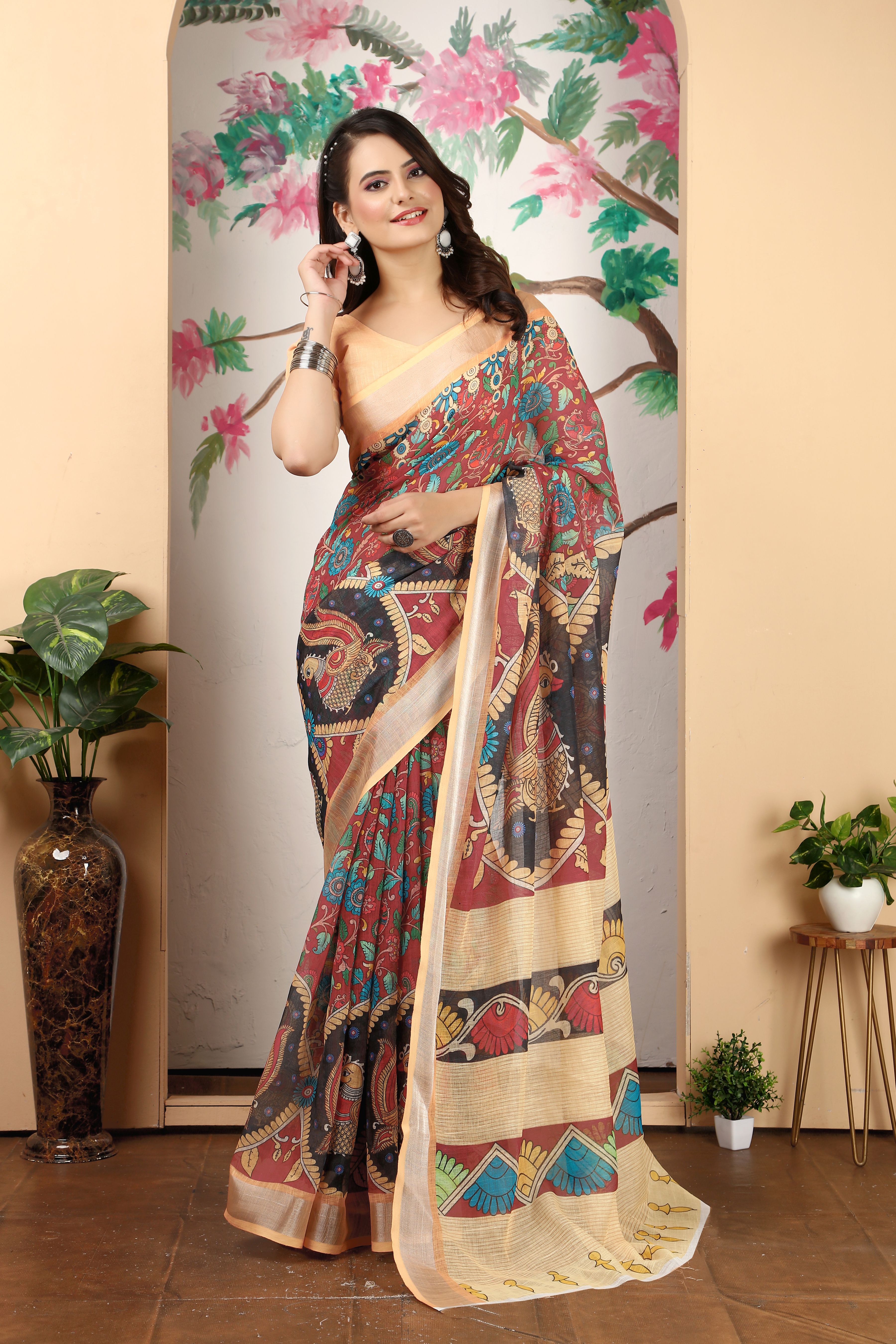 Attractive These Festive Saree in Fine Colored.These Saree Are Linen Cotton And Blouse is Fabricated On Linen Cotton Pair.Its Beautified With Wevon Jari Border Designer With Digital Printed.