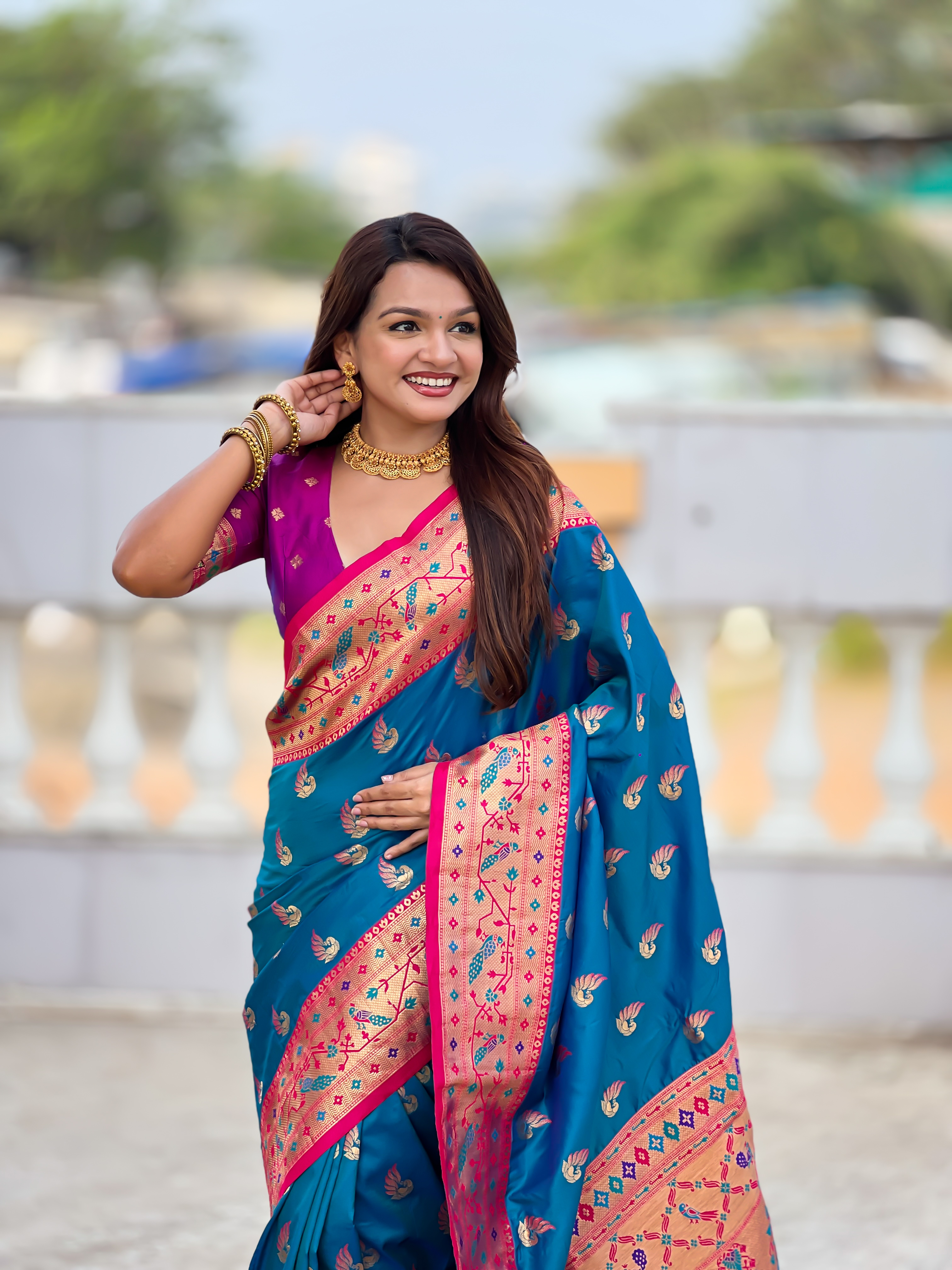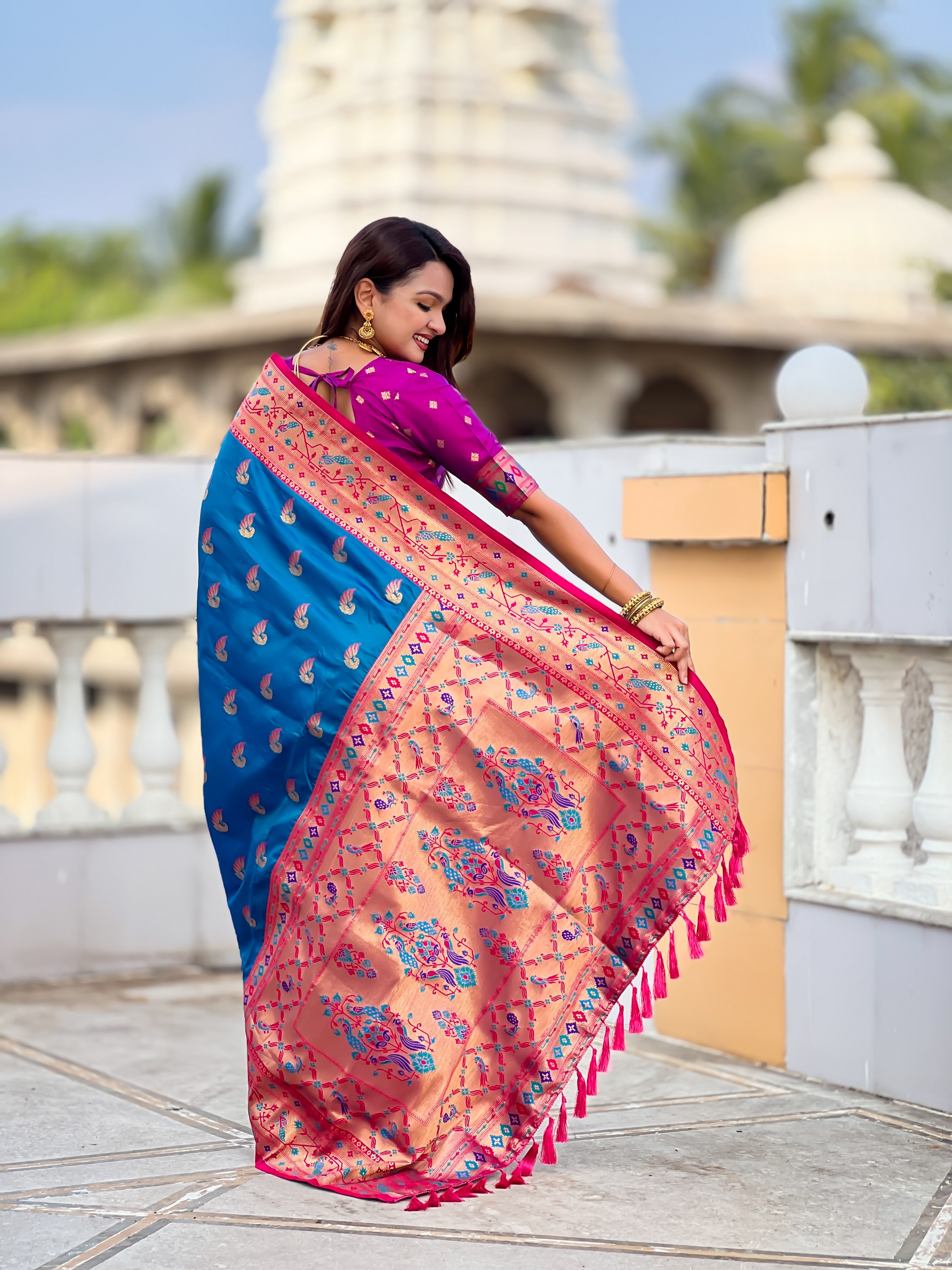 Firozi Color Paithani Silk Woven Meenakari Jacquard Designer Saree
