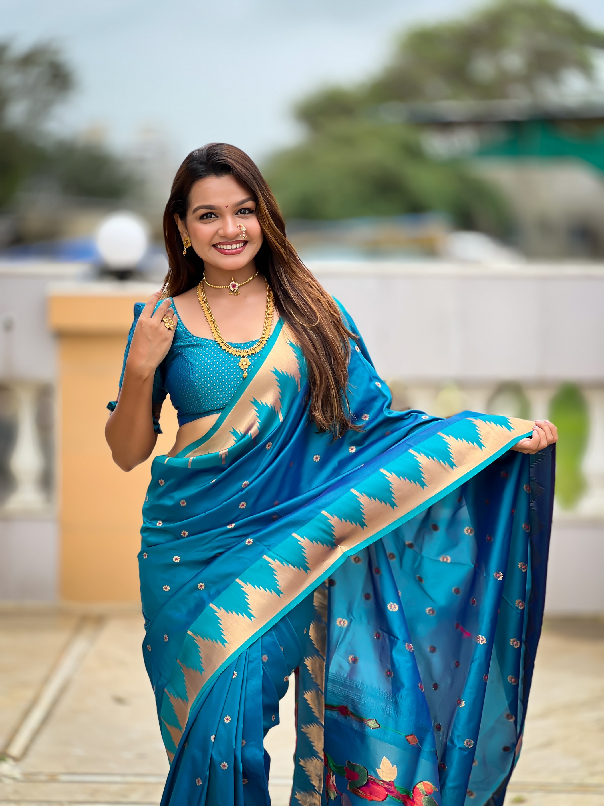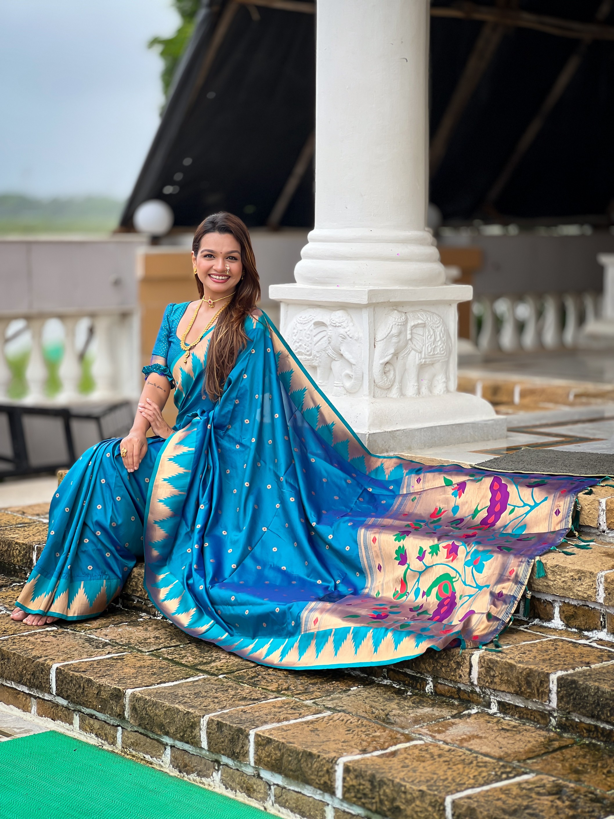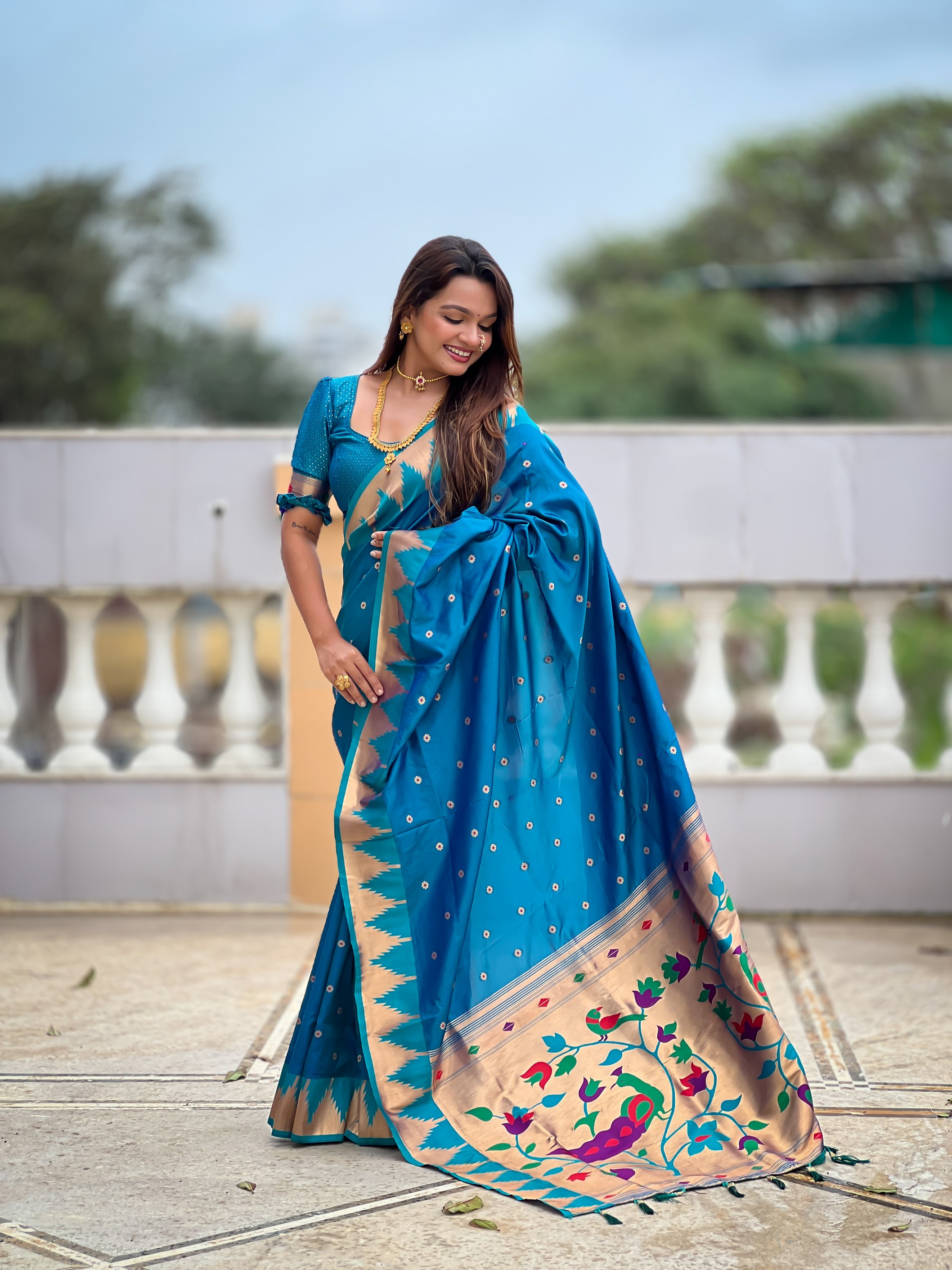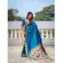 Firozi Color Sophisticated Paithani Silk Fabric Woven Jacquard Meenakari Designer Saree