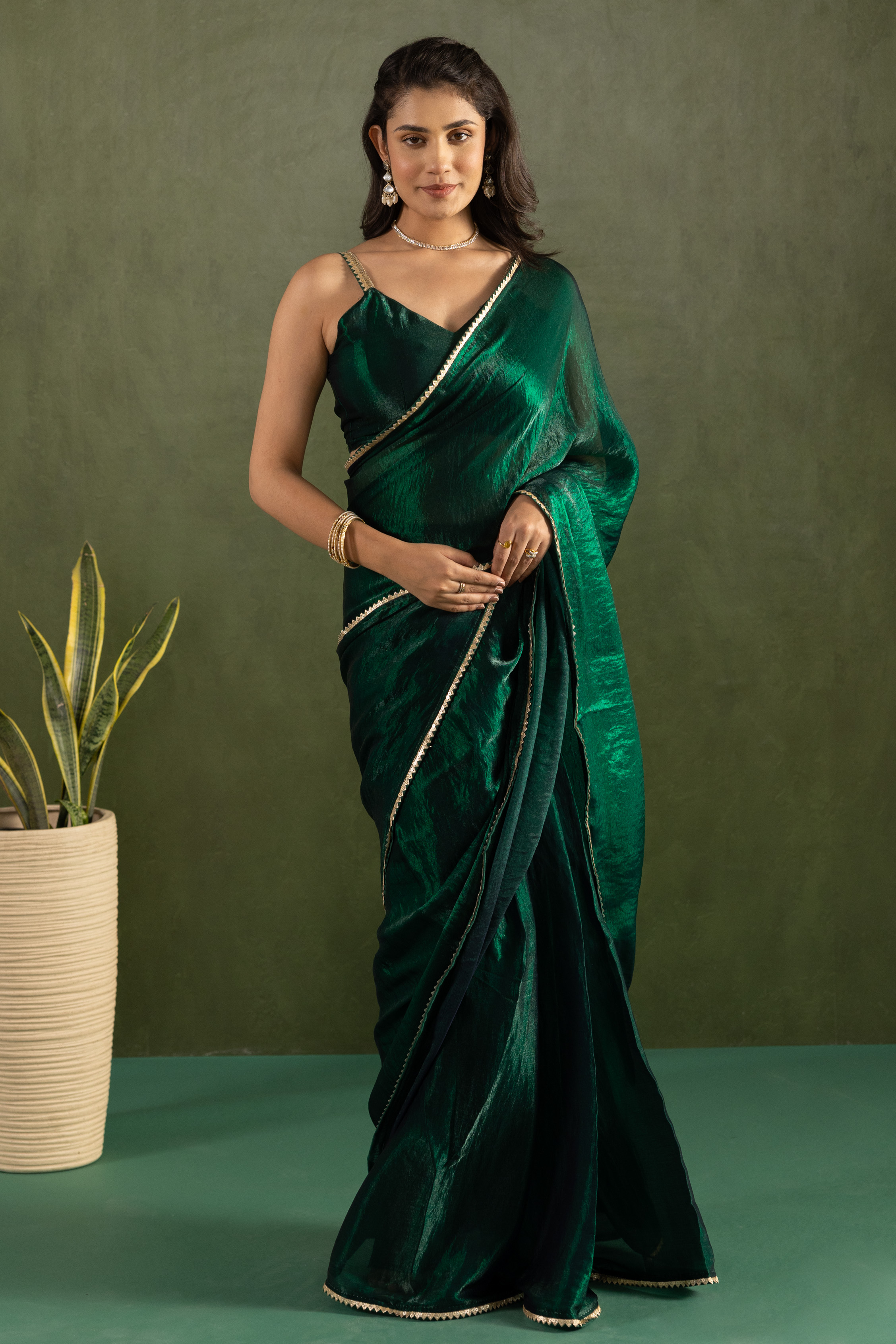 Green Color Chiffon Fabric Ready To Wear Designer Solid Partywear Saree