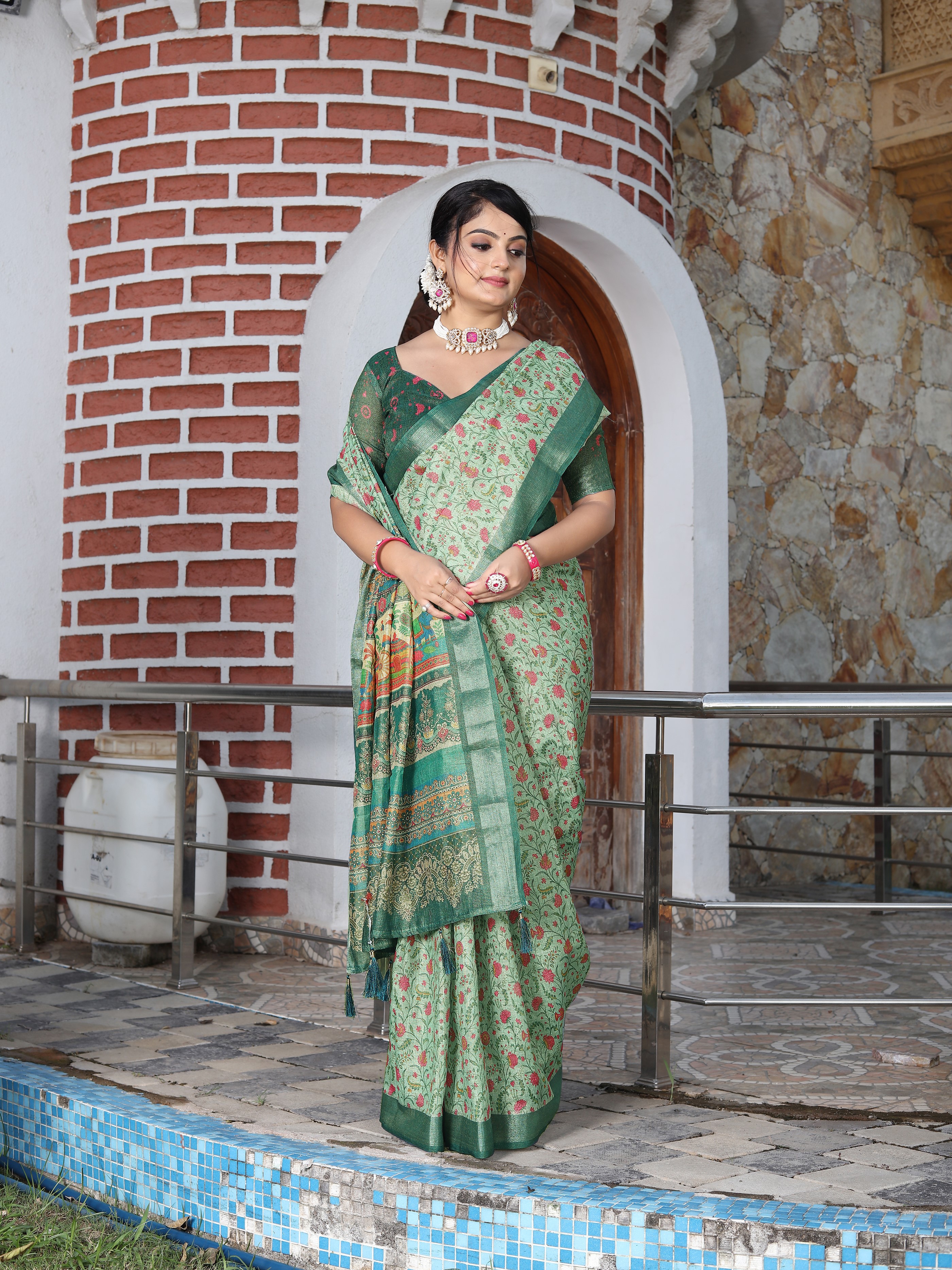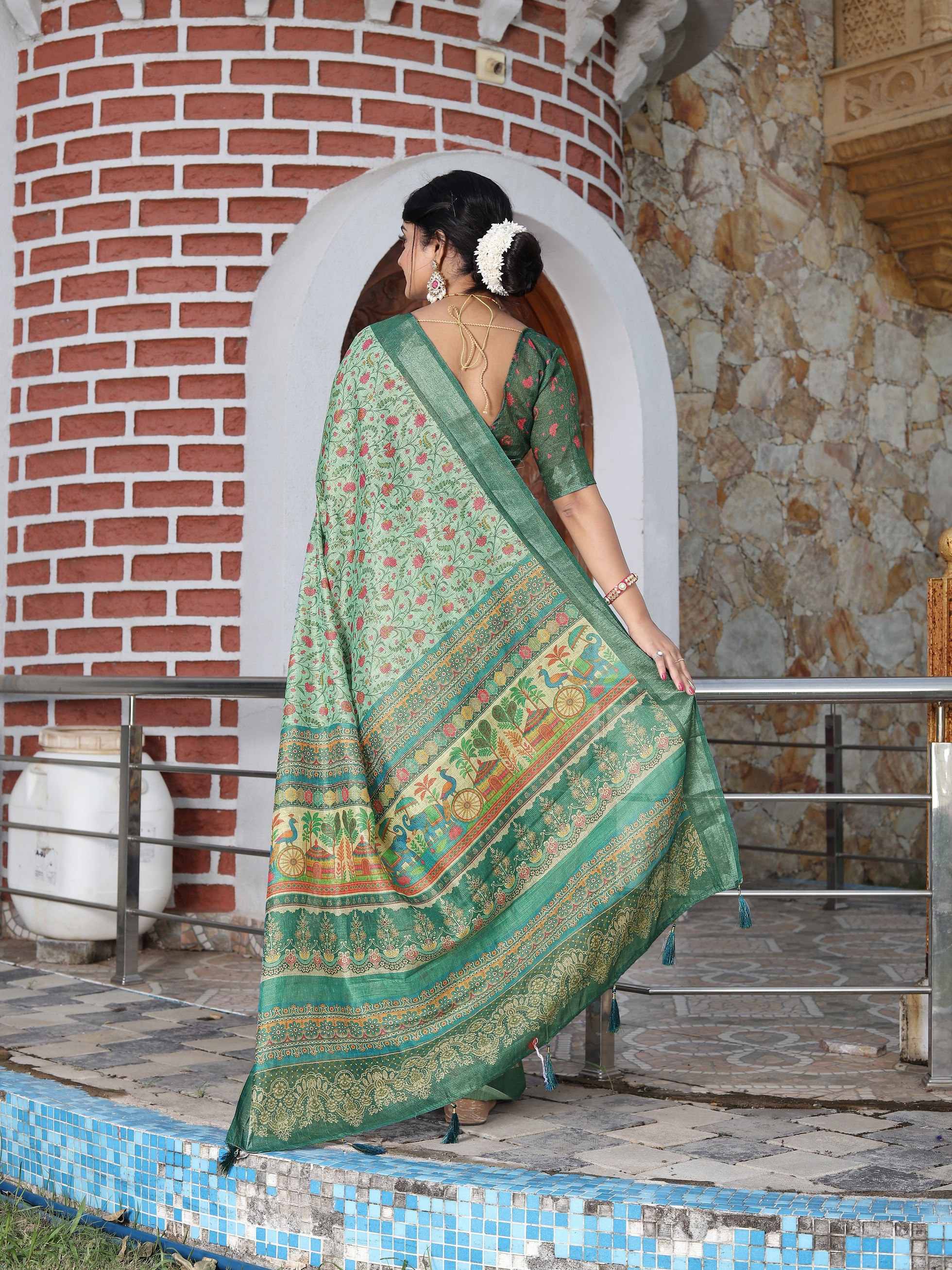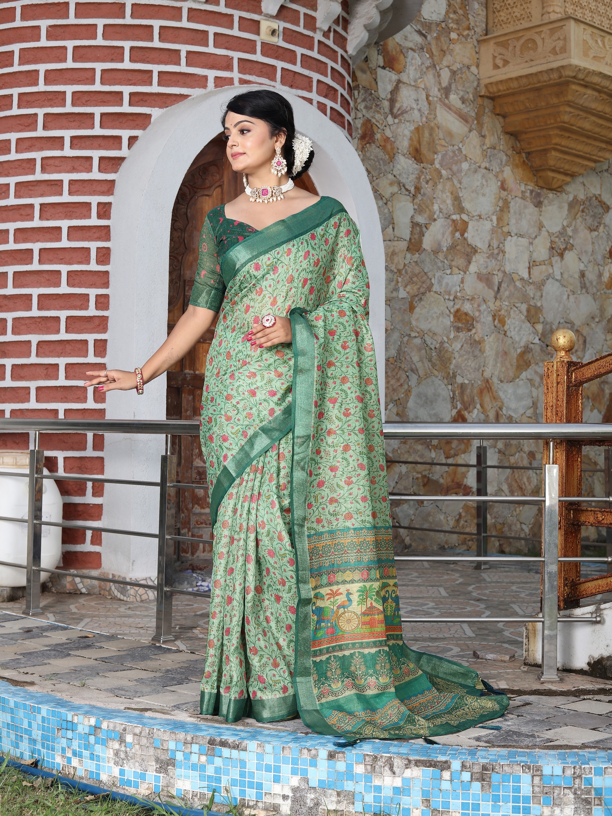 Green Color Cotton Shimmer Fabric Smart Printed Saree With Woven Border