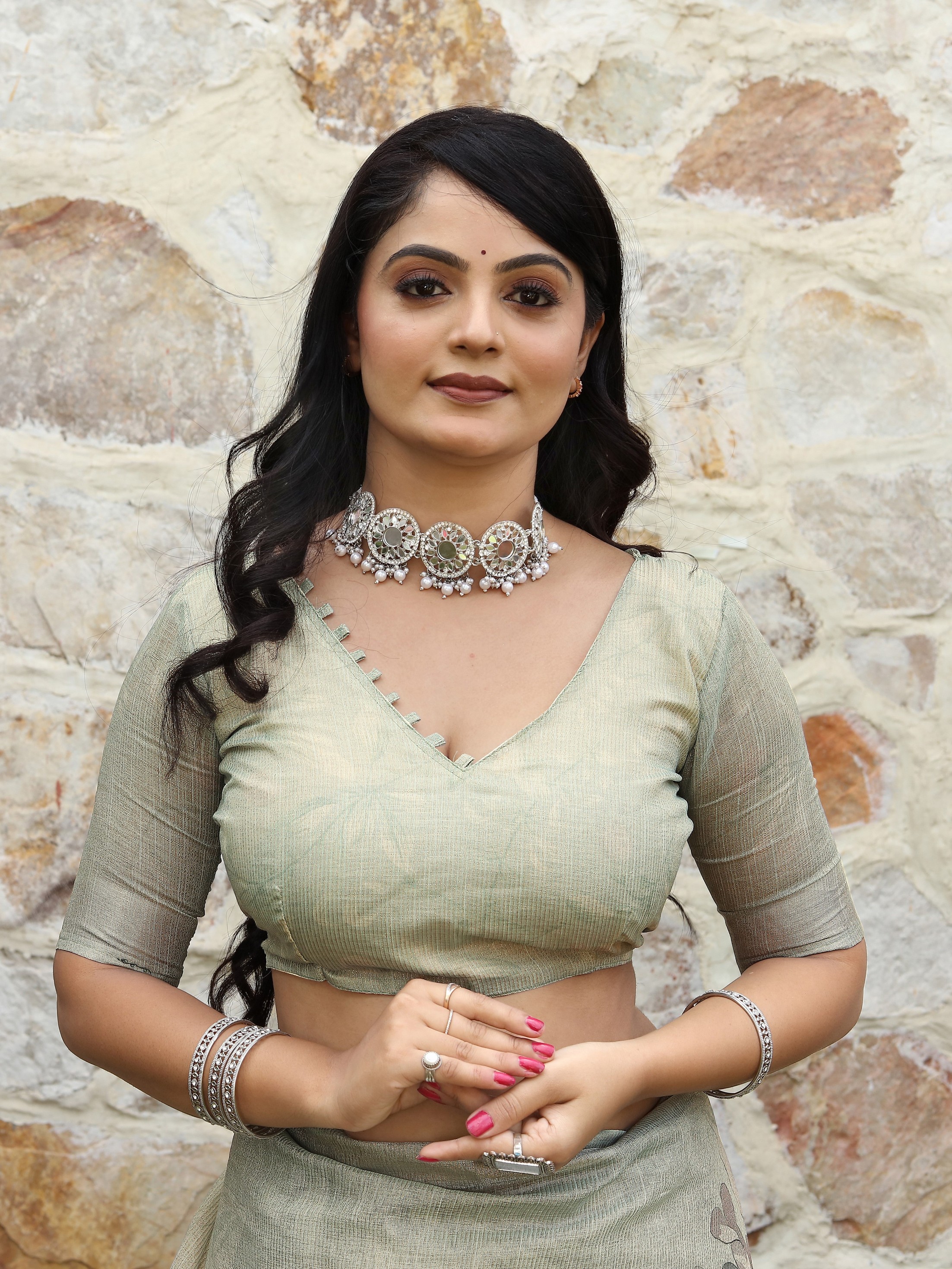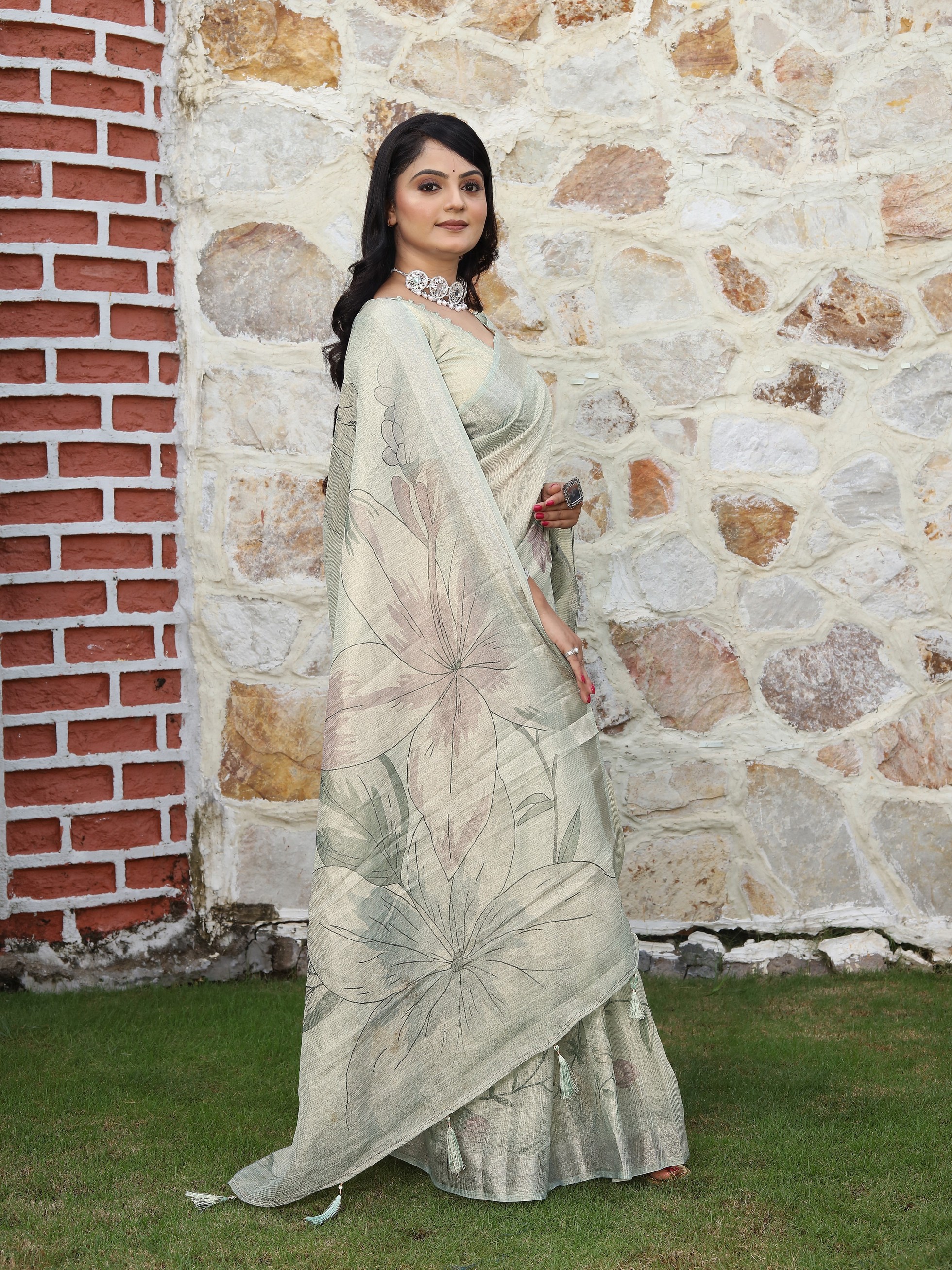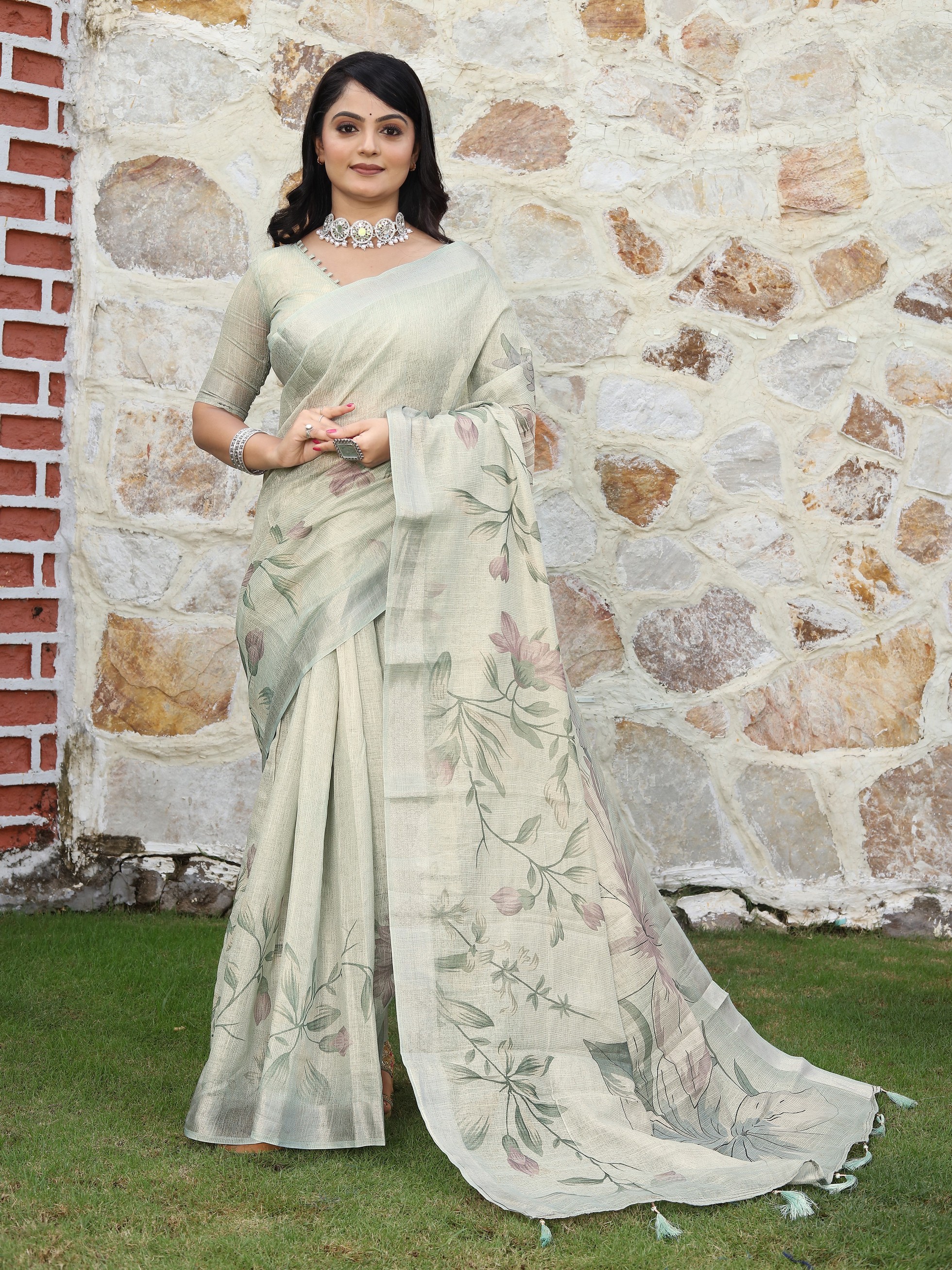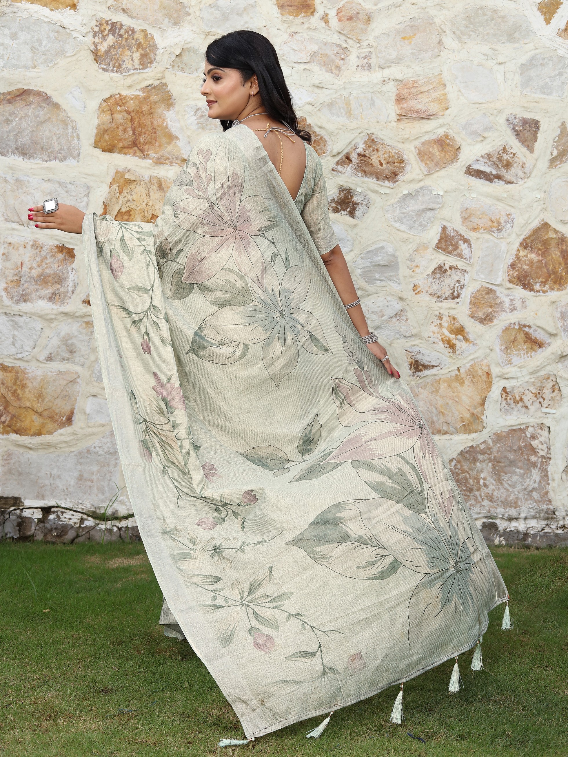Grey Color Cotton Shimmer Fabric Smart Printed Saree With Woven Border