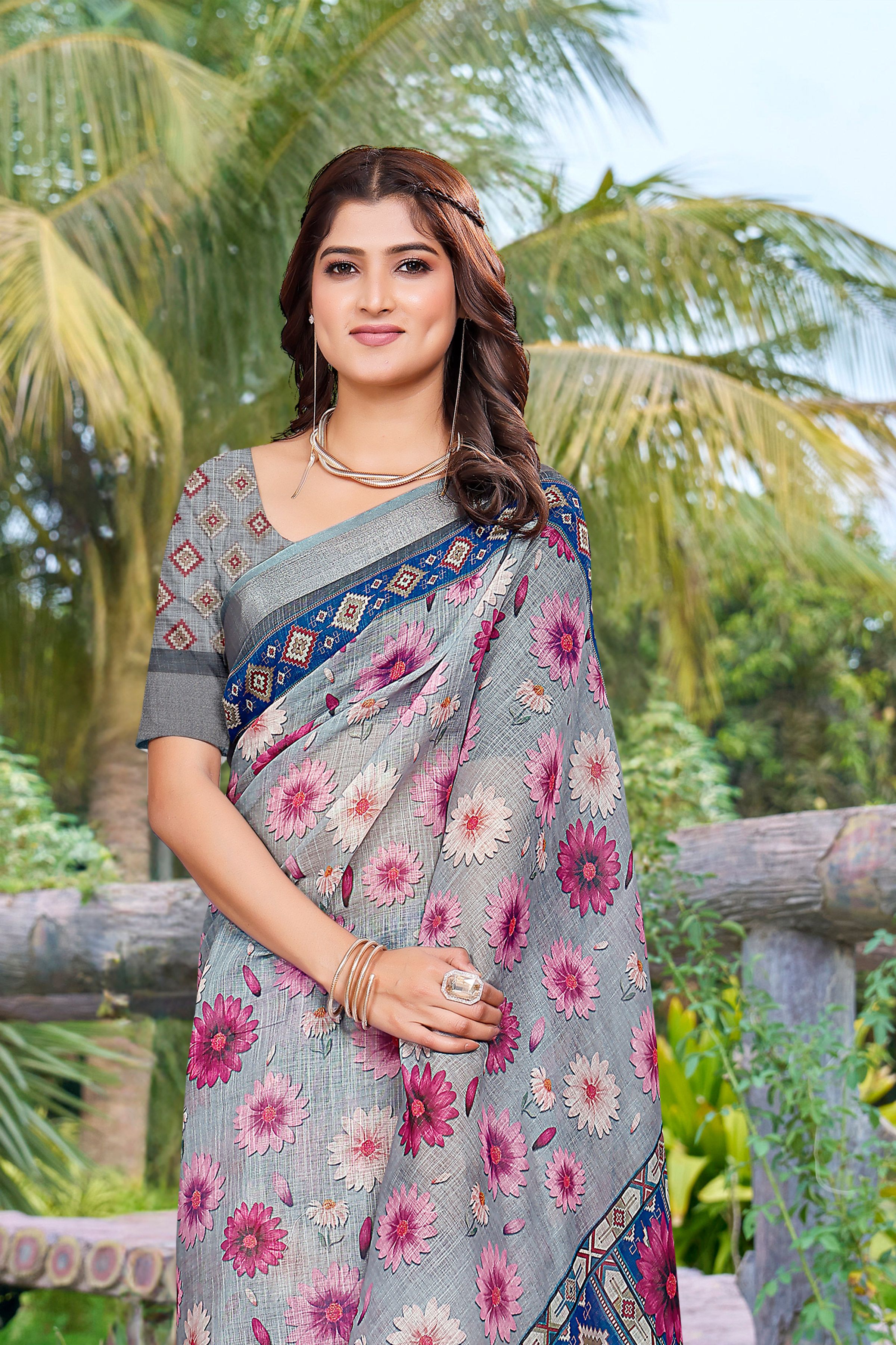 Grey Color Linen Cotton Fabric Beautiful Festive Special Saree