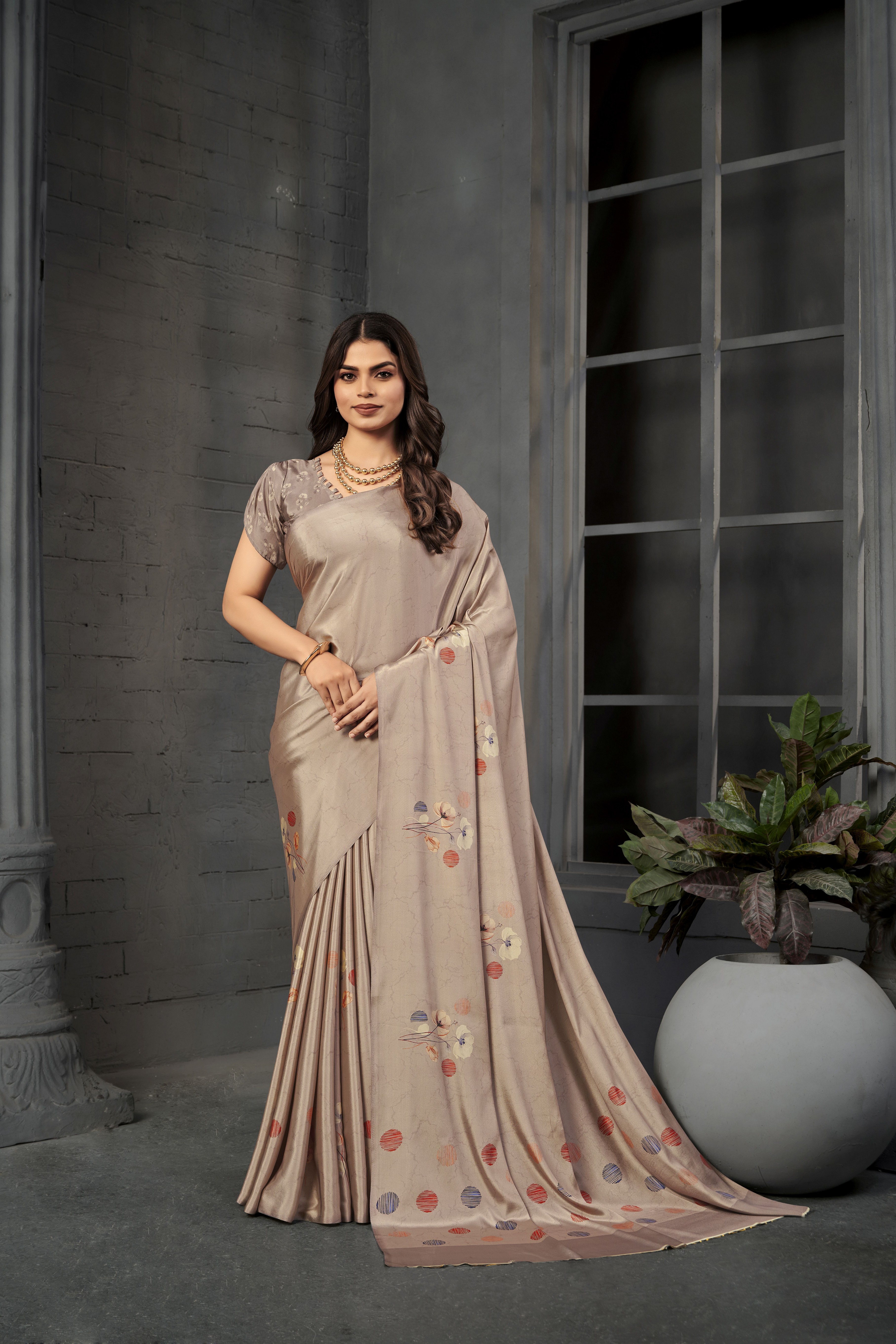 Grey Color Malai Crepe Silk Fabric Designer Digital Printed Beautiful Fancy Partywear Saree