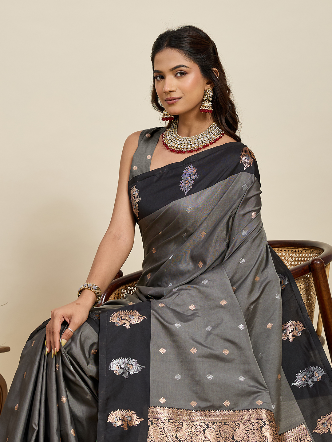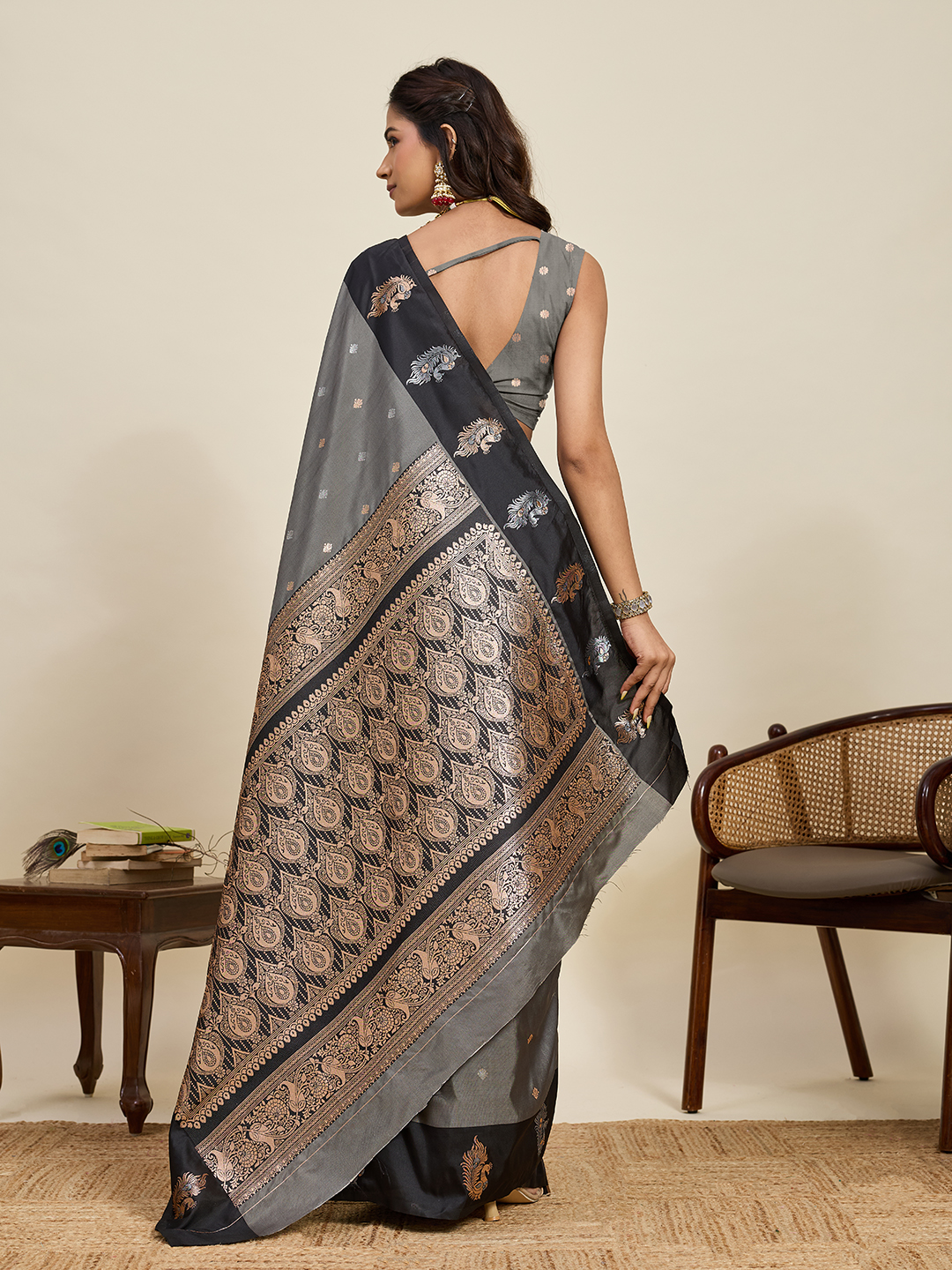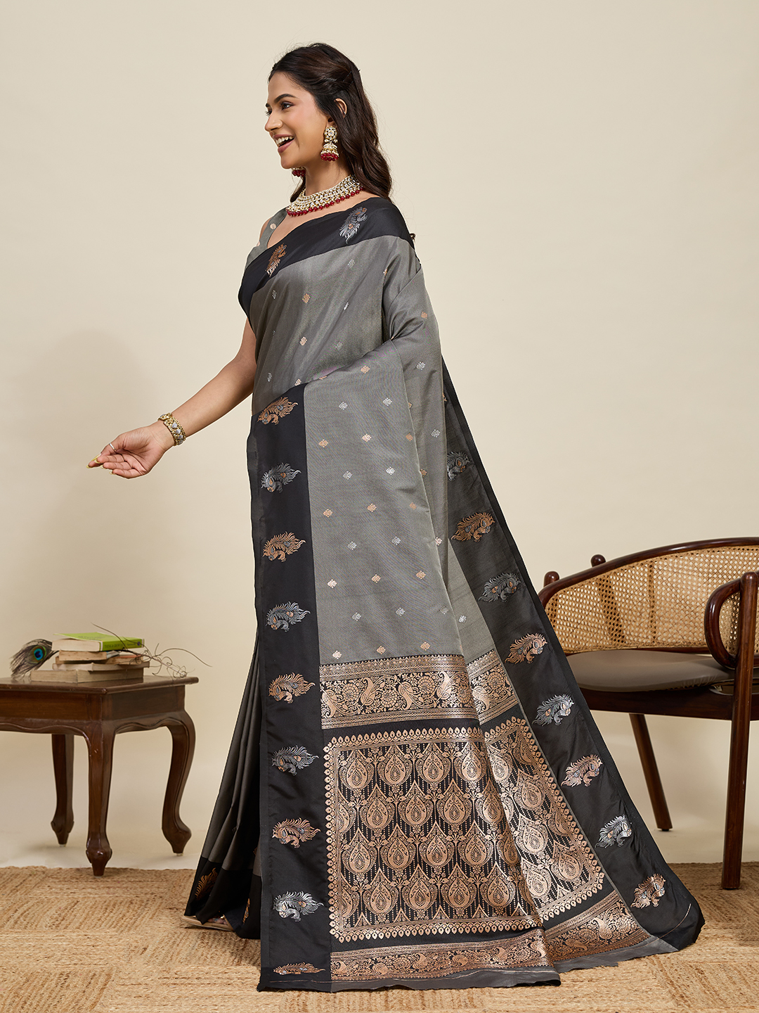 Grey Color Soft Silk Fabric Designer Ethnic Woven Traditional Saree