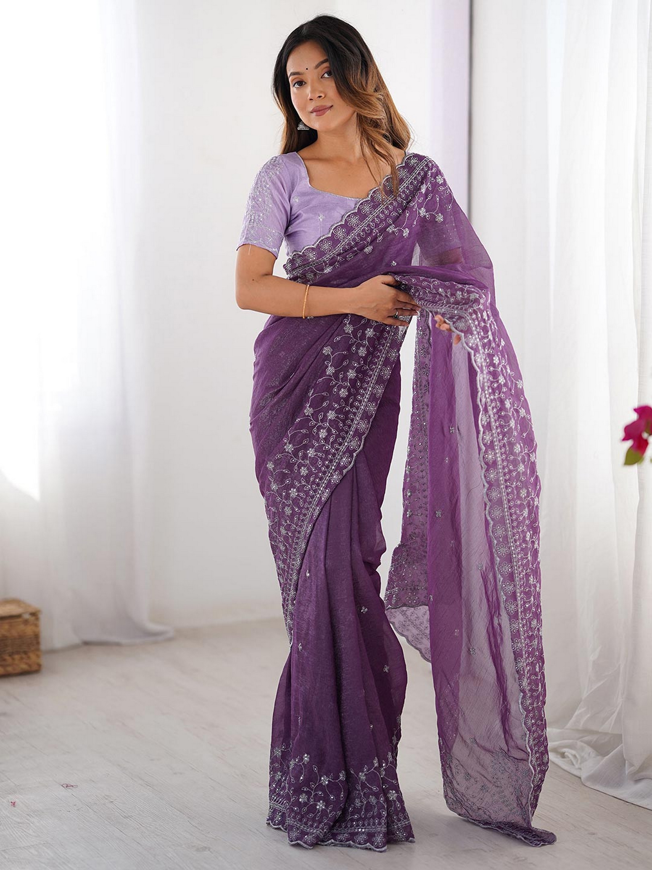 Lavender Color Crunchy Silk Fabric Embroidered Partywear Saree