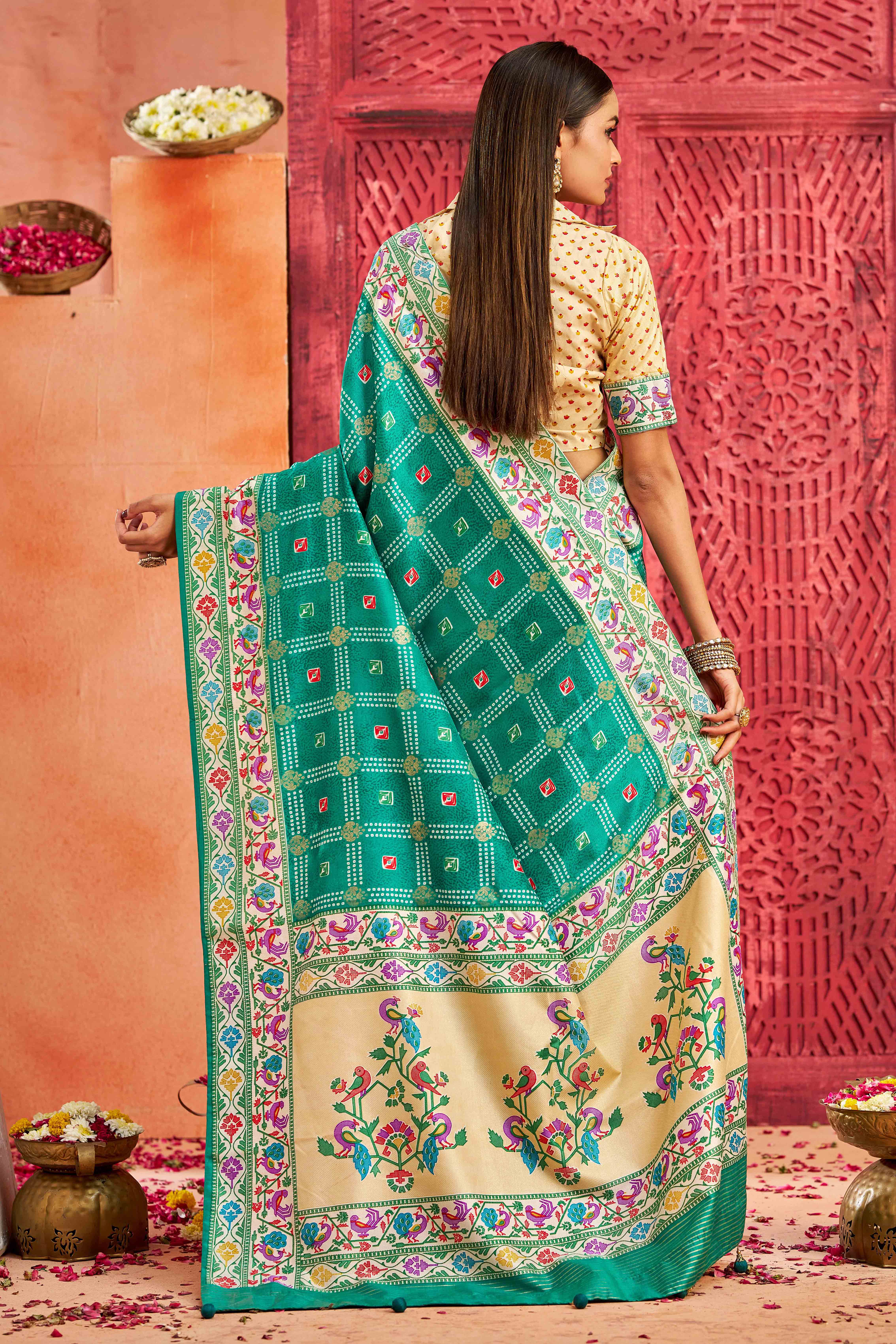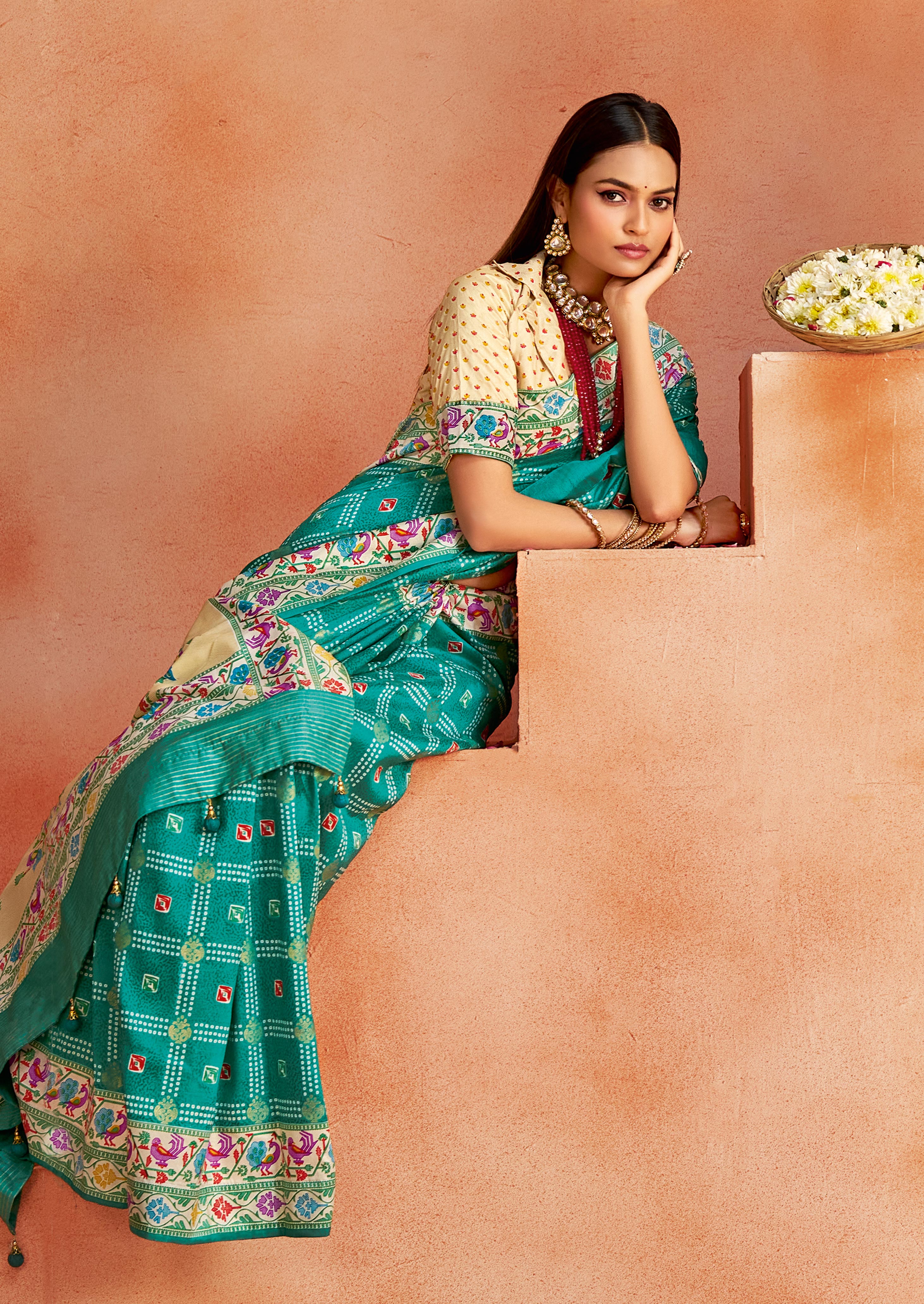Light Firozi Color Velvet Tussar Silk Fabric Partywear Saree With Paithani Pallu And Traditional Ghatchola Print
