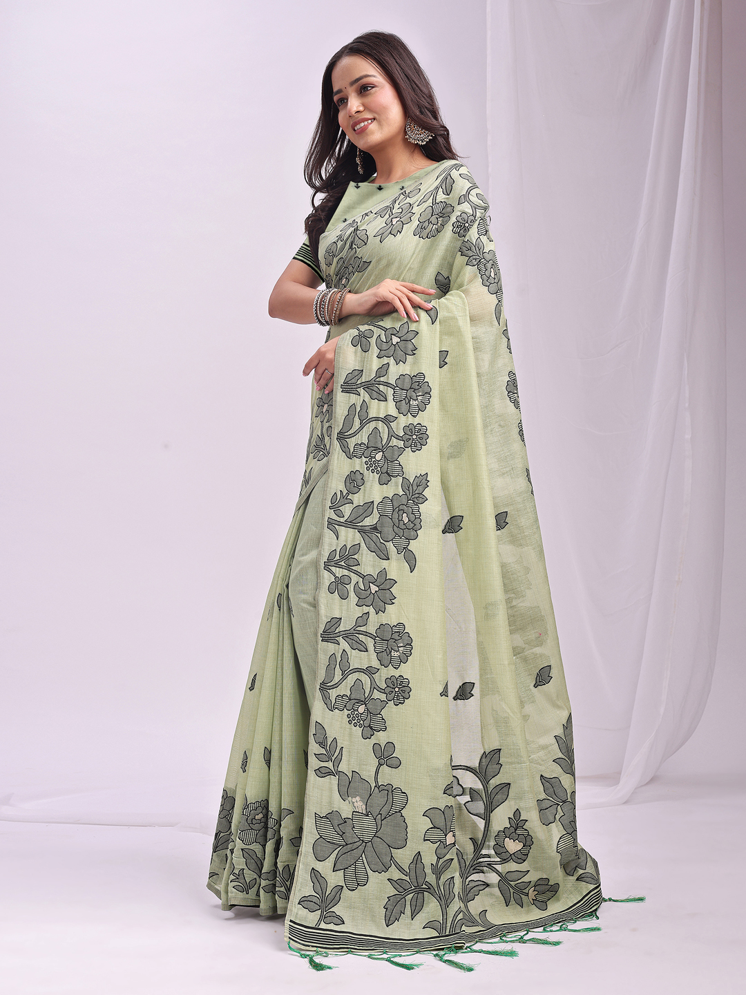 Light Green Color Linen Cotton Fabric Wevon Thread Designer Festive Sophisticated Saree