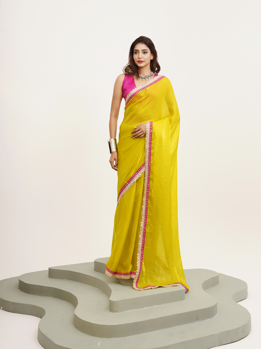 Made using high-quality fabrics such as silk, soft silk, georgette, organza, chiffon, crepe, linen, cotton blends ...etc .