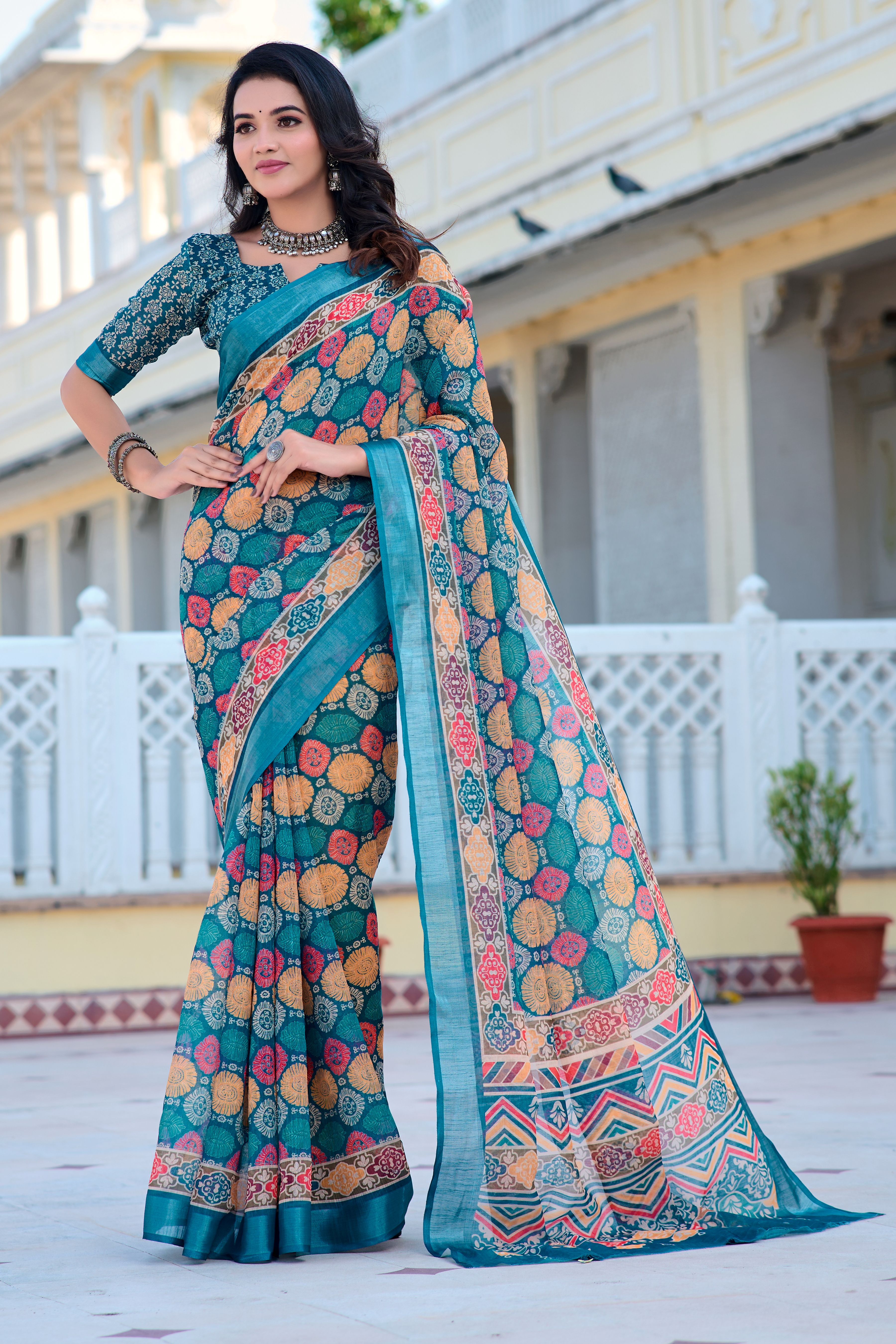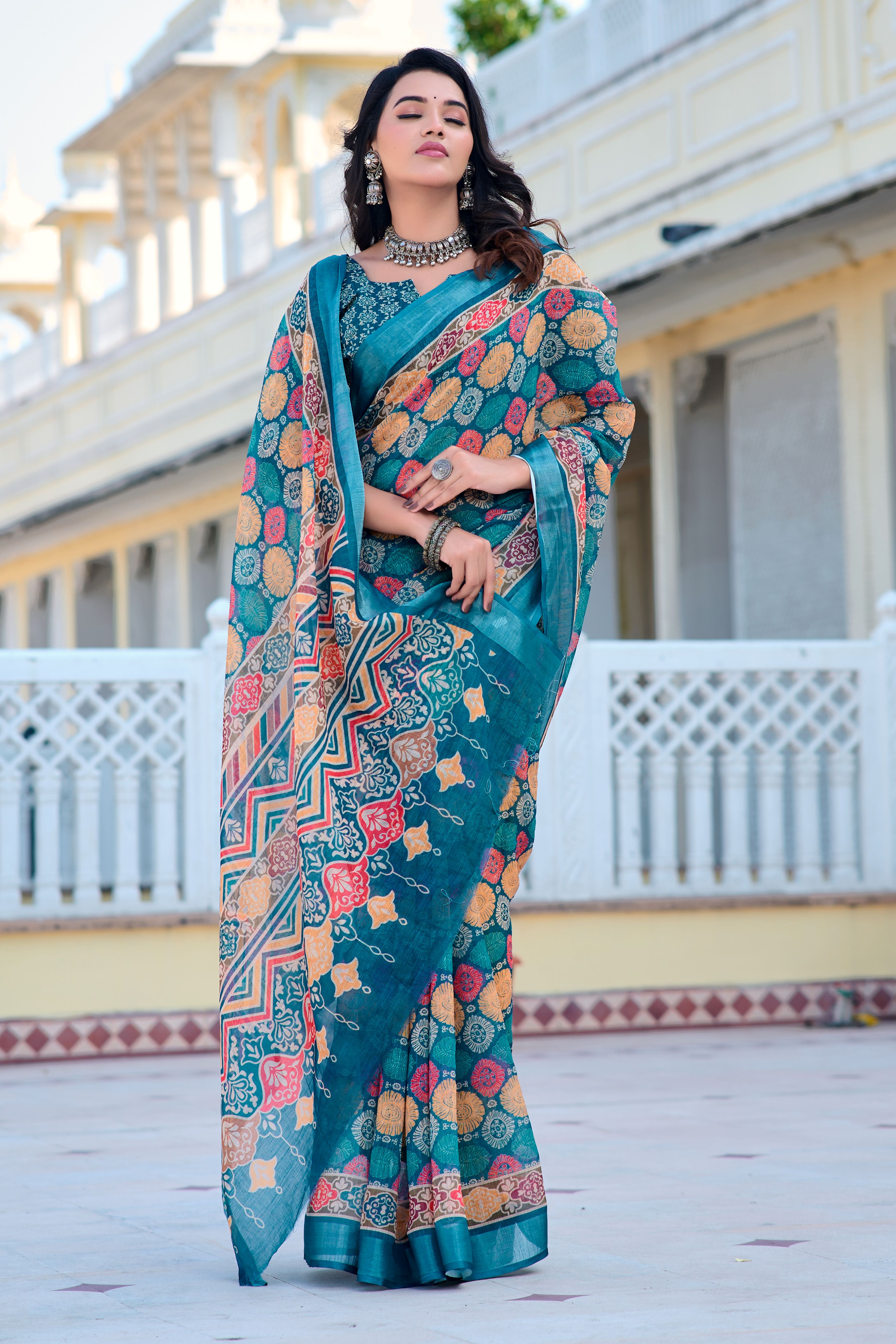 Garb These Festive Saree in Fine Colored.These Saree Are Linen Cotton And Blouse is Fabricated On Linen Cotton Pair.Its Beautified With Woven Jari Border With Designer Digital Printed.