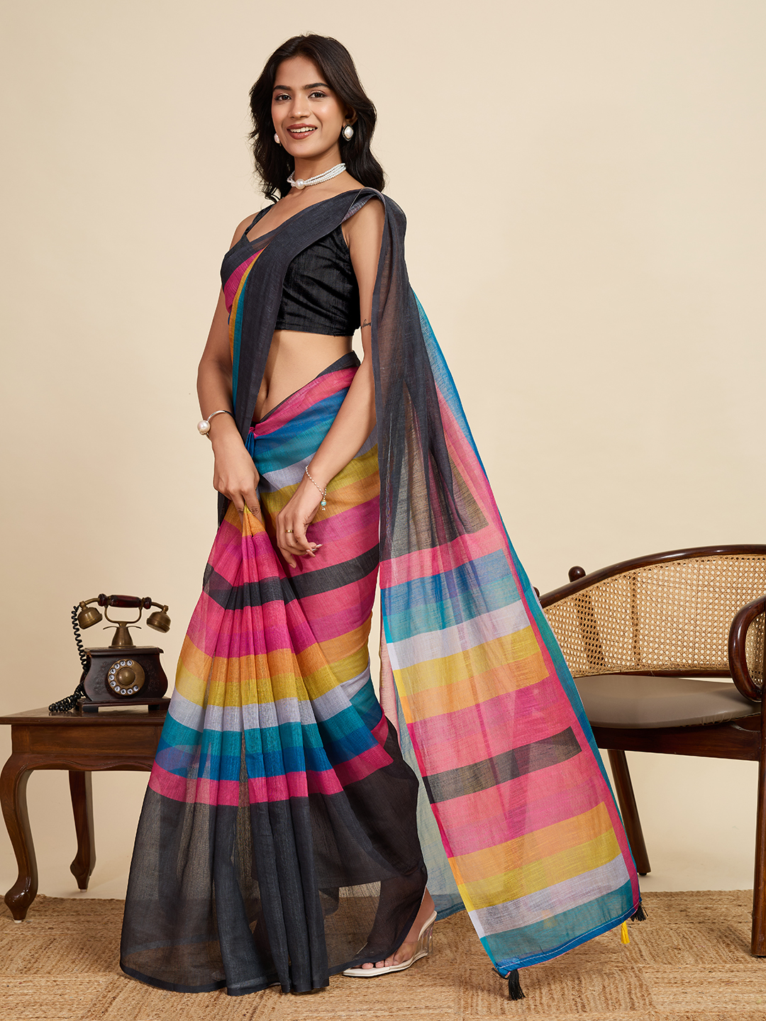 MultiColor Linen Fabric Beautiful Printed Ceremonial Saree