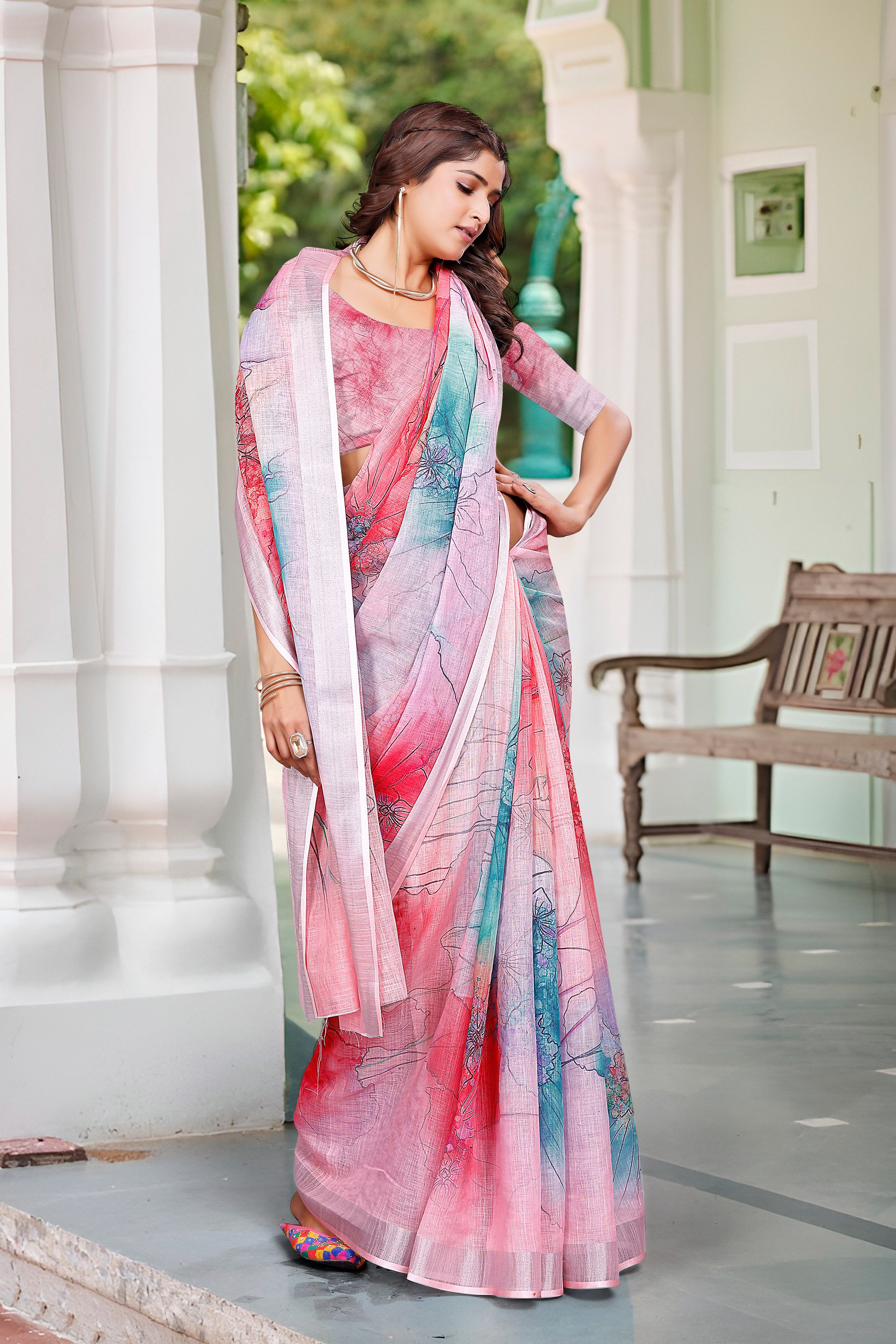 Garb These Festive Saree in Fine Colored.These Saree Are Linen Cotton And Blouse is Fabricated On Linen Cotton Pair.Its Beautified With Wevon Jari Border With Designer Digital Printed.