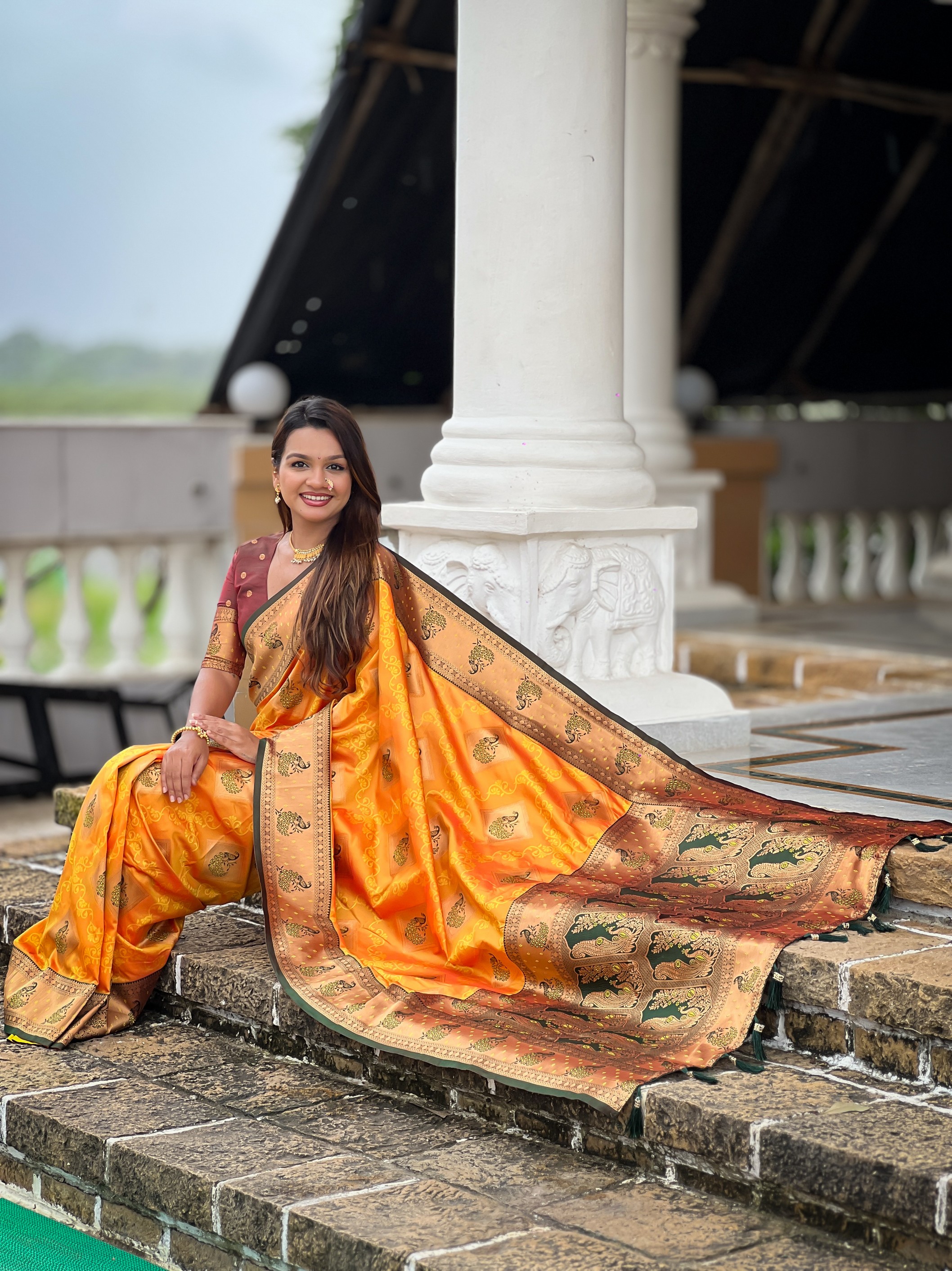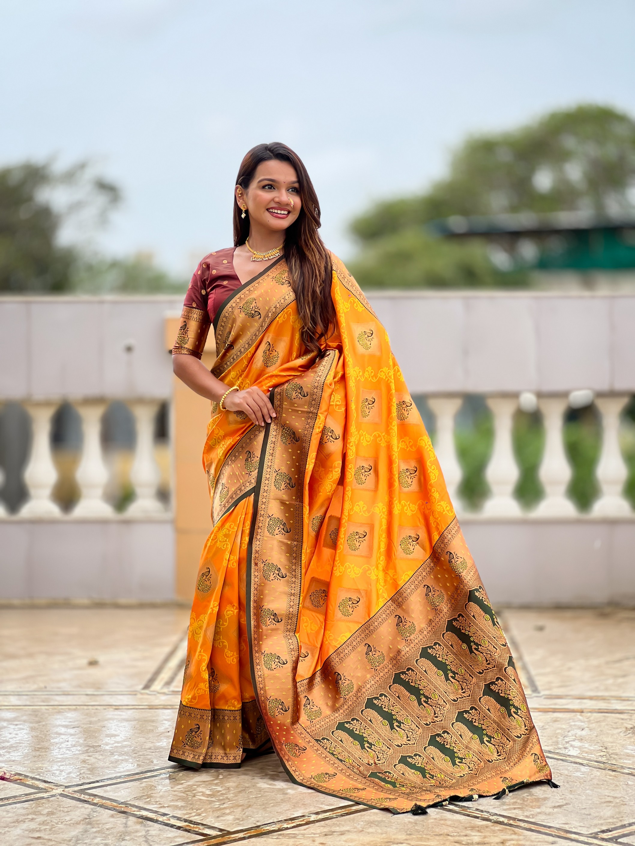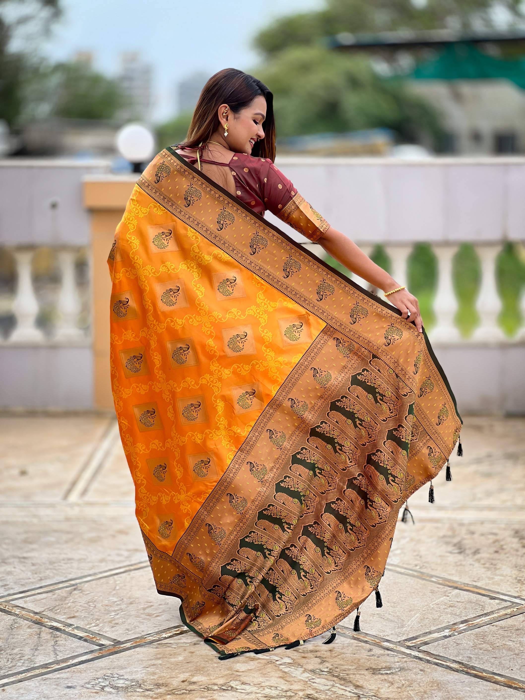 Mustard Color Beautiful Woven Designer Meenakari Banarasi Silk Saree