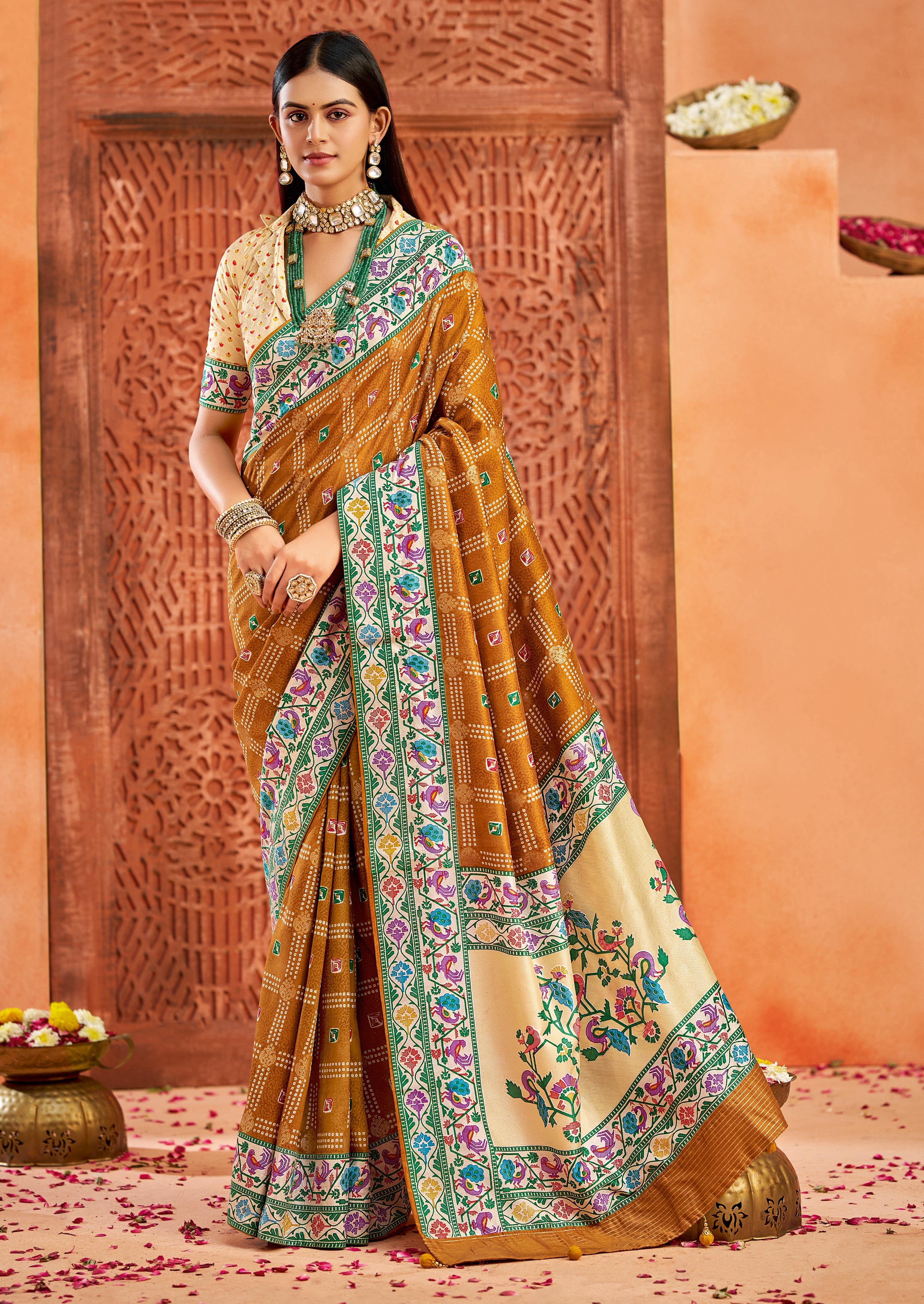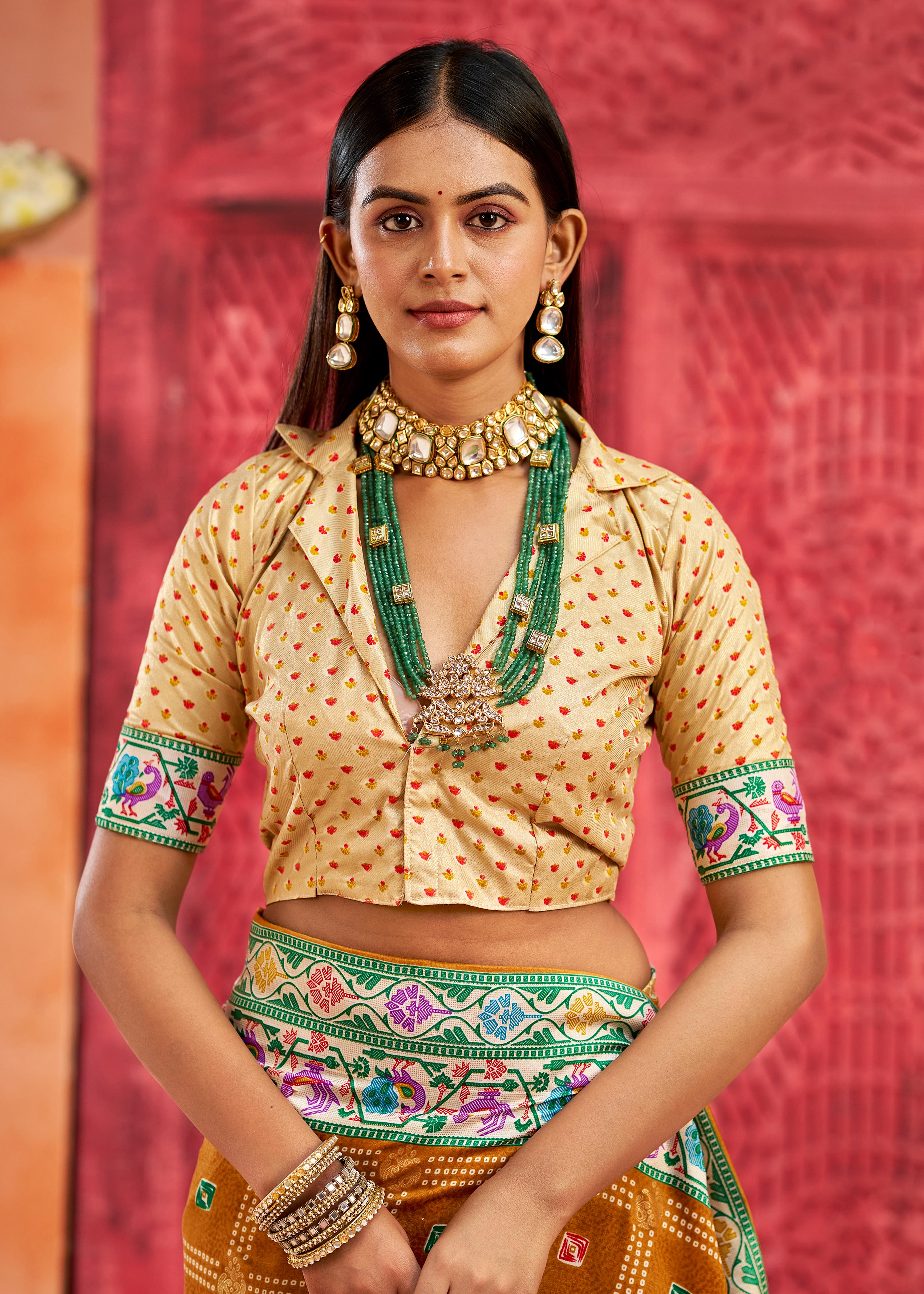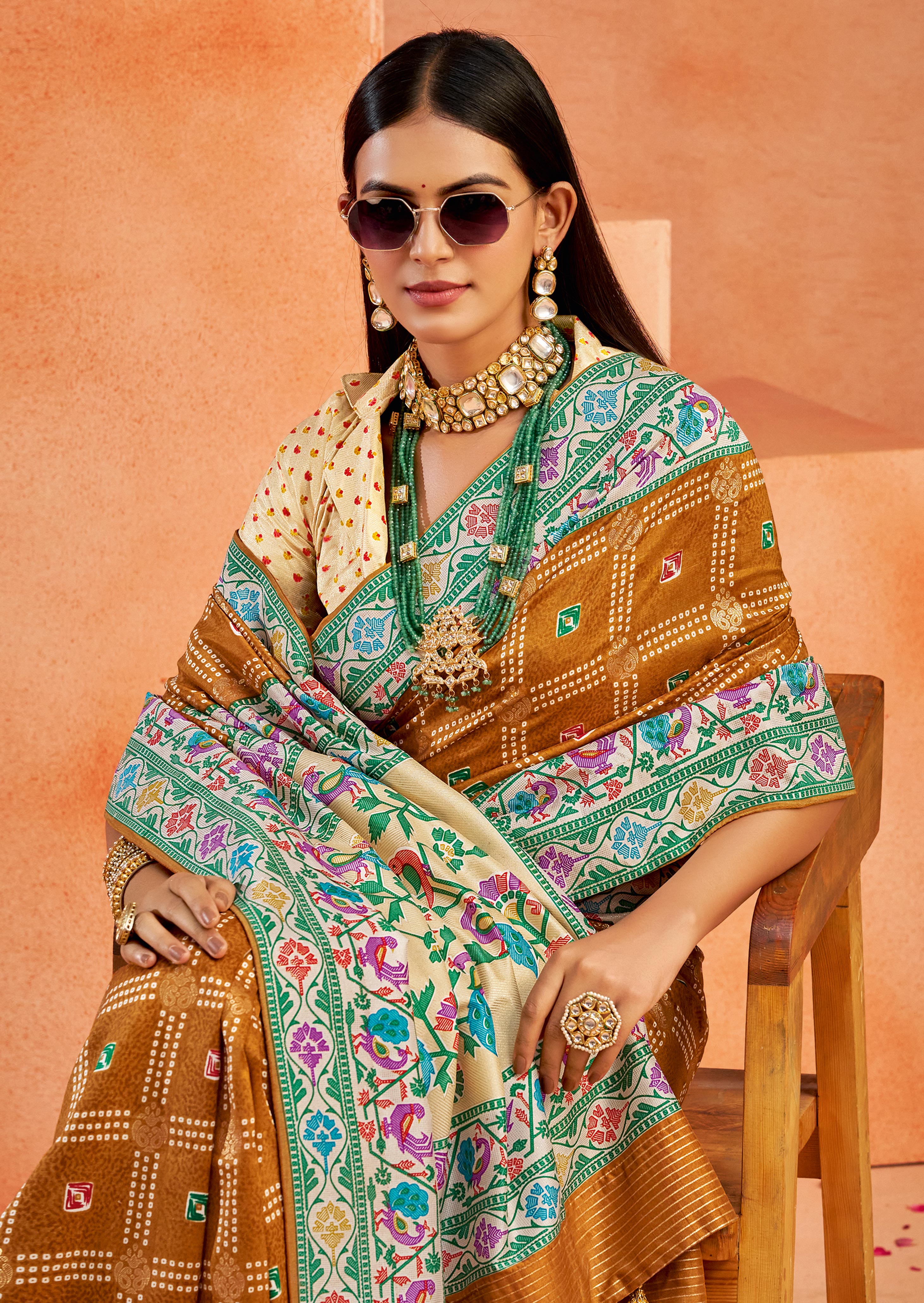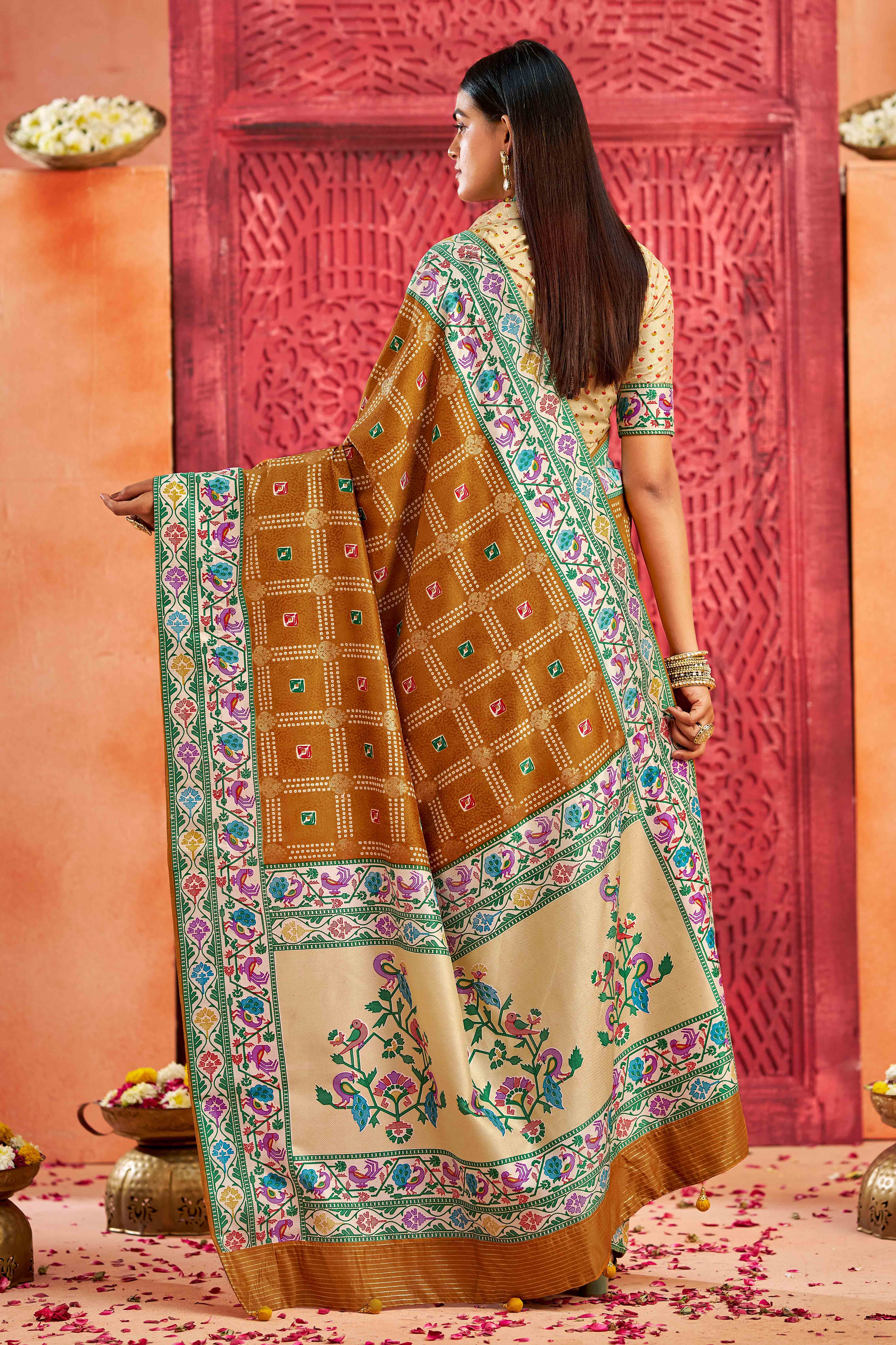 Mustard Color Velvet Tussar Silk Fabric Partywear Saree With Paithani Pallu And Traditional Ghatchola Print