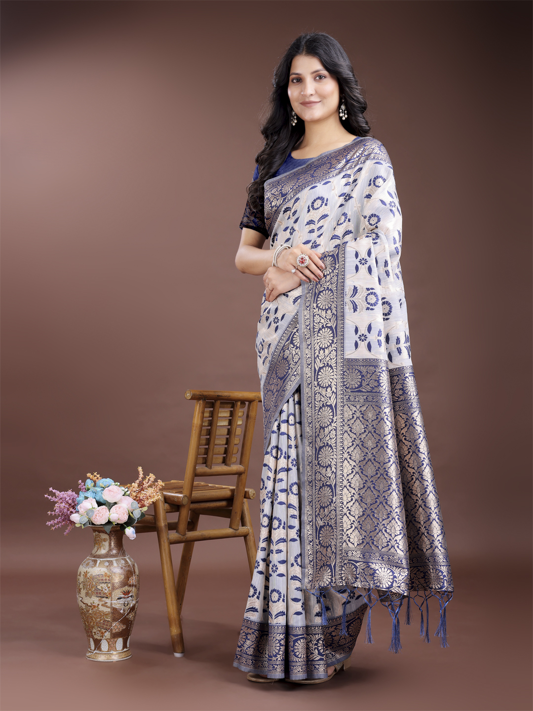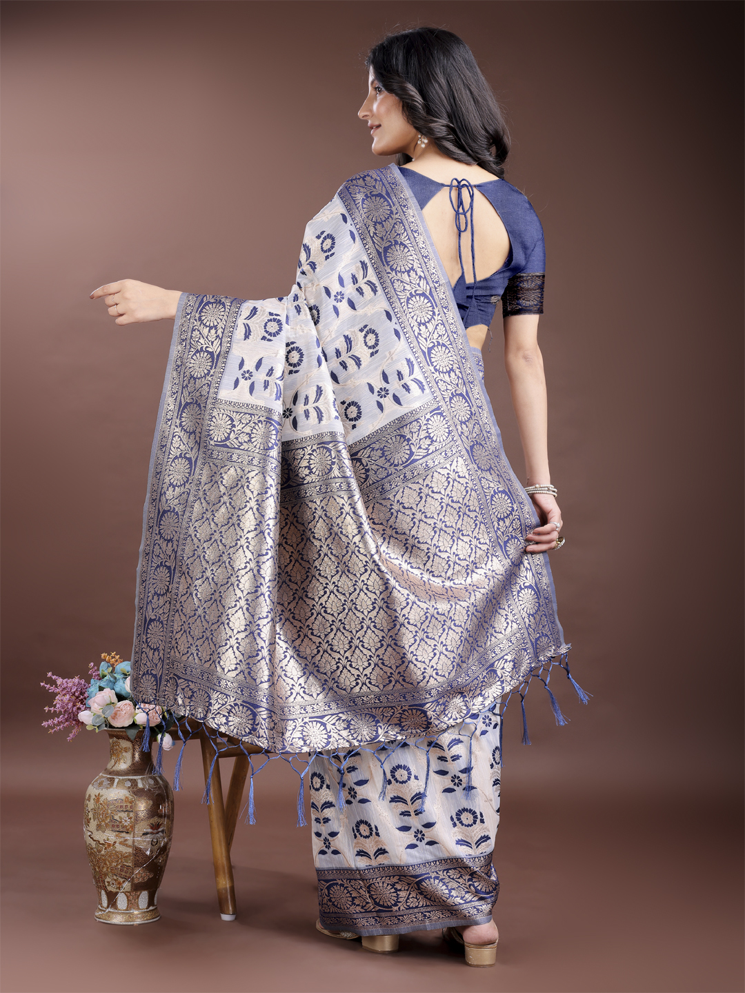 Navy Blue Color Linen Cotton Wevon Jacquard Designer Beautiful Festive Saree
