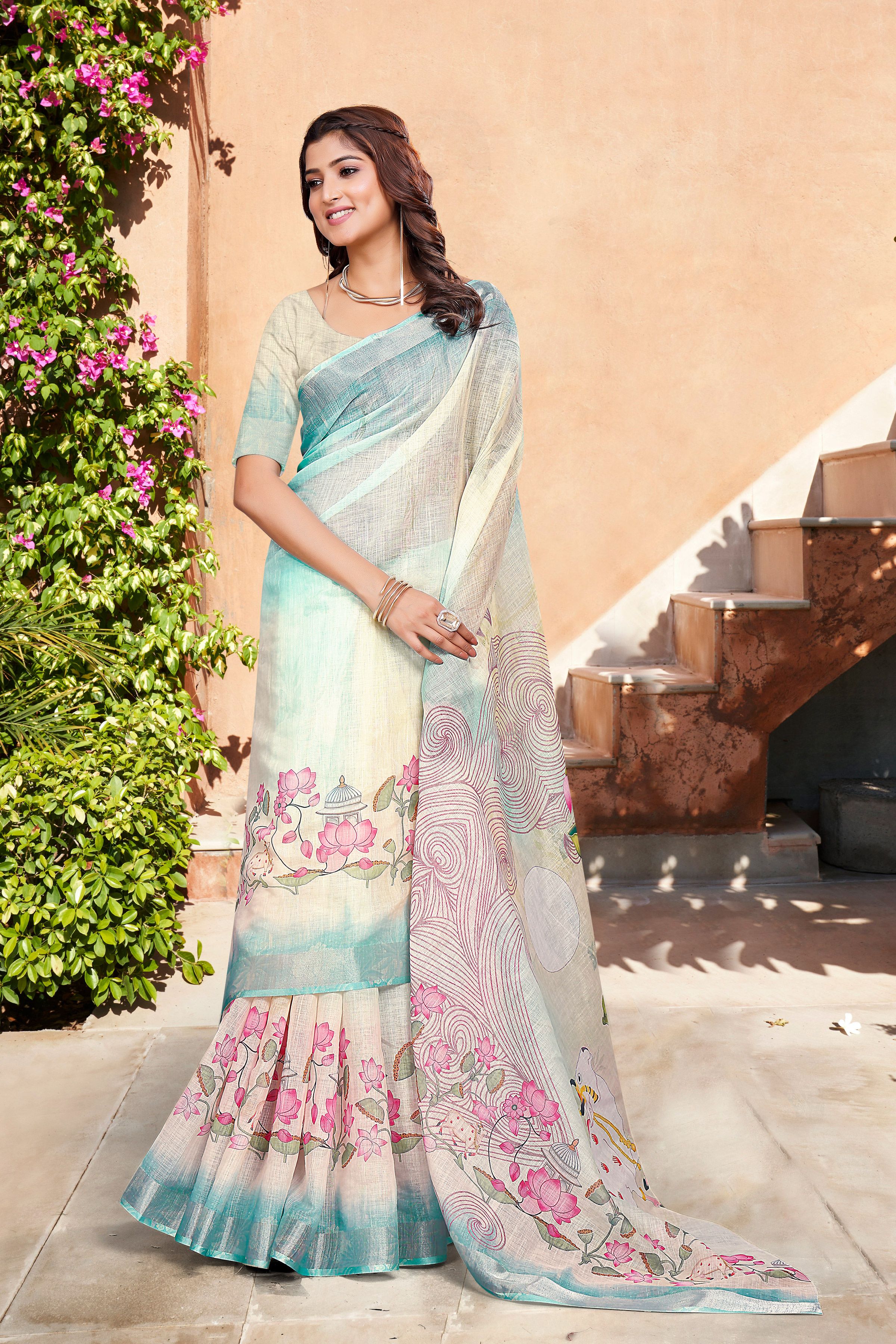 Garb These Festive Saree in Fine Colored.These Saree Are Linen Cotton And Blouse is Fabricated On Linen Cotton Pair.Its Beautified With Wevon Jari Border With Designer Digital Printed.