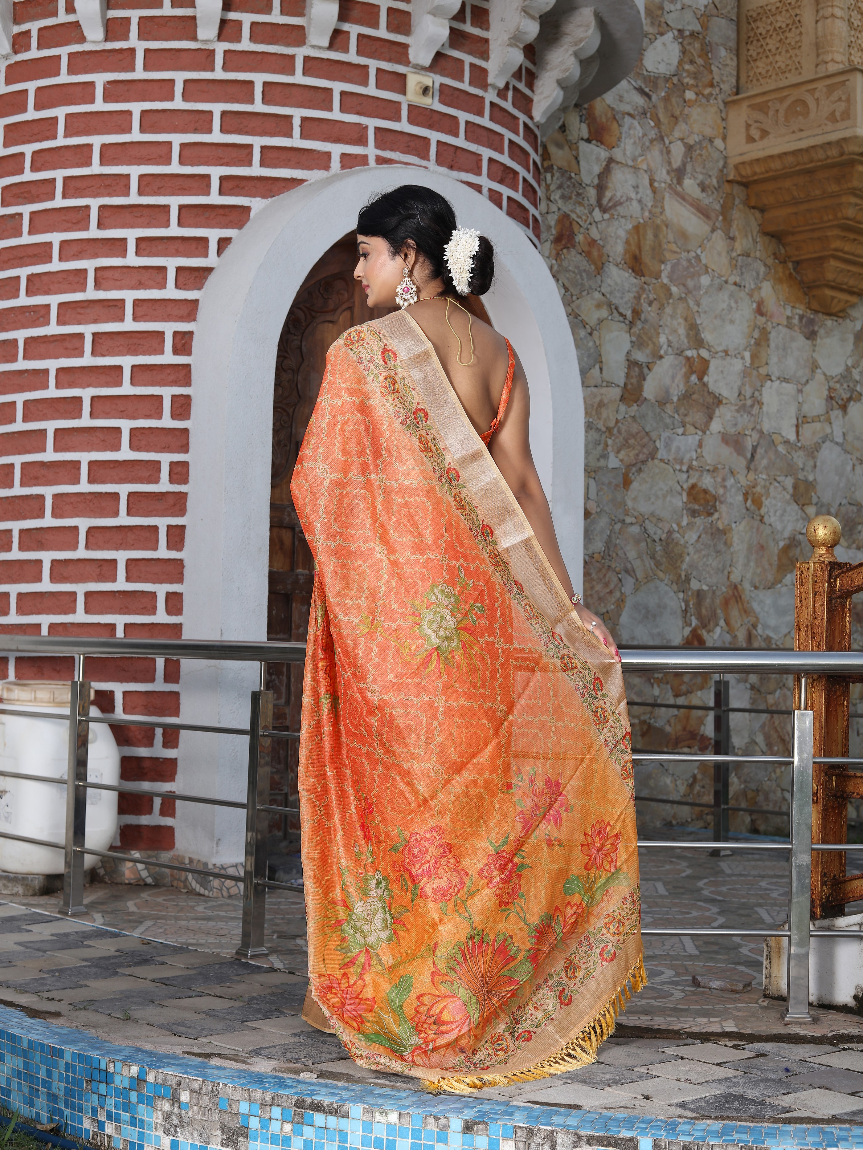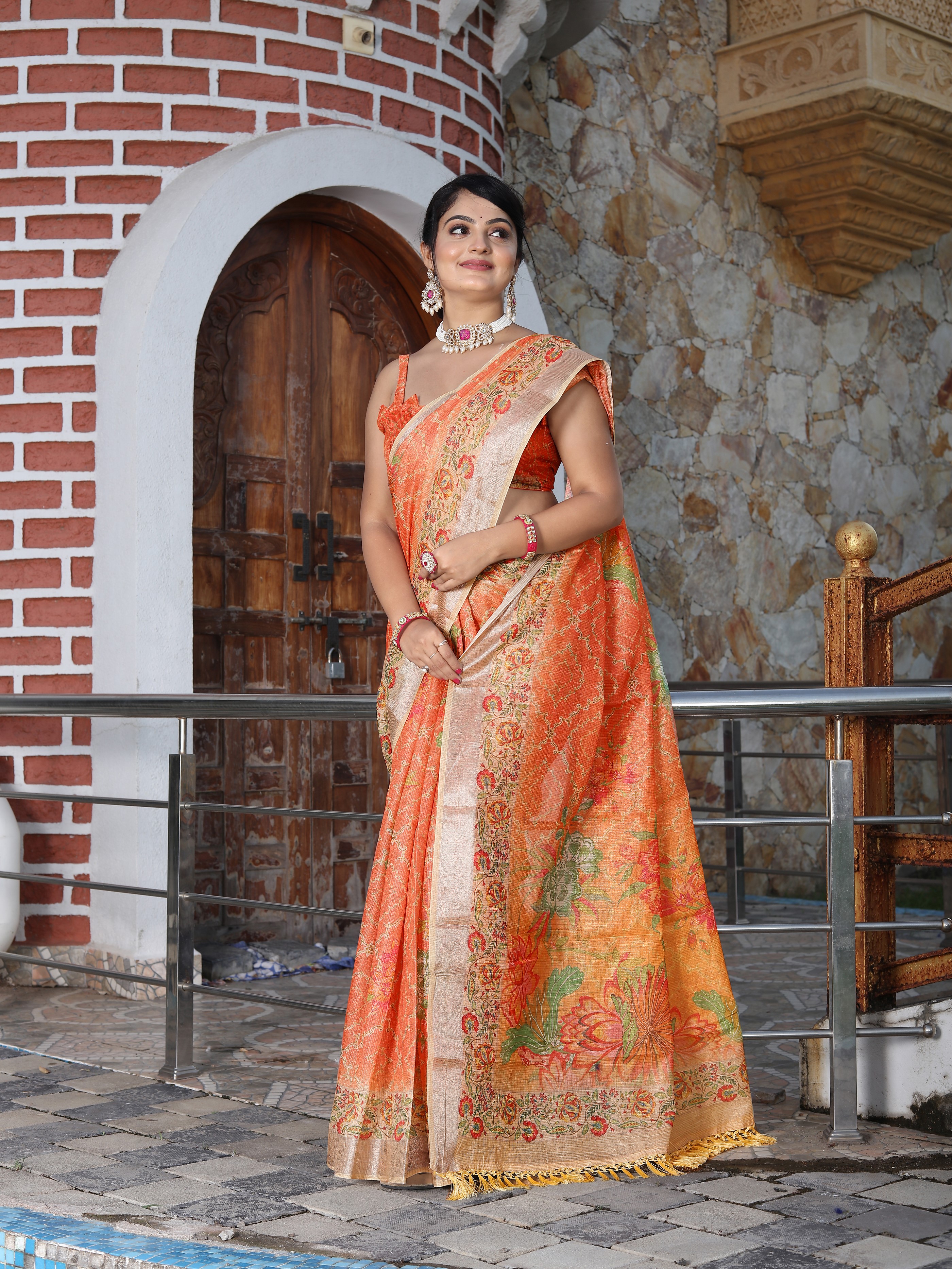 Orange Color Cotton Shimmer Fabric Smart Printed Saree With Woven Border